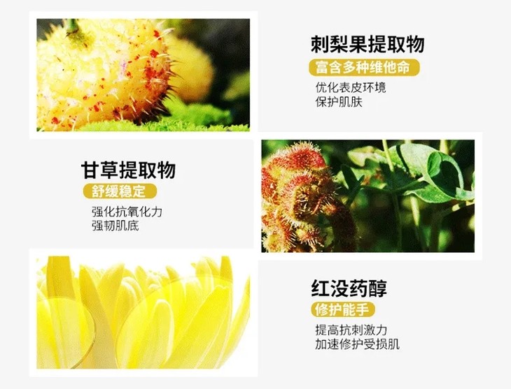 刺梨果+甘草+红没药醇提取物。这三大植物成分,可以有效地舒缓镇定日晒肌肤,使其维持健康水润,保护肌肤健康。