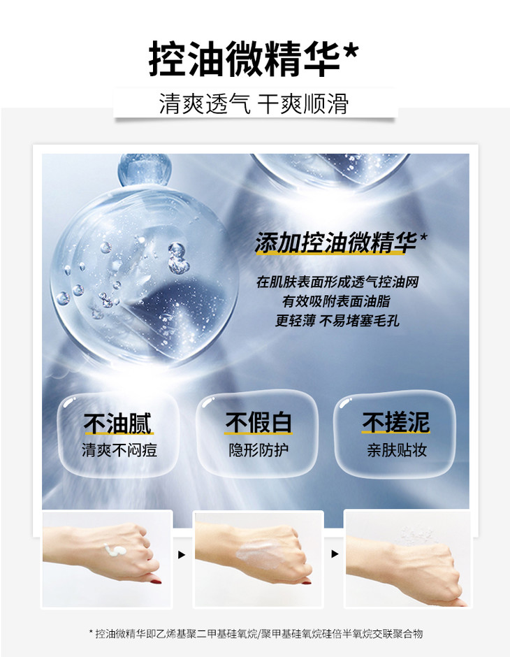为了避免这个问题,润百颜在这支防晒里添加了控油微精华(就是:乙烯基聚二甲基硅氧烷/聚甲基硅氧烷硅倍半氧烷交联聚合物)足量使用后,整体依旧非常清爽。