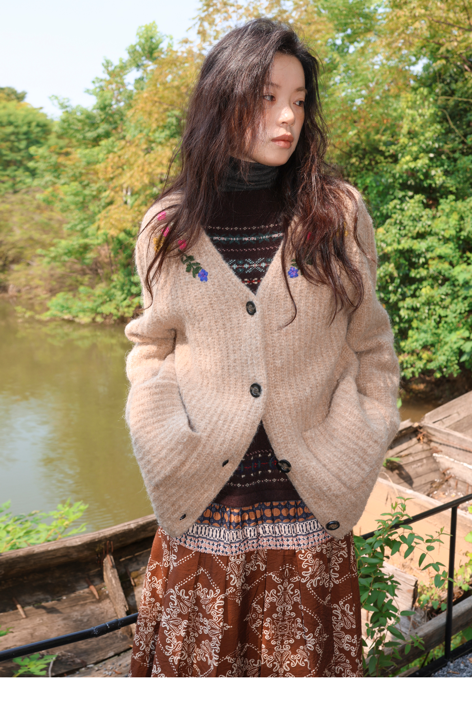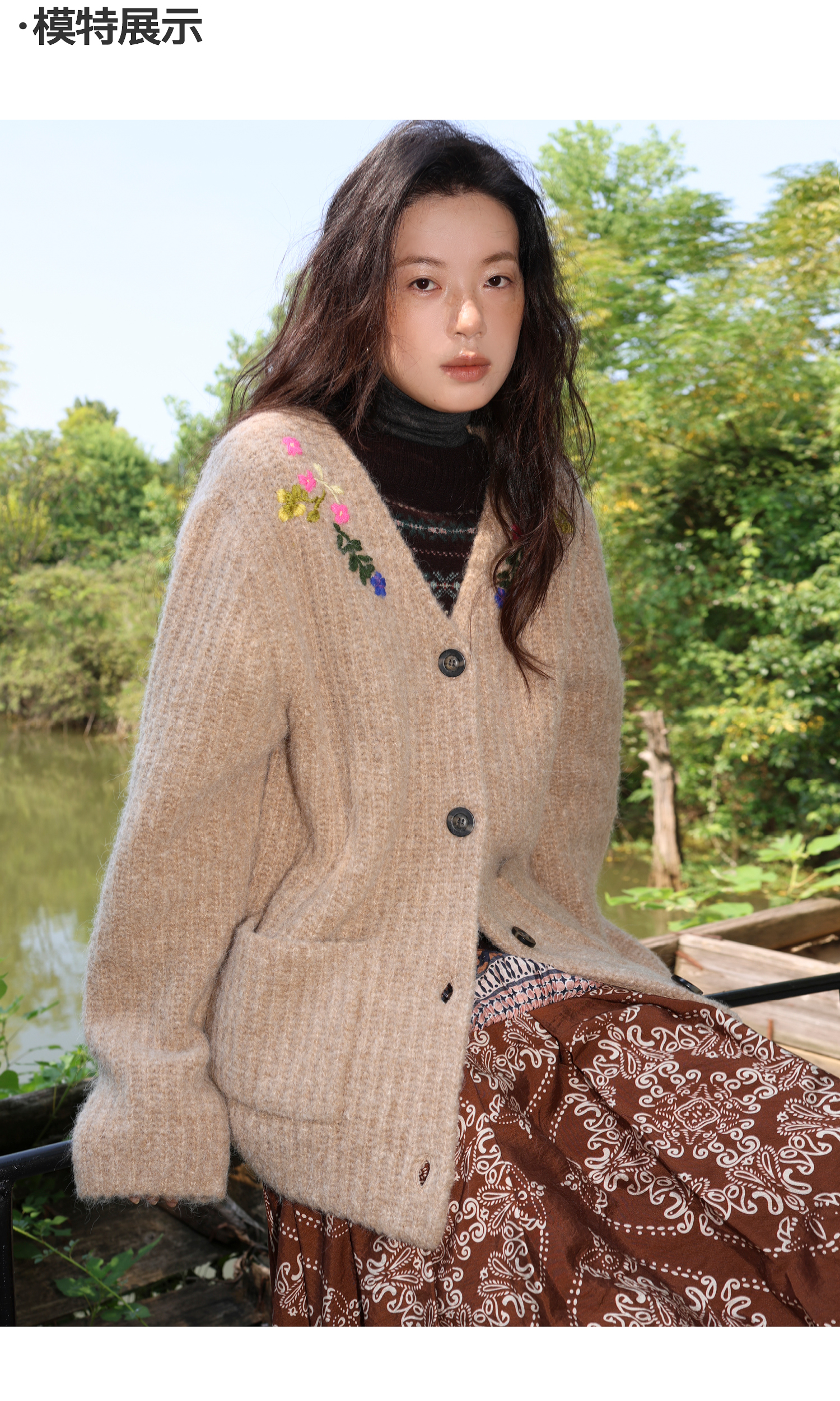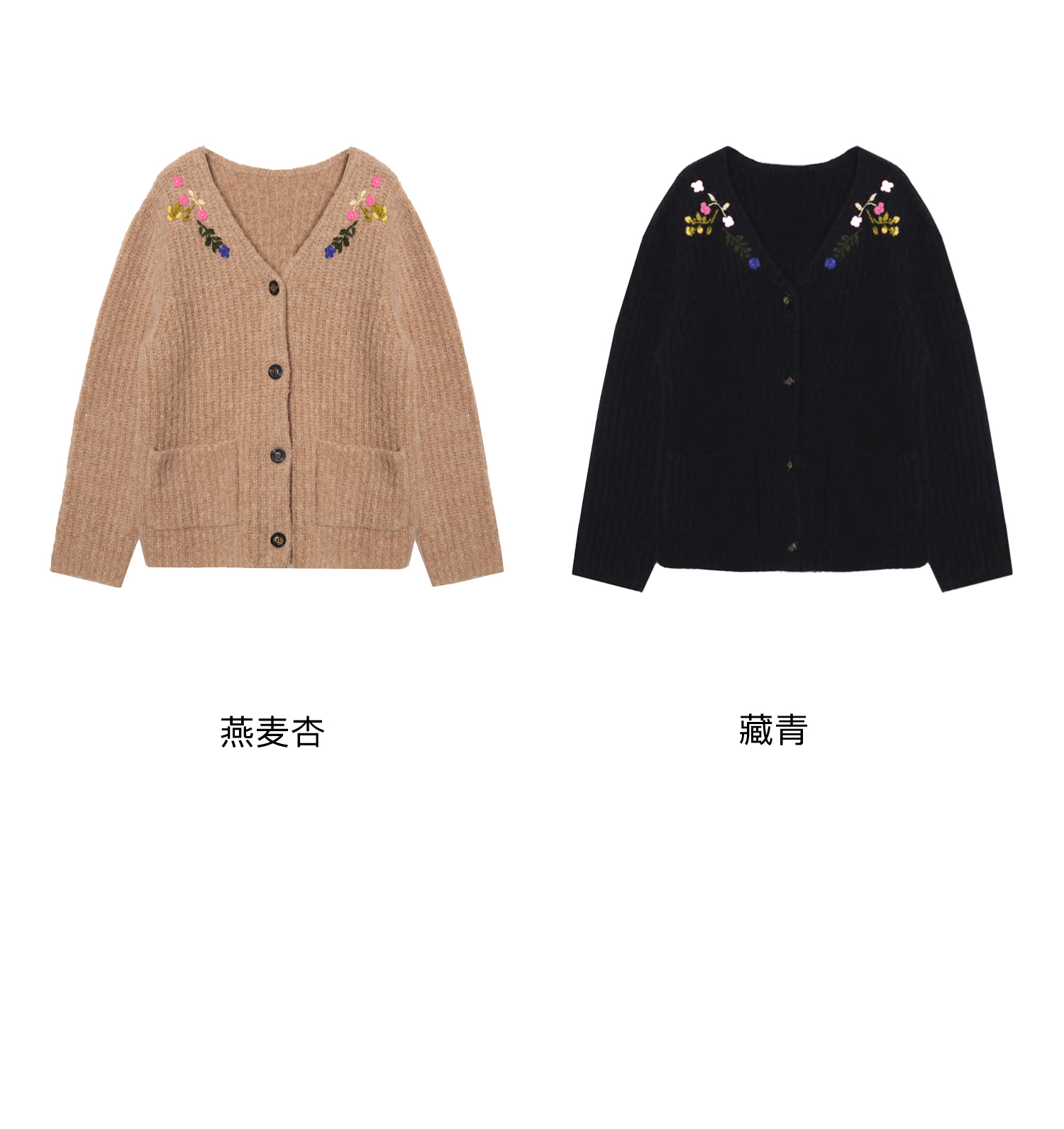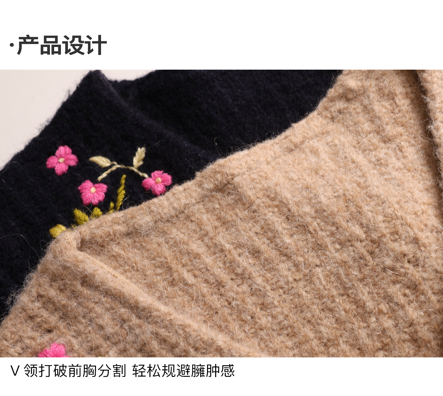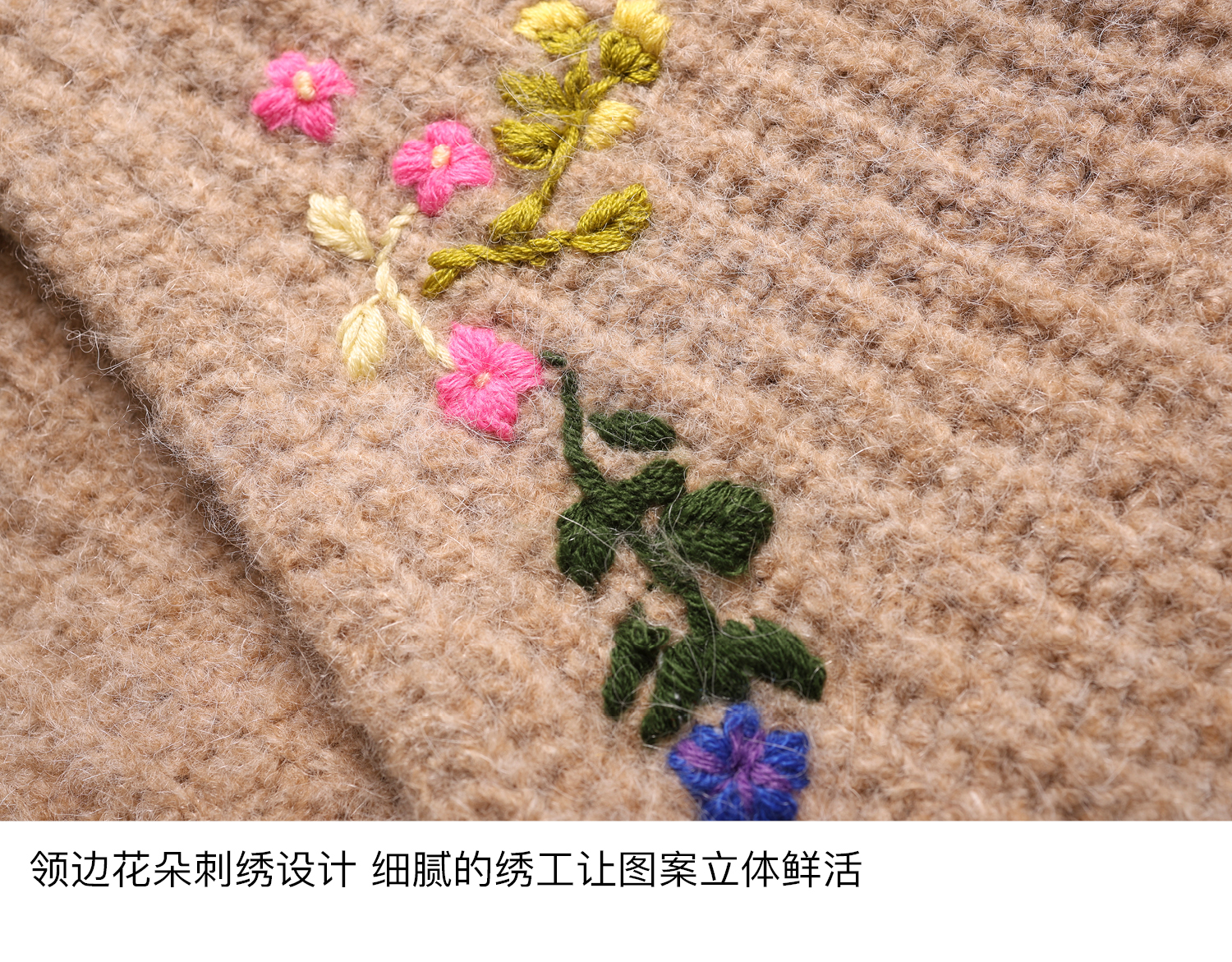 素舶 羊驼毛柔软亲肤撞色手工刺绣花朵粗针宽松针织开衫毛衣