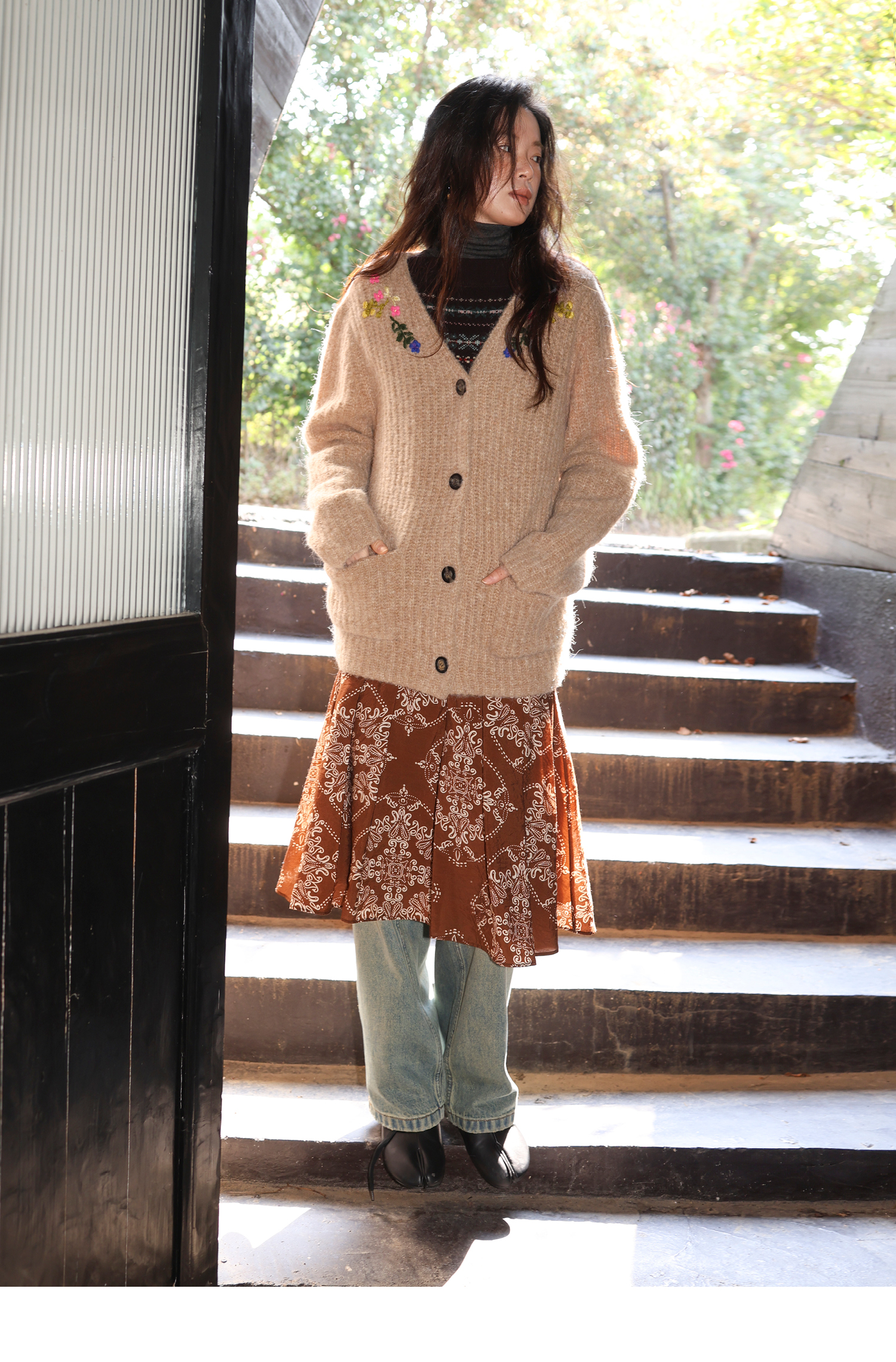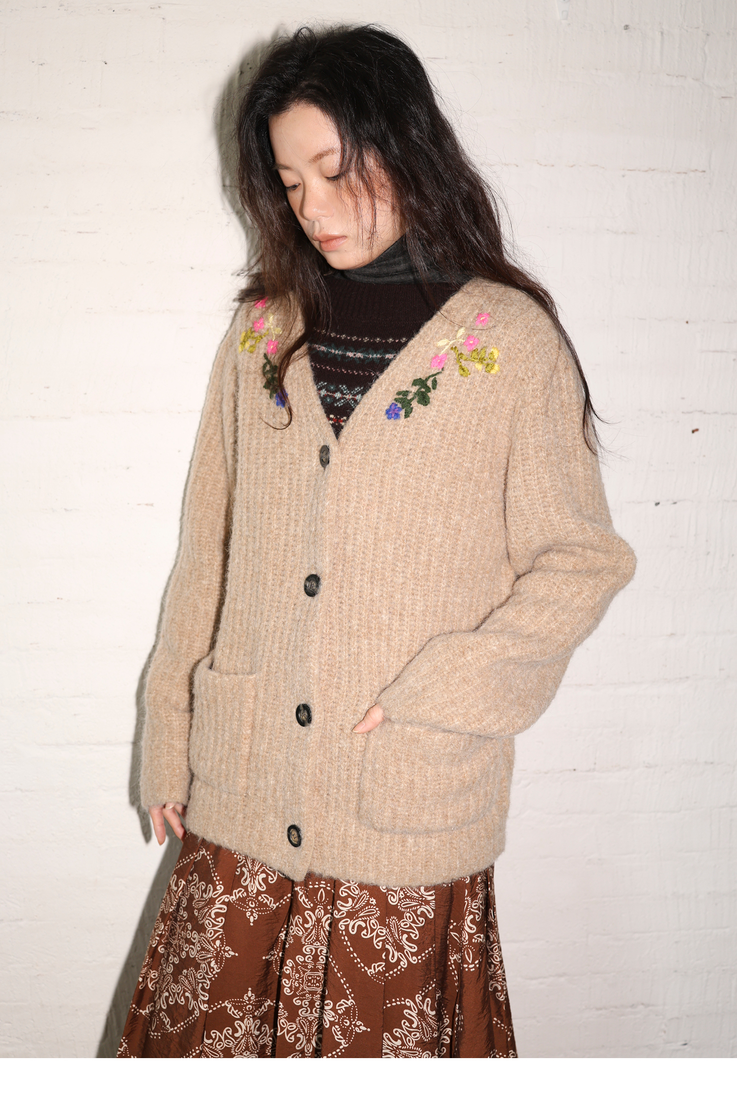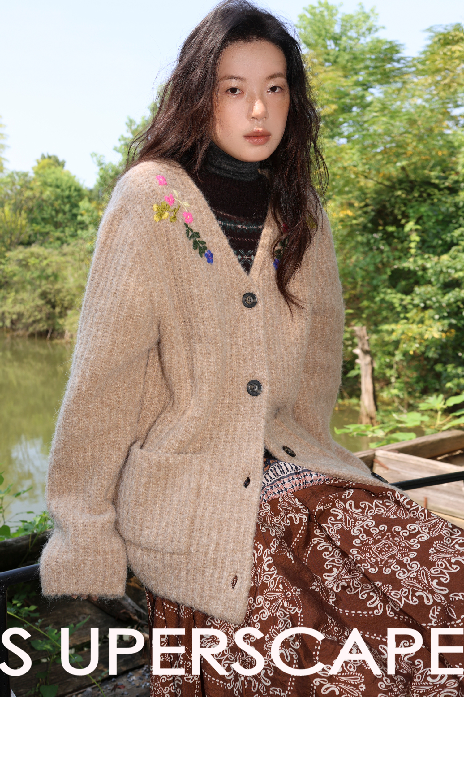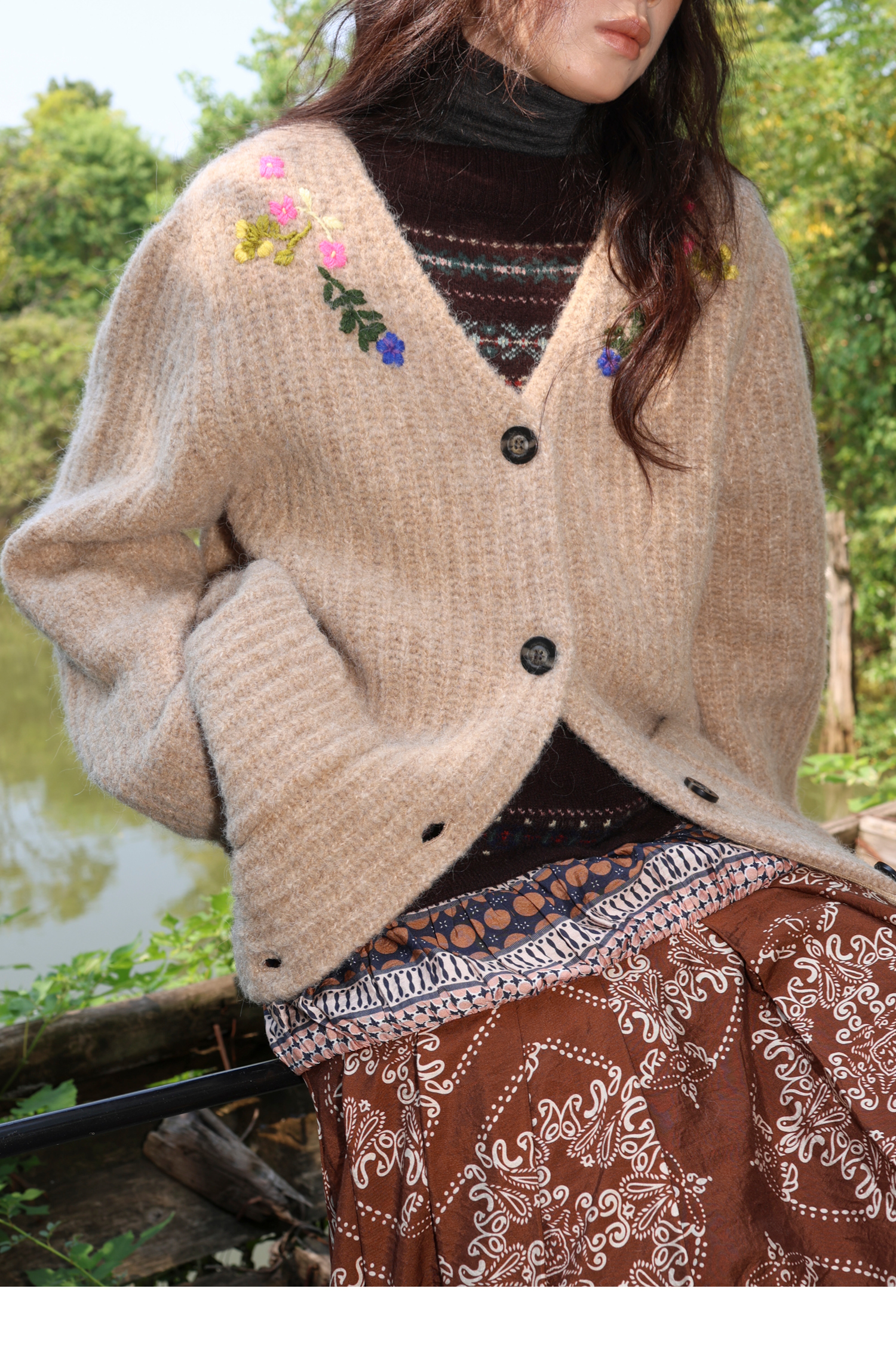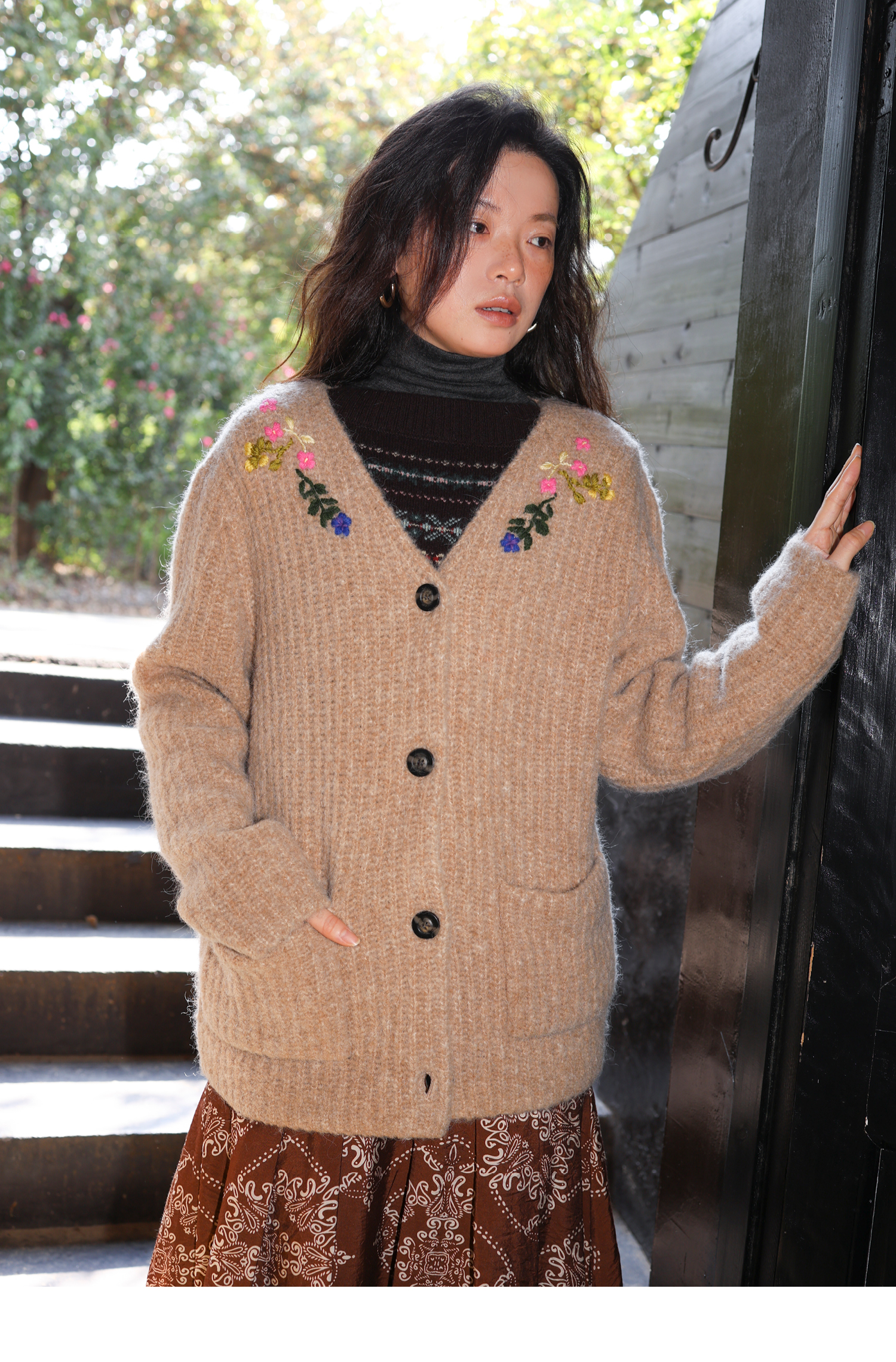 素舶 羊驼毛柔软亲肤撞色手工刺绣花朵粗针宽松针织开衫毛衣