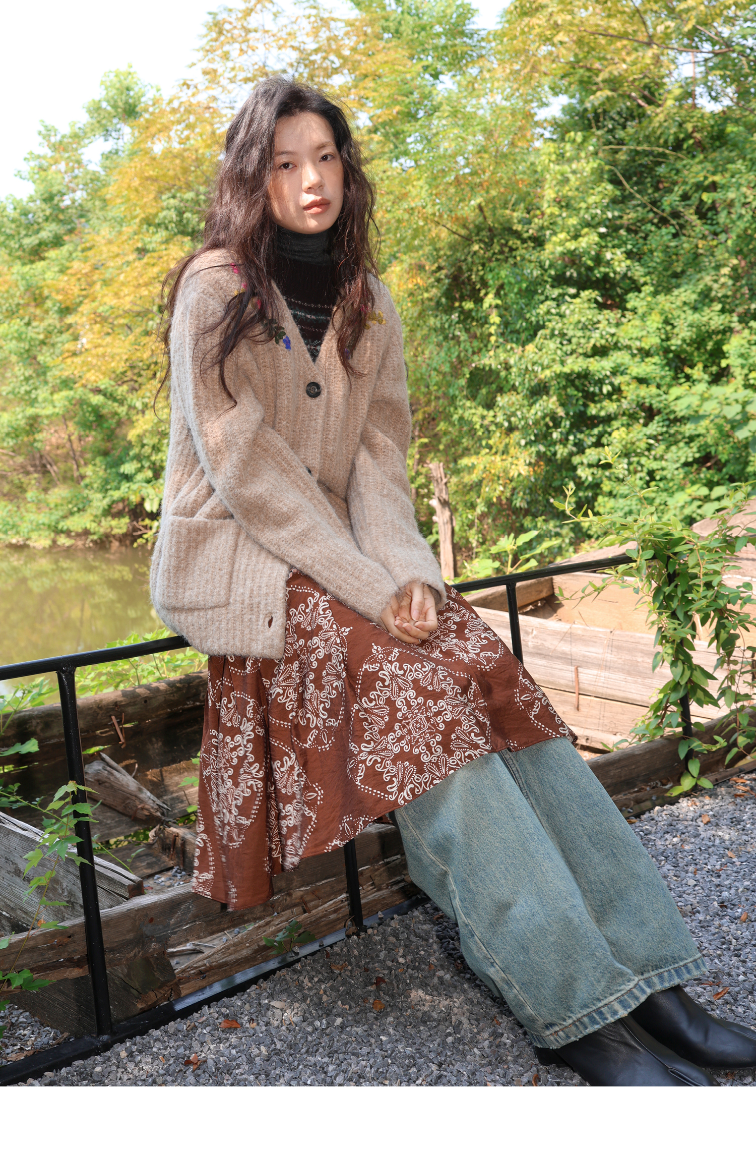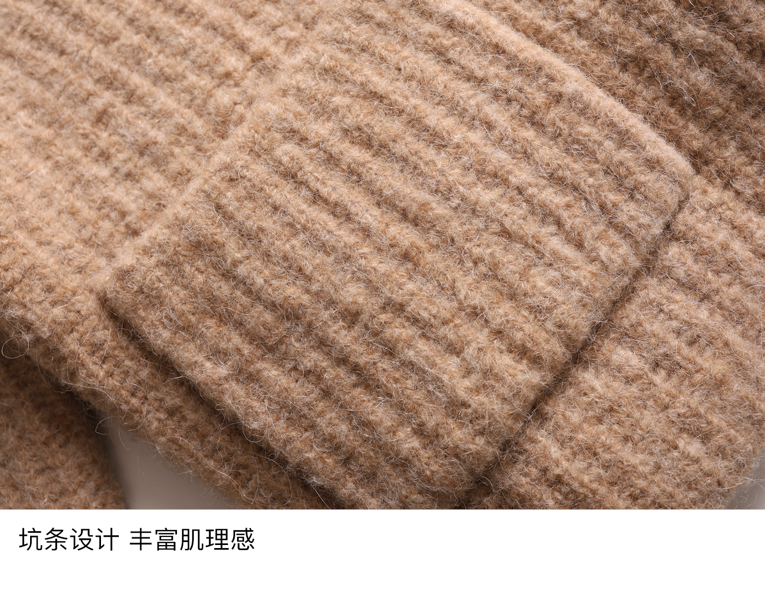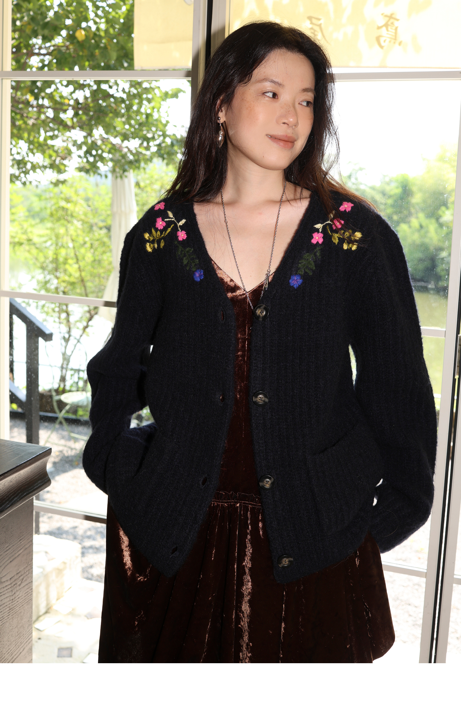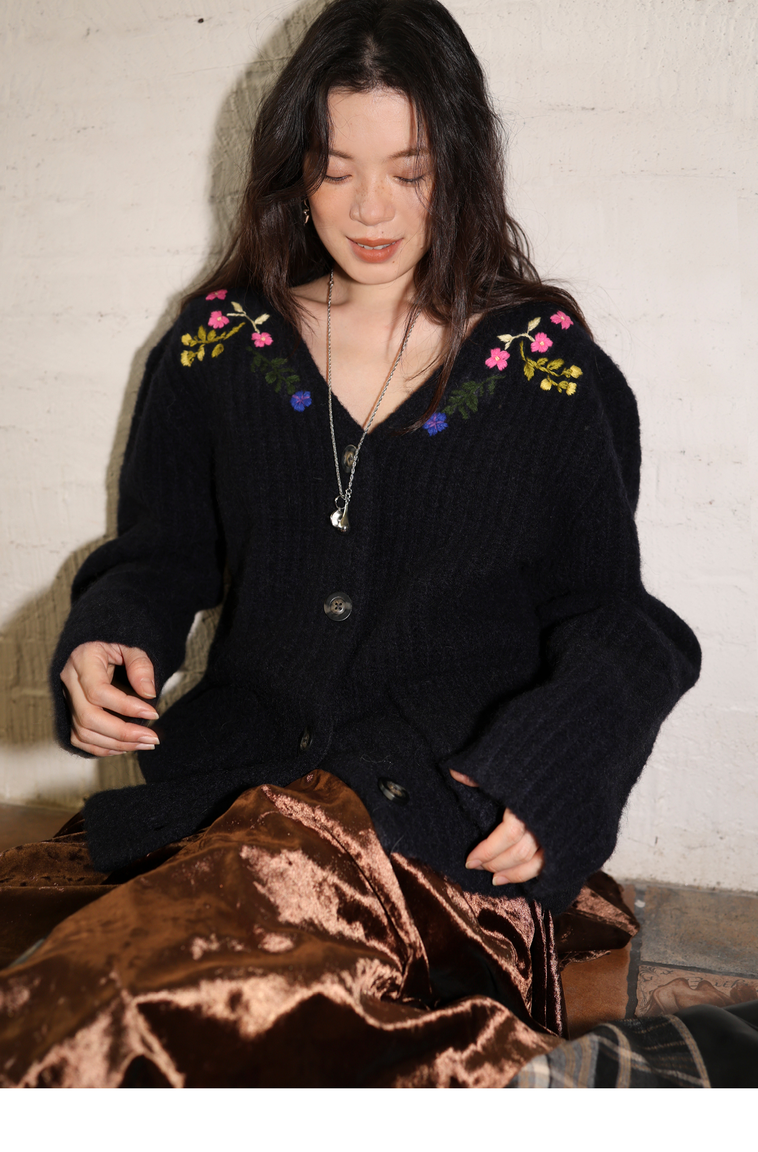 素舶 羊驼毛柔软亲肤撞色手工刺绣花朵粗针宽松针织开衫毛衣