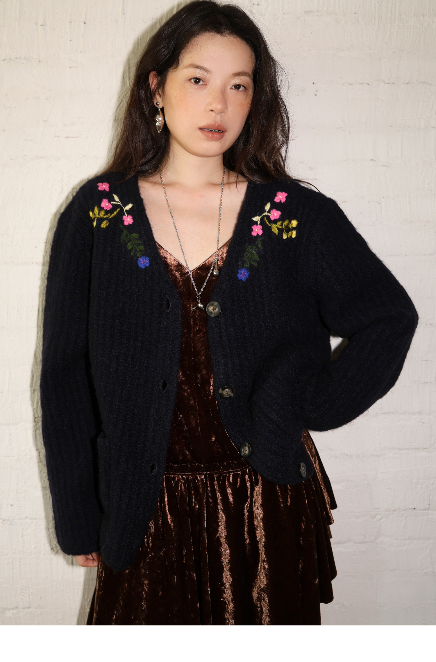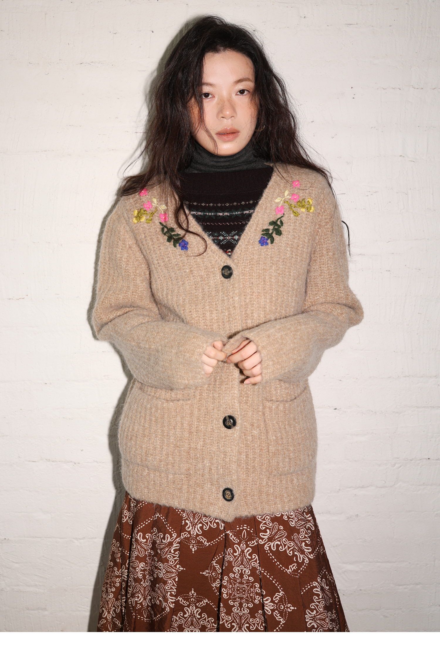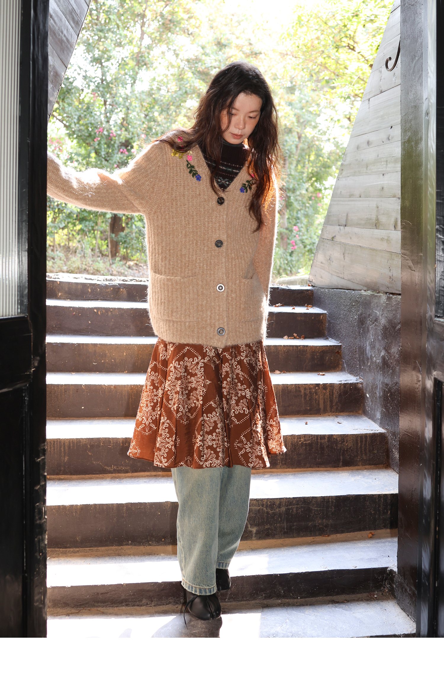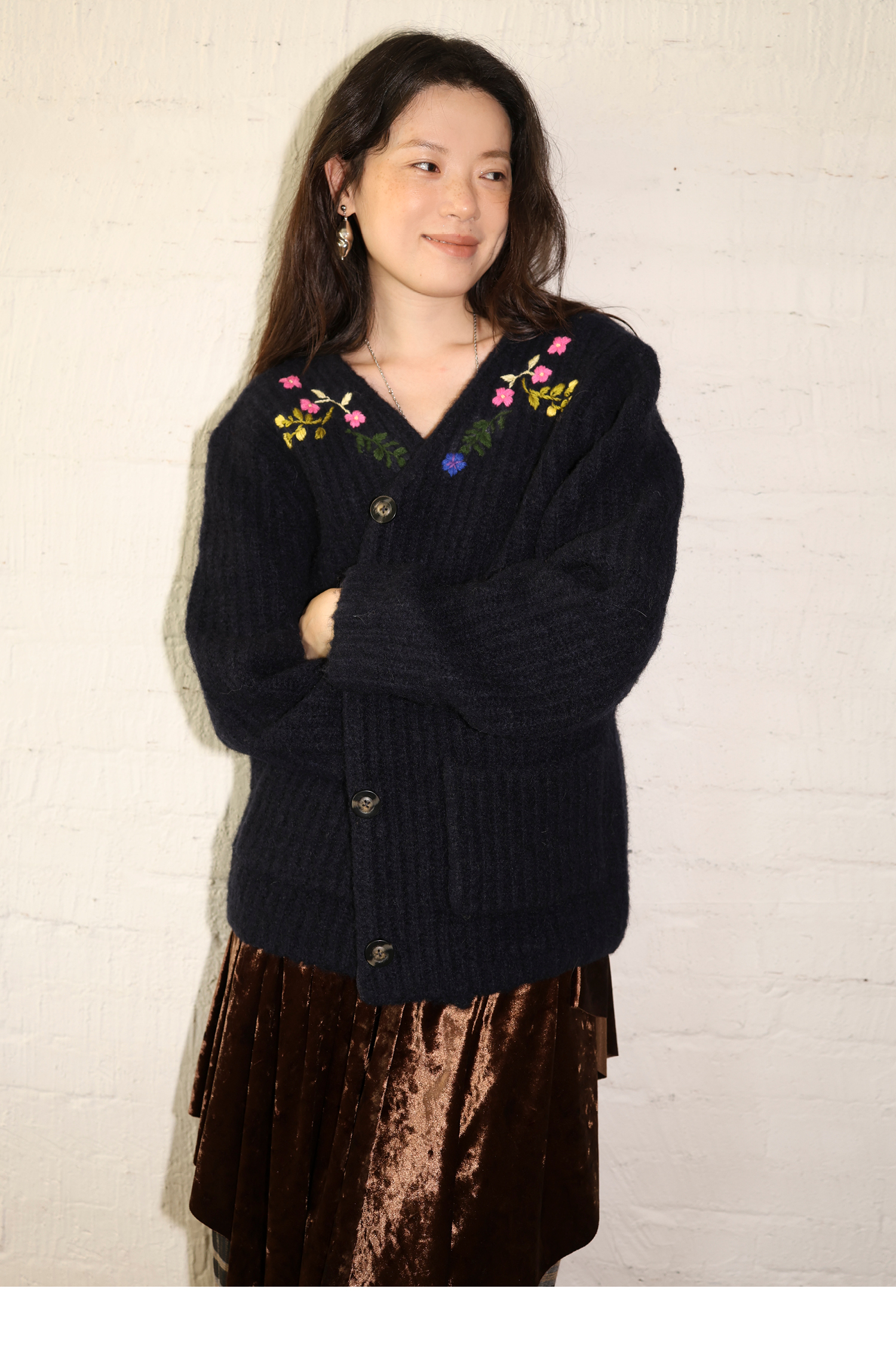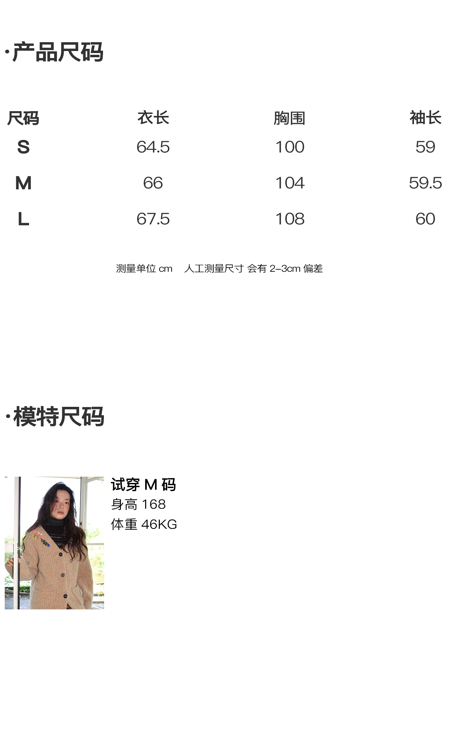 素舶 羊驼毛柔软亲肤撞色手工刺绣花朵粗针宽松针织开衫毛衣