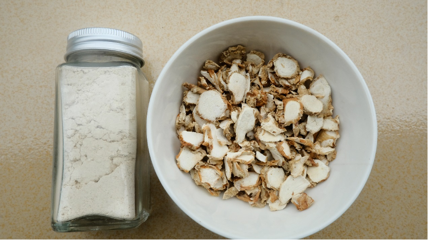 沙姜还有另外一个名字是山奈,可以入药,也是制作卤水的原料之一。因此我们也烘干了一部分,做成了沙姜片,还有沙姜粉。