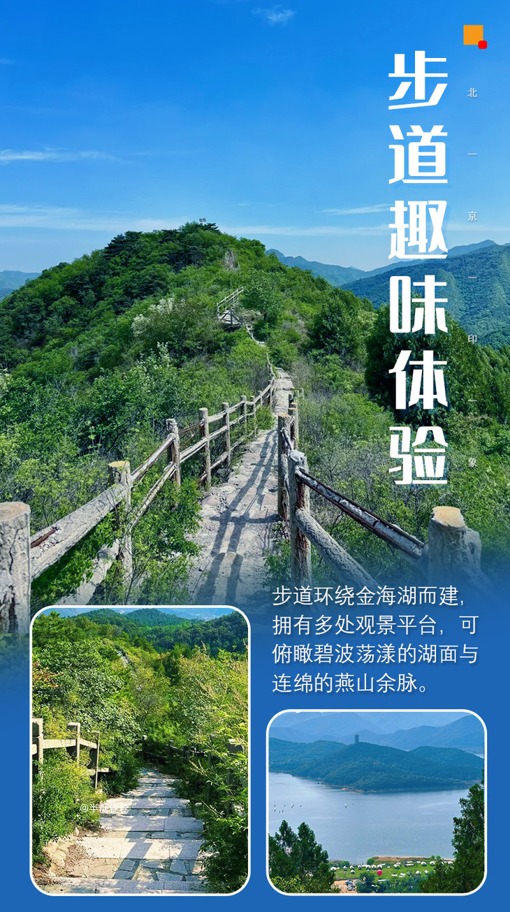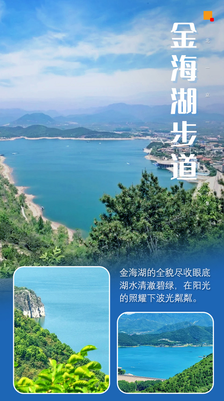 金海湖登山徒步栈道,领略不一样的金海湖。金海湖栈道沿环湖计划21公里岸线修建临水栈道及观景平台,登顶后能俯瞰湖区全貌,一览“小千岛湖”的秀美风光。金海湖风景区位于平谷区以东15公里,距北京85公里,水域面积6.5平方公里。有“小北戴河、小麦理浩径”之称,碧蓝的湖水在阳光下闪闪发光;绝美的日落,夕阳西下,身处金黄色的世界。是北京的综合水上娱乐场所,现在是市级风景名胜区和市级旅游胜地。