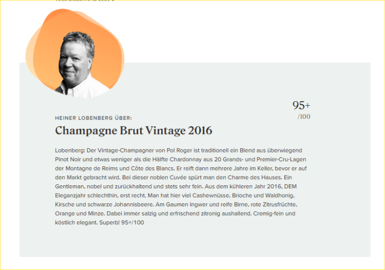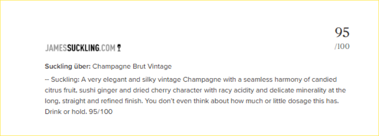 “来自Reims山和白坡20个特级园和一级园,在这个高贵的年份中可以感受其魅力。高贵内敛,精细美妙,2016被称为优雅之年。大量腰果、法式吐司、森林蜂蜜、樱桃和黑刺李。余韵中有姜、雪梨、红色柑橘、橙子和薄荷,始终带有咸柠檬的清新,丝滑优雅。”