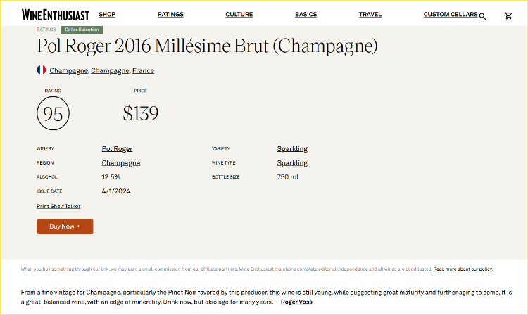 4个95高分!英国皇室御用香槟 高端 宝禄爵天然型年份香槟 Pol Roger Vintage 2016