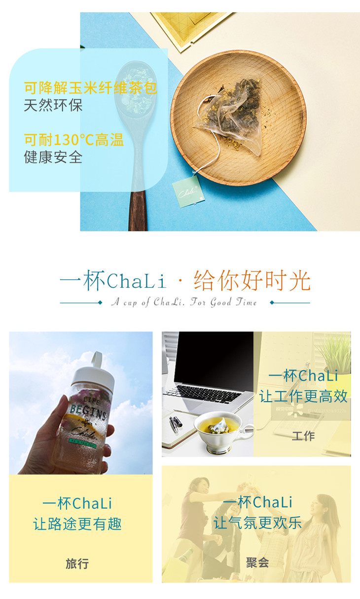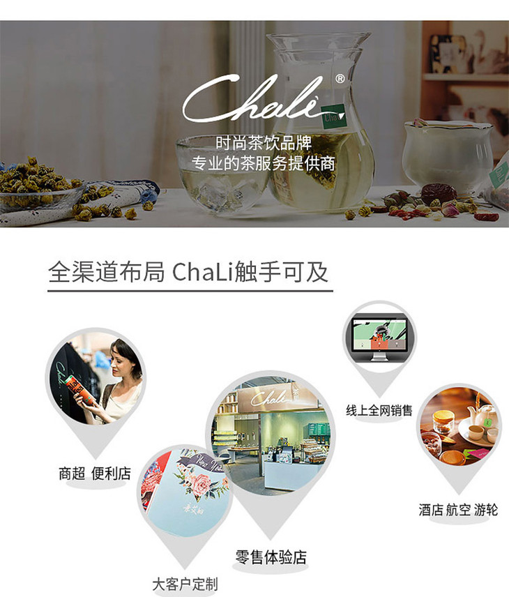 ChaLi茶里是中国袋泡茶第一品牌。坚持做本味中国茶。希望可以让客人在快节奏的生活中,撇除掉繁琐的茶道冲泡工序,用最简单方便的方式品尝到最传统的茶味。