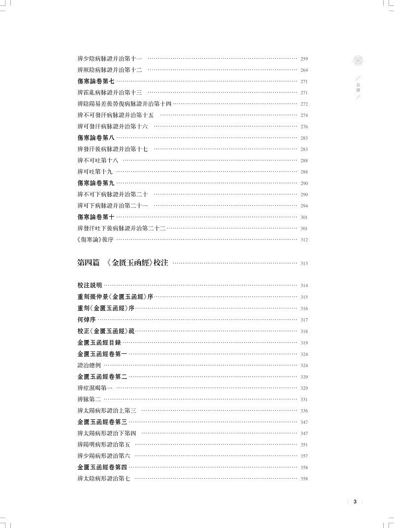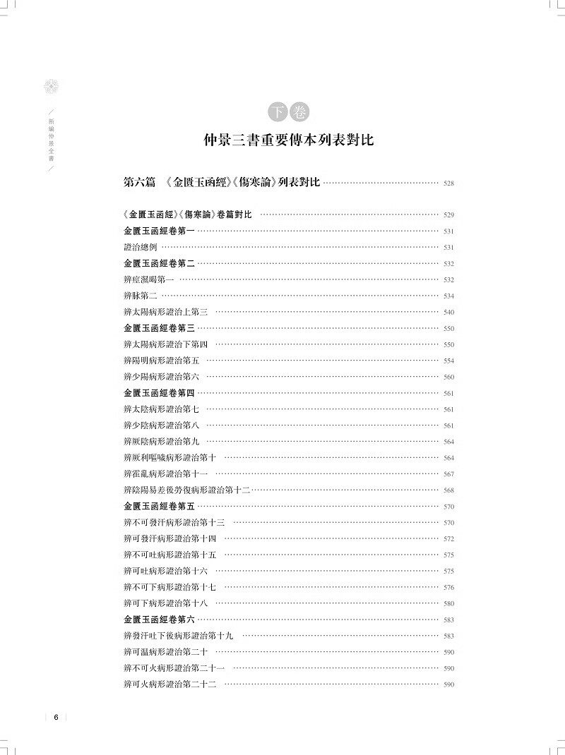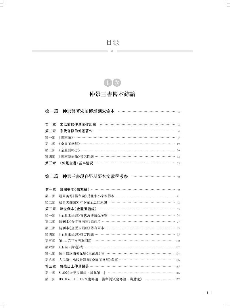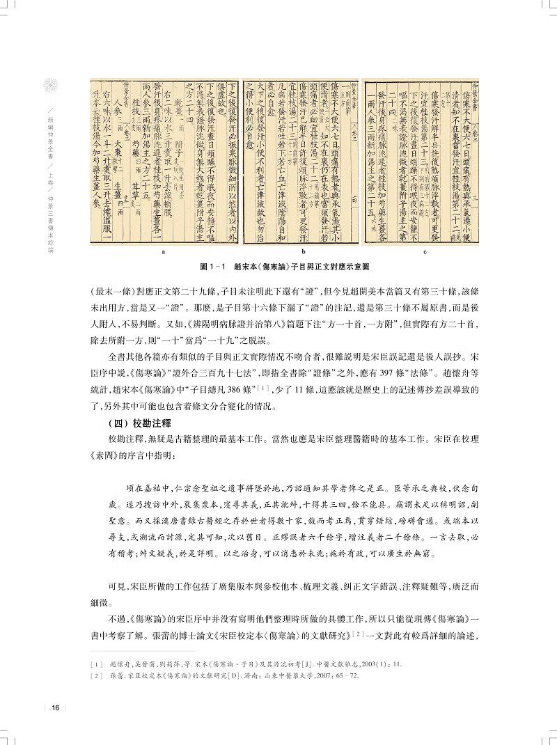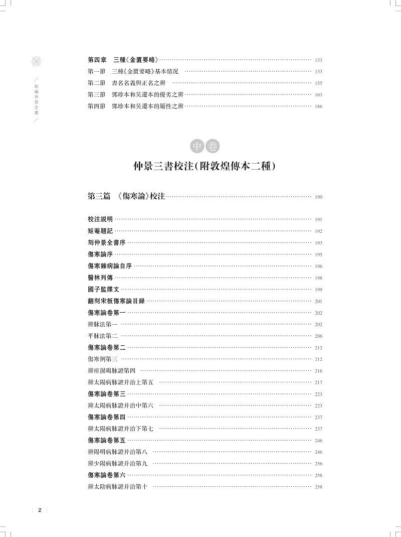 张仲景医著历史上曾分离为多种不同主题的医书,也有多种传抄本。北宋治平年间,校正医书局校理成三部书《伤寒论》《金匮玉函经》《金匮要略方》,其中的《伤寒论》和《金匮要略方》两部书成为中医必读之书,而《金匮玉函经》则较长时间失传。明代万历年间,赵开美编修《仲景全书》,收入了其中的前两部,为后世研读张仲景著作,留下了珍贵的经典文献。本书主要从三个方面对张仲景著作在宋以后的传承的主要状况展开了研究:第一,深入研究和论述了赵本《伤寒论》、清康熙年间新问世的《金匮玉函经》、当代新发现的两种《金匮要略》本子的传承情况,从而更清晰地把握了仲景三书各本的属性,加深了对三书传本的认识。第二,对仲景三书(其中的《金匮》选用了吴迁抄本)以及相关的两个敦煌残卷作了新一轮校注,在吸取前人高论的基础上,也有不少作者团队的新研究、新发现。第三,对《伤寒论》和《金匮玉函经》《金匮要略》三种传本作了对比列表研究,从而可以看出两组文献中每个细节的差别,更全面地把握仲景著作。全书以文献研究为中心,通过仲景三书的系统把握和全面研究,厘清了许多原先未得其详的疑难问题;在条文和字词的理解方面,也有了一定推进。