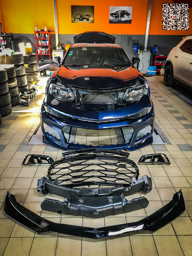由于第六代科迈罗ZL1的车身宽度与2.0/V6/SS的宽度不一致,所以原厂ZL1前杠无法直接安装,本产品为原厂PP材质,专门针对2.0的车身宽度开发(V6和V8也可以安装),可以直接安装替换,非常方便,吻合度完美。