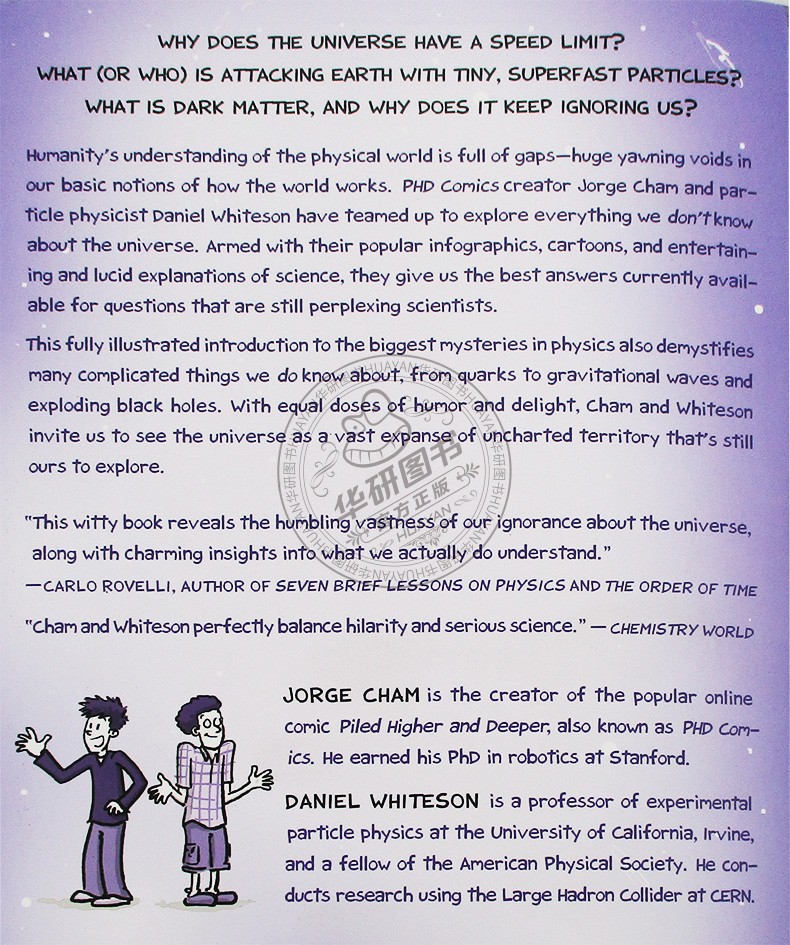 Humanity's understanding of the physical world is full of gaps. Not tiny little gaps you can safely ignore --there are huge yawning voids in our basic notions of how the world works. PHD Comics creator Jorge Cham and particle physicist Daniel Whiteson have teamed up to explore everything we don't know about the universe: the enormous holes in our knowledge of the cosmos. Armed with their popular infographics, cartoons, and unusually entertaining and lucid explanations of science, they give us the best answers currently available for a lot of questions that are still perplexing scientists, including: