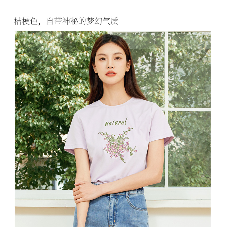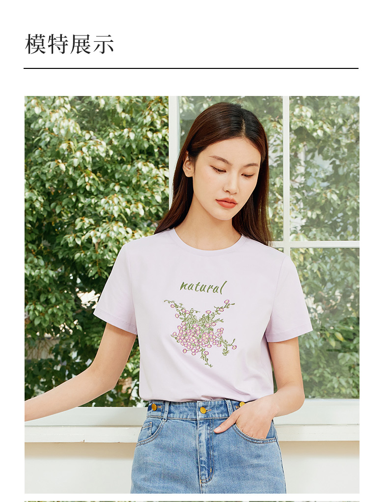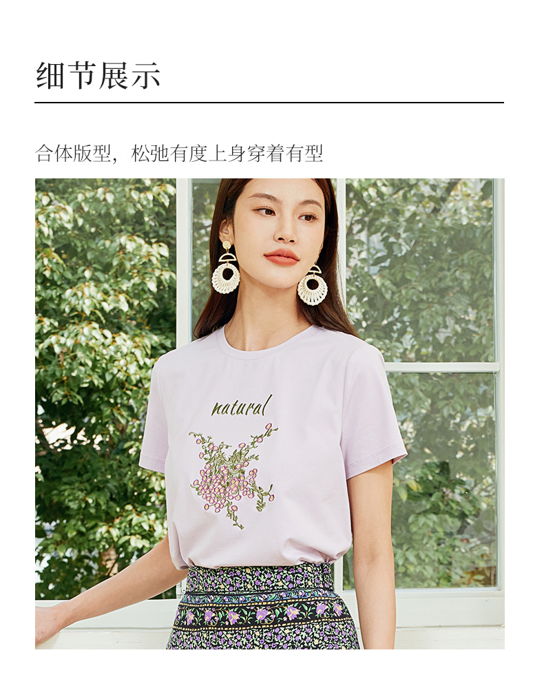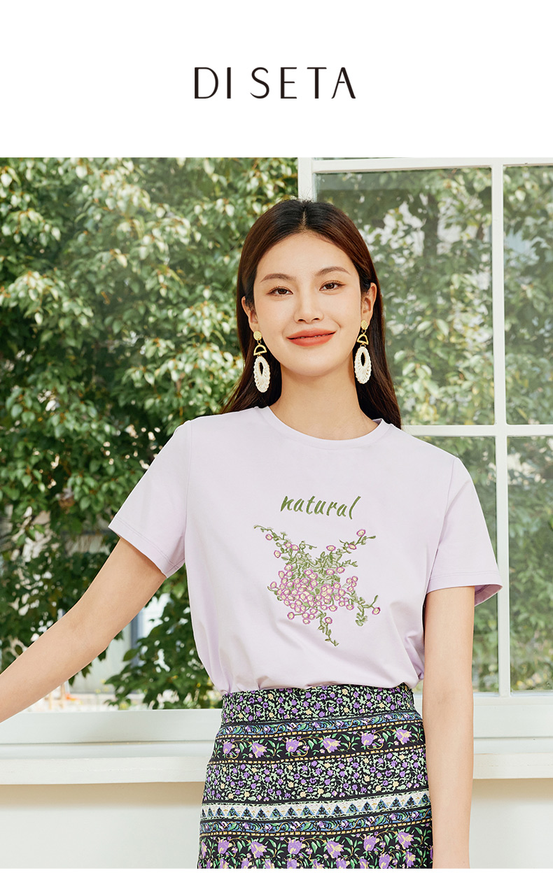 玳莎绣花印花设计感小众T恤女2024夏季新款优雅气质圆领短袖上衣 EB32104