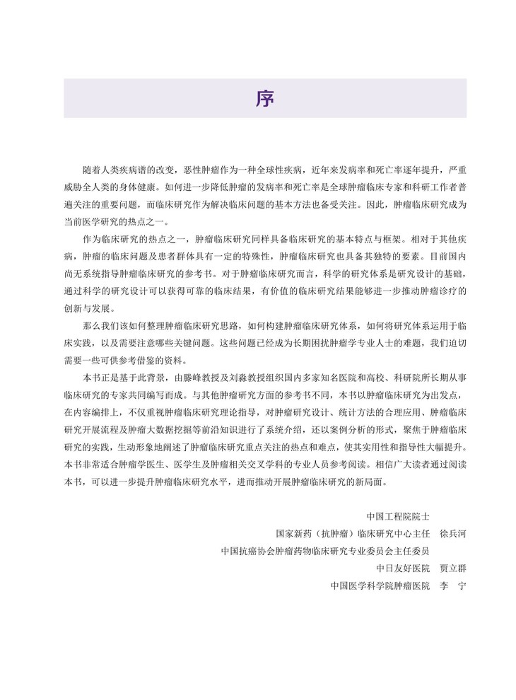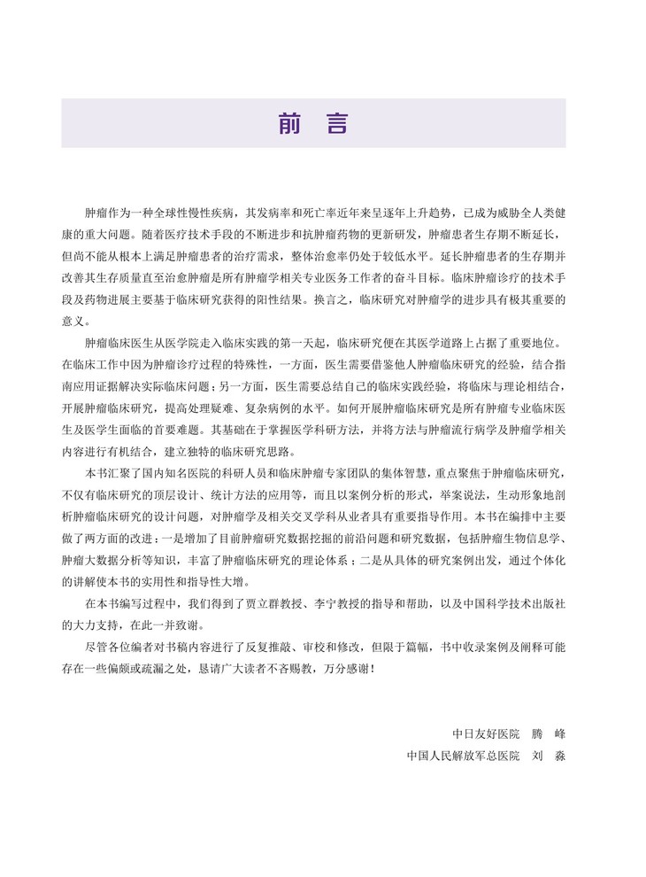 本书由多家知名医院长期从事临床研究的众多专家联合编写,从肿瘤临床研究理论指导与实践分享两个方面进行了论述。第 1 ~ 14 章为肿瘤临床研究理论指导部分,分别从肿瘤研究设计、统计方法应用、肿瘤大数据研究等前沿方向,系统讲述了肿瘤临床研究的现状及未来发展方向。第 15 章为肿瘤临床研究实践分享部分,以案例分析的形式,生动阐释了肿瘤临床研究开展关注的热点和难点。本书既有全面的理论知识,又有实用的临床案例,适合肿瘤学相关专业医生及医学生参考阅读。