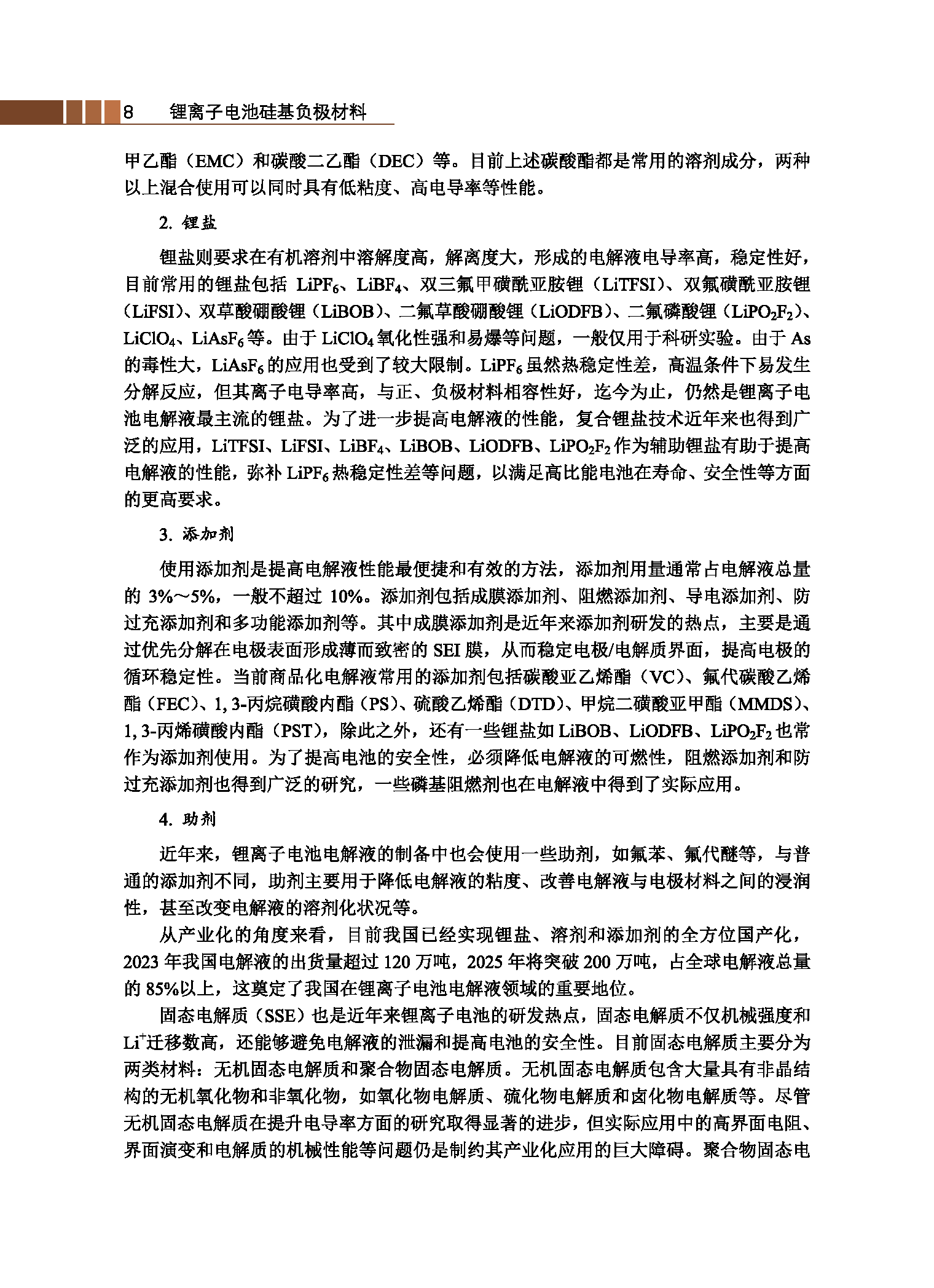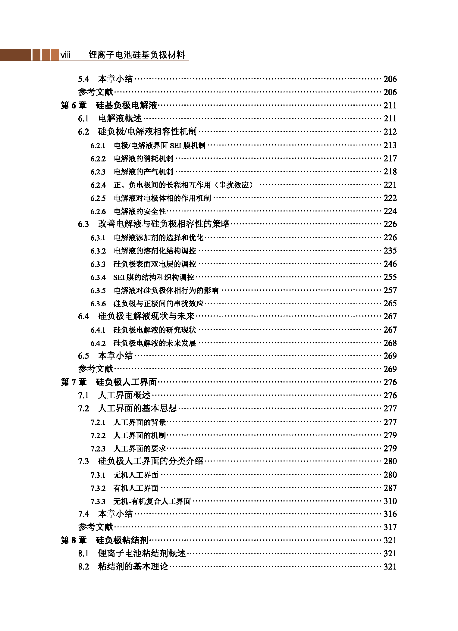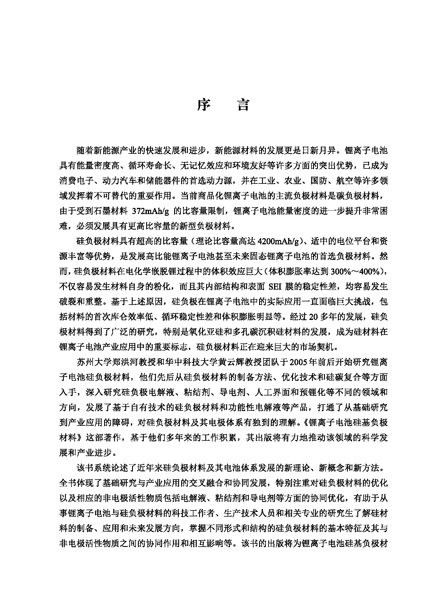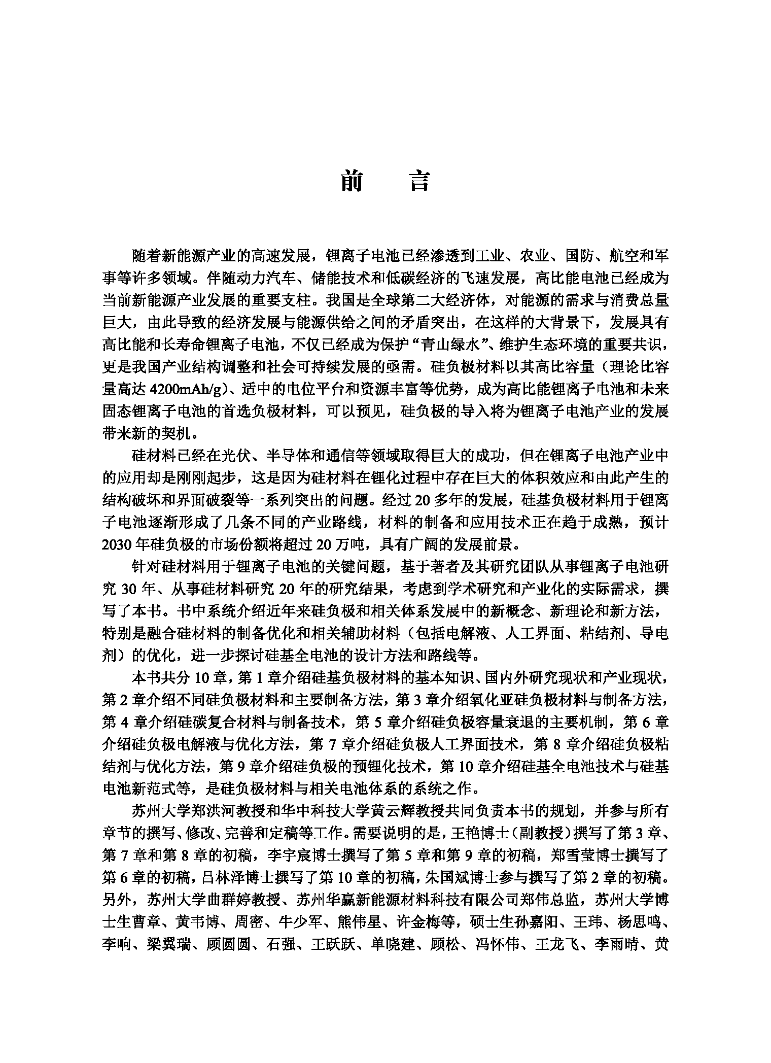本书是著者及其团队20年来在锂离子电池硅基负极材料及其电池体系方面的研究工作总结,系统介绍锂离子电池硅负极材料及其电池体系近年来发展的新理论、新概念和新方法。主要内容包括硅基负极材料的发展现状、制备方法与硅碳复合技术、硅负极容量衰退机理、硅负极电解液与人工界面技术、硅负极粘结剂技术、硅负极预锂化技术和硅基全电池设计等。本书从硅材料的结构、设计、形貌、状态和空间限域等多方面阐述高性能硅基负极材料的基本特征,进一步从电解液、粘结剂、人工界面和预锂化等多方面论述硅负极优化方向和技术路线,阐明高性能硅基全电池的制备工艺等。