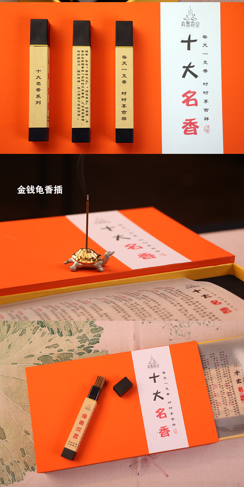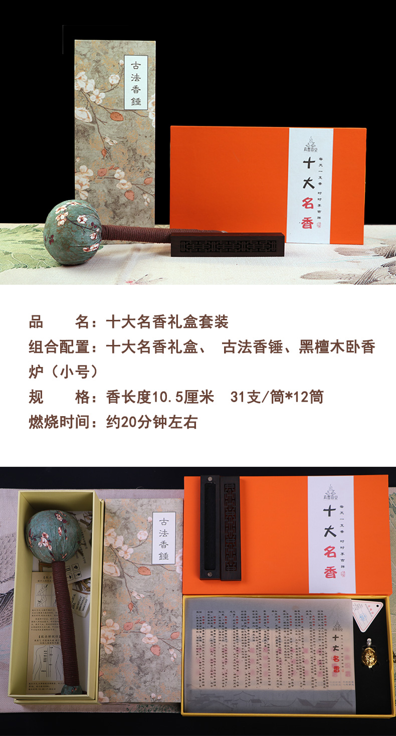 【茶香器韵】真馨香堂十大名香组合,沉二号、檀、降、柏、桂、龙脑、龙涎、龙麝、乳、金、舒睡、伴茗,赠小号黑檀木卧香炉、香锤