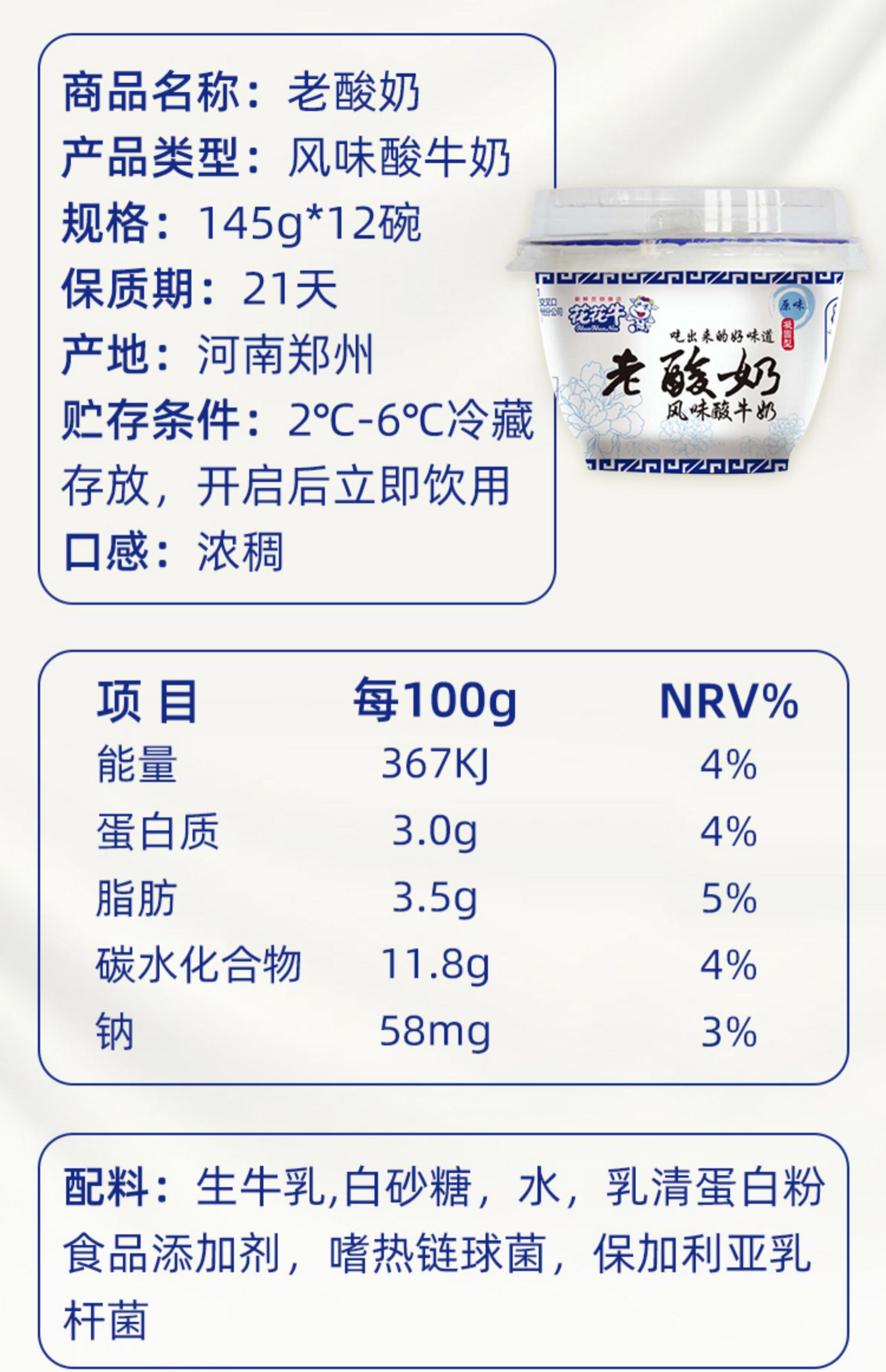 花花牛 原味老酸奶 益生菌风味发酵酸牛奶 145g*12碗