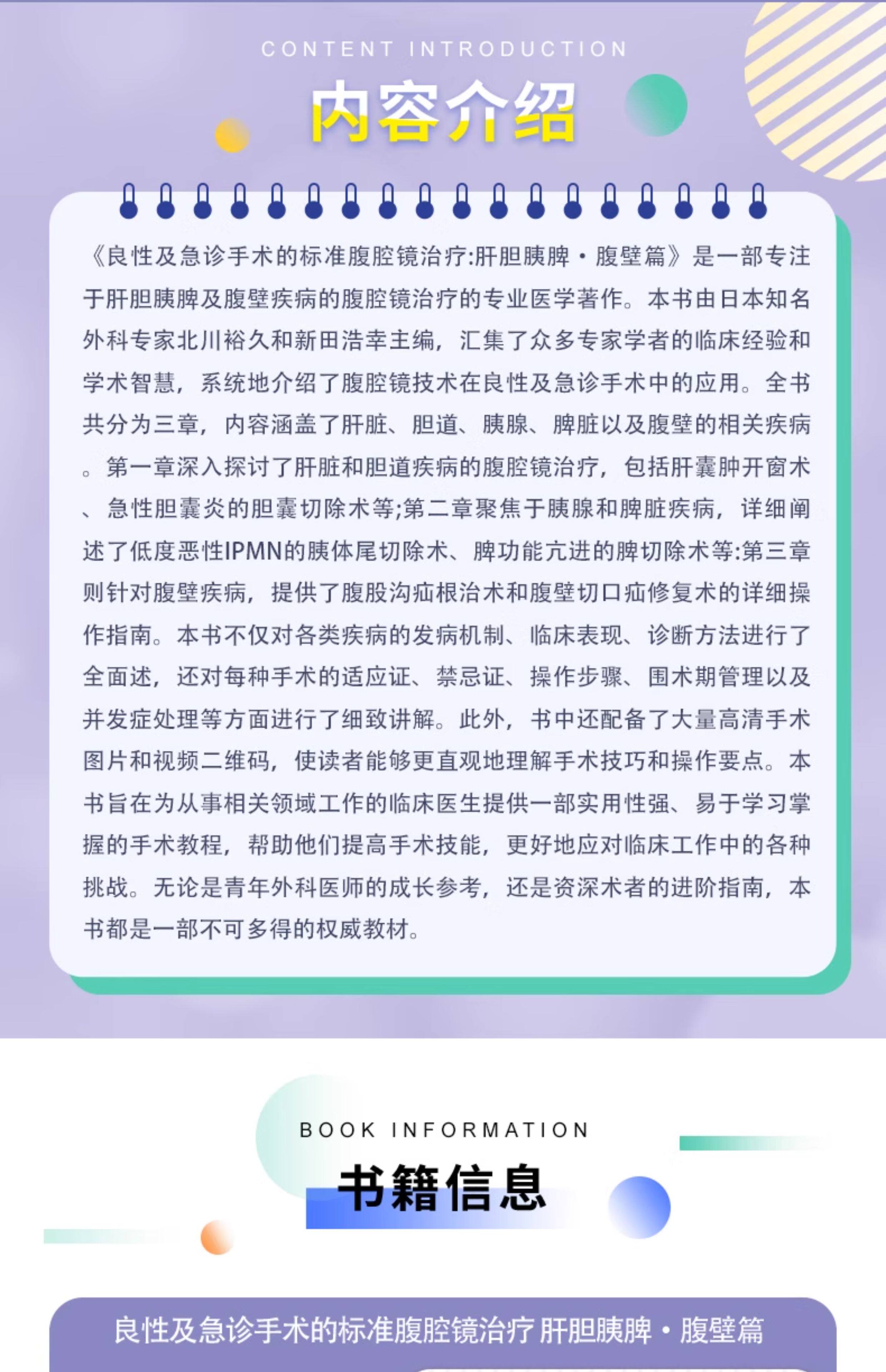 《良性及急诊手术的标准腹腔镜治疗:肝胆胰脾·腹壁篇》是一部专注于肝胆胰脾及腹壁疾病的腹腔镜治疗的专业医学著作。本书由日本知名外科专家北川裕久和新田浩幸主编,汇集了众多专家学者的临床经验和学术智慧,系统地介绍了腹腔镜技术在良性及急诊手术中的应用。全书共分为三章,内容涵盖了肝脏、胆道、胰腺、脾脏以及腹壁的相关疾病。第一章深入探讨了肝脏和胆道疾病的腹腔镜治疗,包括肝囊肿开窗术、急性胆囊炎的胆囊切除术等;第二章聚焦于胰腺和脾脏疾病,详细阐述了低度恶性IPMN的胰体尾切除术、脾功能亢进的脾切除术等;第三章则针对腹壁疾病,提供了腹股沟疝根治术和腹壁切口疝修复术的详细操作指南。本书不仅对各类疾病的发病机制、临床表现、诊断方法进行了全面阐述,还对每种手术的适应证、禁忌证、操作步骤、围术期管理以及并发症处理等方面进行了细致讲解。此外,书中还配备了大量高清手术图片和视频二维码,使读者能够更直观地理解手术技巧和操作要点本书旨在为从事相关领域工作的临床医生提供一部实用性强、易于学习掌握的手术教程,帮助他们提高手术技能,更好地应对临床工作中的各种挑战。无论是青年外科医师的成长参考,还是资深术者的进阶指南,本书都是一部不可多得的权威教材。
