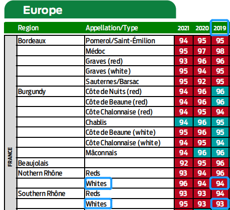 整体而言,此年份是一个产量与质量双高的好年份,这一年的干白普遍果香充沛,口感圆润清新。《葡萄酒爱好者》(Wine Enthusiast)给 2019 年份的北罗纳河谷干白整体打了 94 分。
