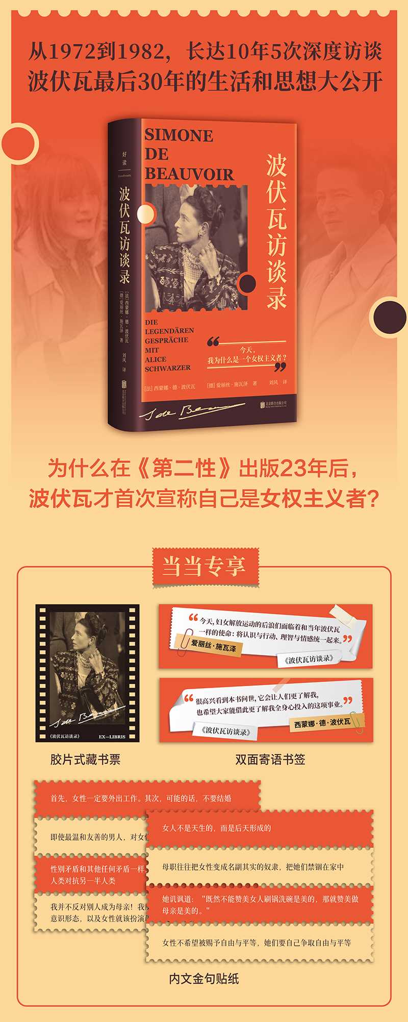 ★波伏瓦:;今天,我为什么是一个女权主义者?★从1972到1982,长达10年5次深度访谈,波伏瓦最后30年的生活和思想大公开★波伏瓦生前最后的访谈录首度面世:波伏瓦以一贯犀利的言辞和激进的态度,谈论性别权力关系、性取向、女性地位、爱与尊严等话题,也真诚坦露个人隐私,讲述自己垂暮之年的感受,以及与萨特的开放式关系★女权主义思想导师西蒙娜德波伏瓦 times; 德国女权运动先锋爱丽丝施瓦泽,法、德女权主义领军人物唯一对谈★版权售出巴西、克罗地亚、丹麦、法国、英国、希腊、日本、韩国、荷兰、西班牙、土耳其、美国等十余个国家和地区,盗版更是在无数女性团体中传播,影响了全世界的妇女运动★特别收录波伏瓦生平大事记★精装小尺寸,盈盈一握出行通勤,思想宝藏;小红书