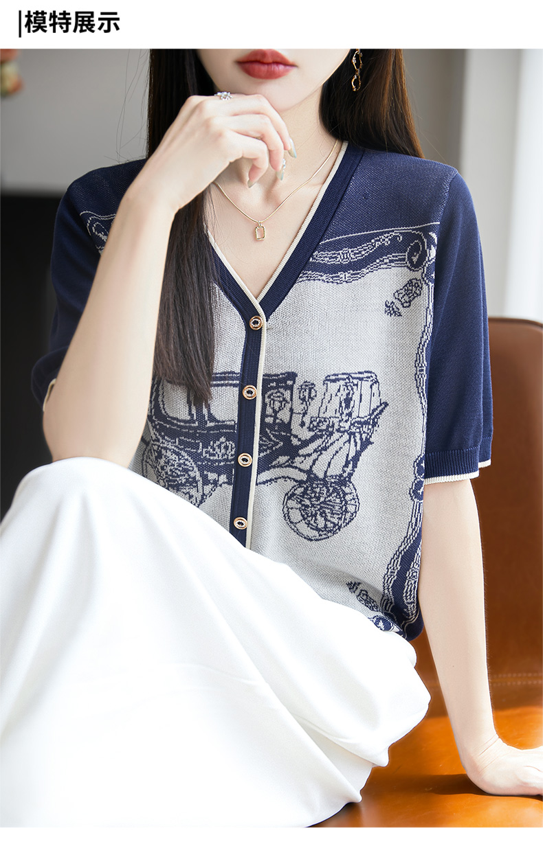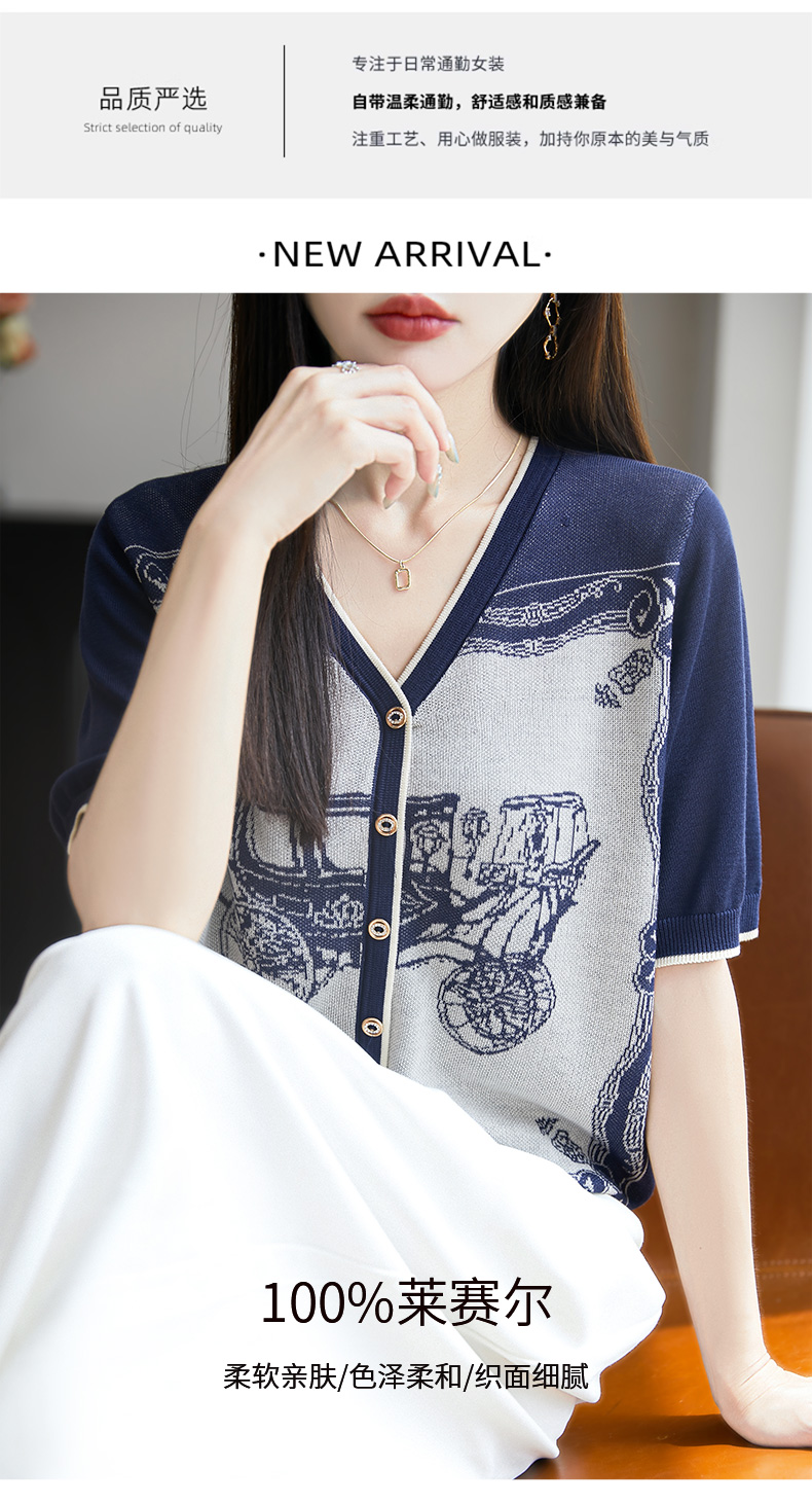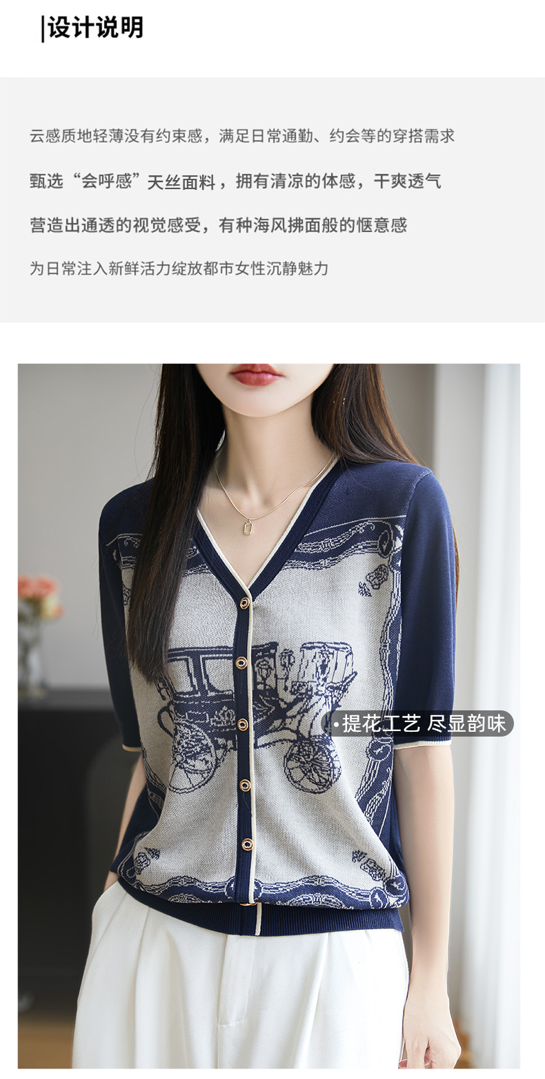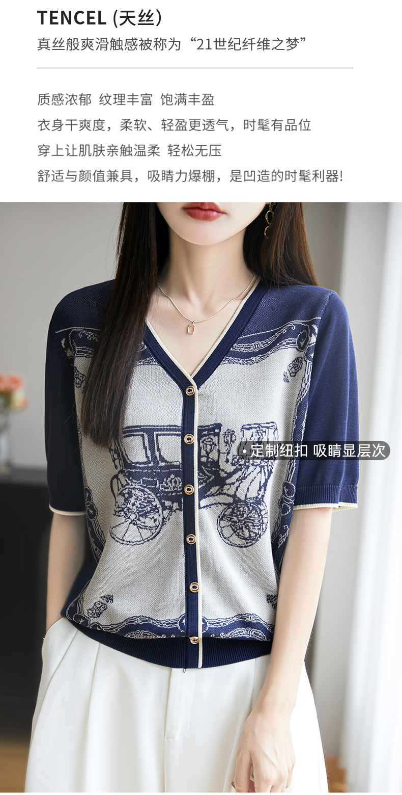 奥伊米夏季新款女100%莱赛尔复古V领重工提花针织T恤NSY275