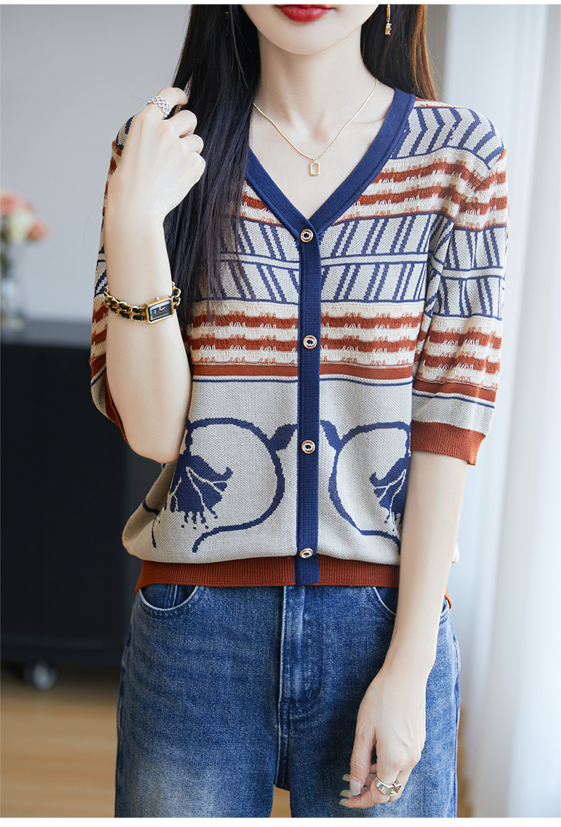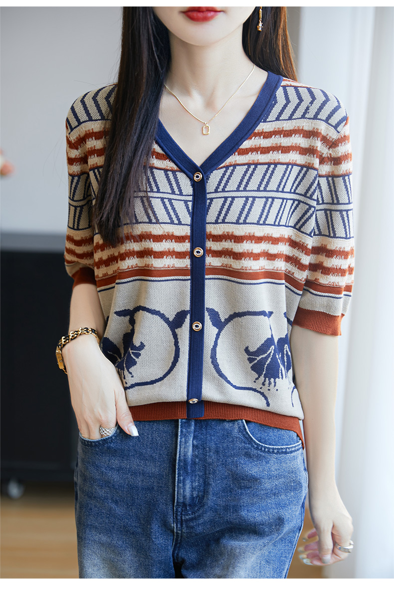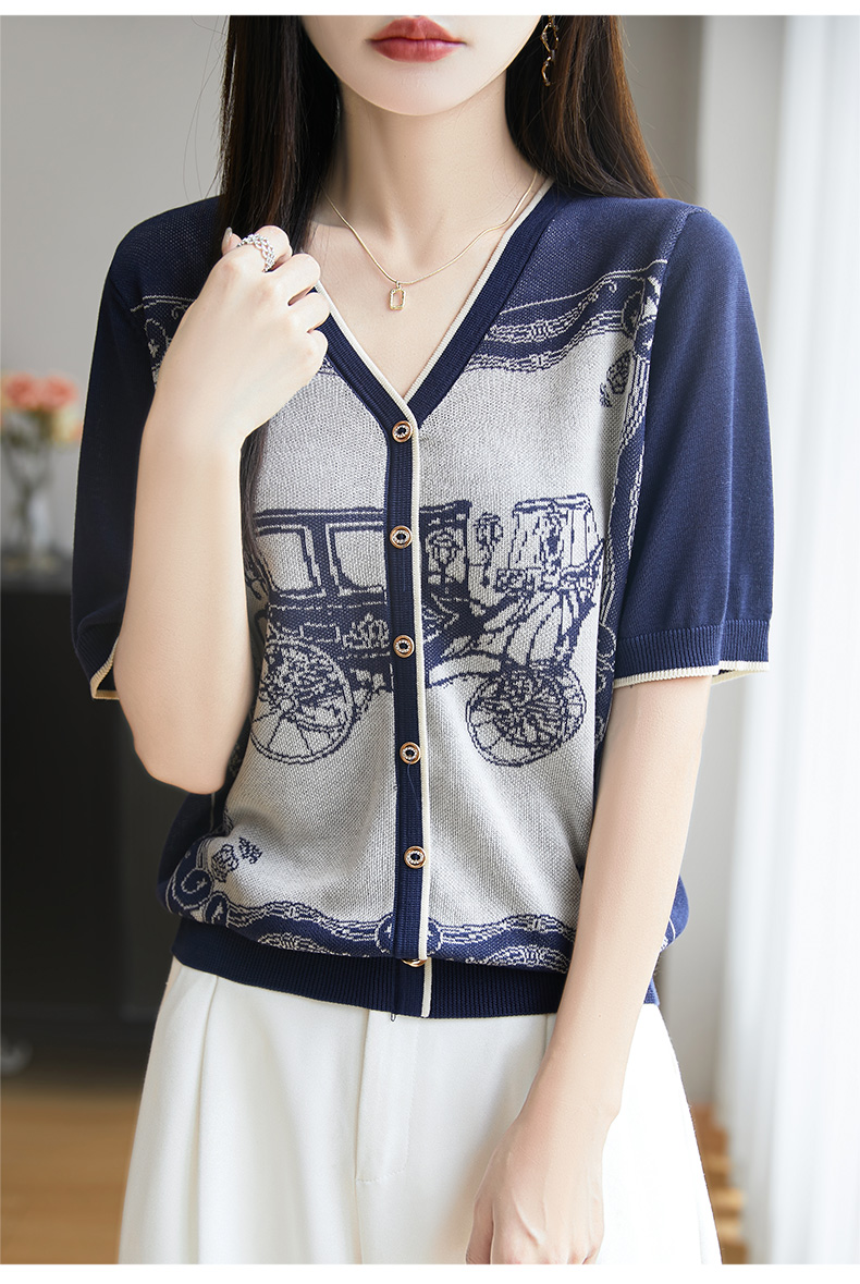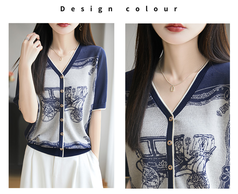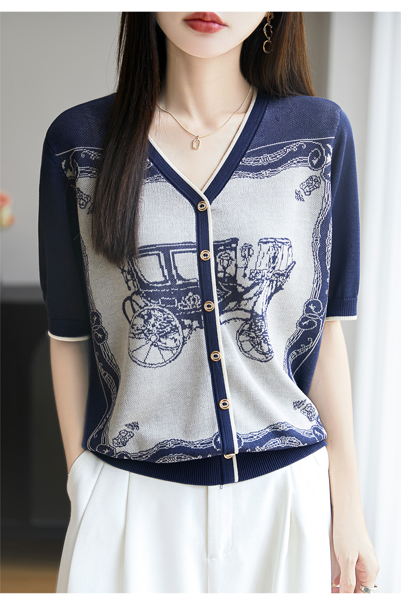 奥伊米夏季新款女100%莱赛尔复古V领重工提花针织T恤NSY275