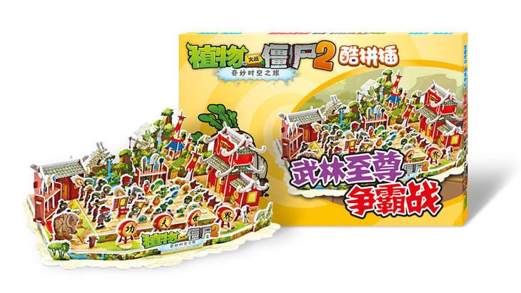 《武林至尊争霸战》是以《植物大战僵尸2·奇妙时空之旅》游戏中的第4关“功夫世界”的场景、植物形象和僵尸形象为主角,既包含可供孩子自己动手拼插的古代建筑和兵器架,也包括可供孩子排兵布阵的植物和僵尸形象,让孩子动手动脑,拼出战略,拼出智慧。