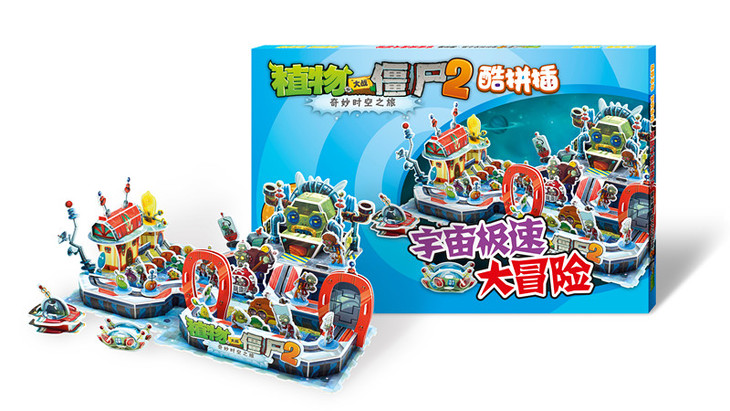 《宇宙极速大冒险》是以《植物大战僵尸2奇妙时空之旅》游戏中的第5关“未来世界”的场景、植物形象和僵尸形象为主角,采用“轨道连接空间站”的设计思路,充满现代感的蓝光轨道连接了两座悬浮的宇宙空间站,植物和僵尸可在上面自由滑动、竞逐,还有两道可开启、关闭的大门控制进出,两个可拼插的小型飞行器可以任意摆放,此外,仍有一块可供排兵布阵的对阵区域,整体上增加了可玩性,让孩子有更多发挥空间。