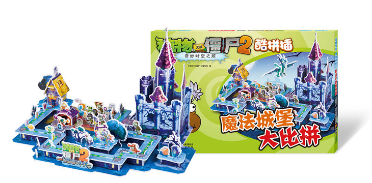 《魔法城堡大比拼》是以《植物大战僵尸2奇妙时空之旅》第6站“黑暗时代”的全景再现——植物战士的营房和僵尸的魔法城堡,对阵线路以及具有鲜明特色的三条支线。本系列拼插是以《植物大战僵尸2奇妙科幻之旅》中第六站黑暗时代的形象和场景为素材而设计的立体手工产品。场景很好地还原了原游戏作品中的暗黑气氛和植物与僵尸的生动形象。独立的植物和僵尸小插片搭配场面宏大的背景底板,能让孩子们在锻炼排兵布阵的逻辑思考能力的同时体验与同名电脑游戏相同的氛围场景。