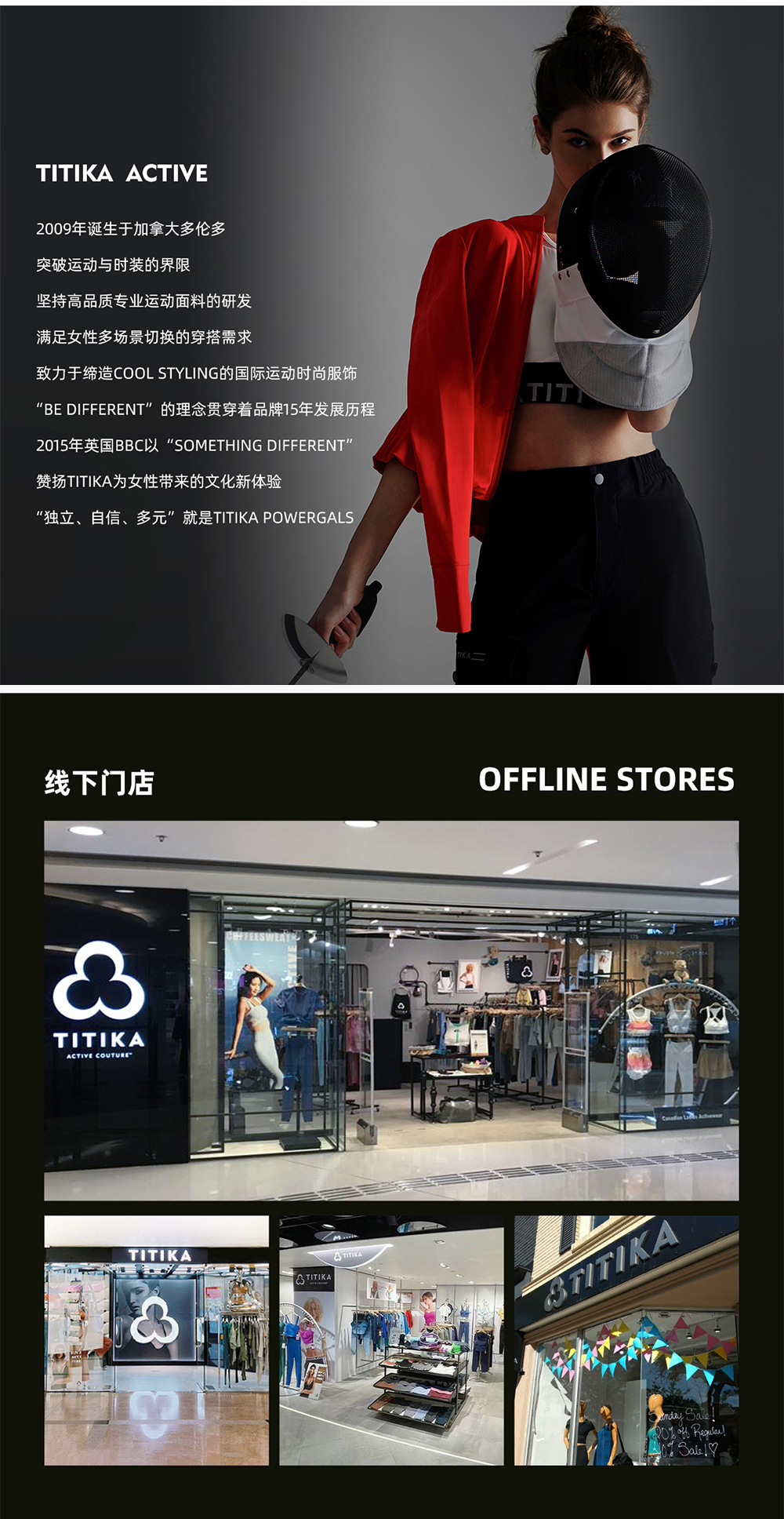 - 2009年,Titika Active Couture诞生于北美时尚之都,重新定义运动服饰,让运动时尚,前卫、性感,更宣扬一种无畏自由的生活态度。TITIKA缇缇卡不断求变,为品牌添加多种元素
