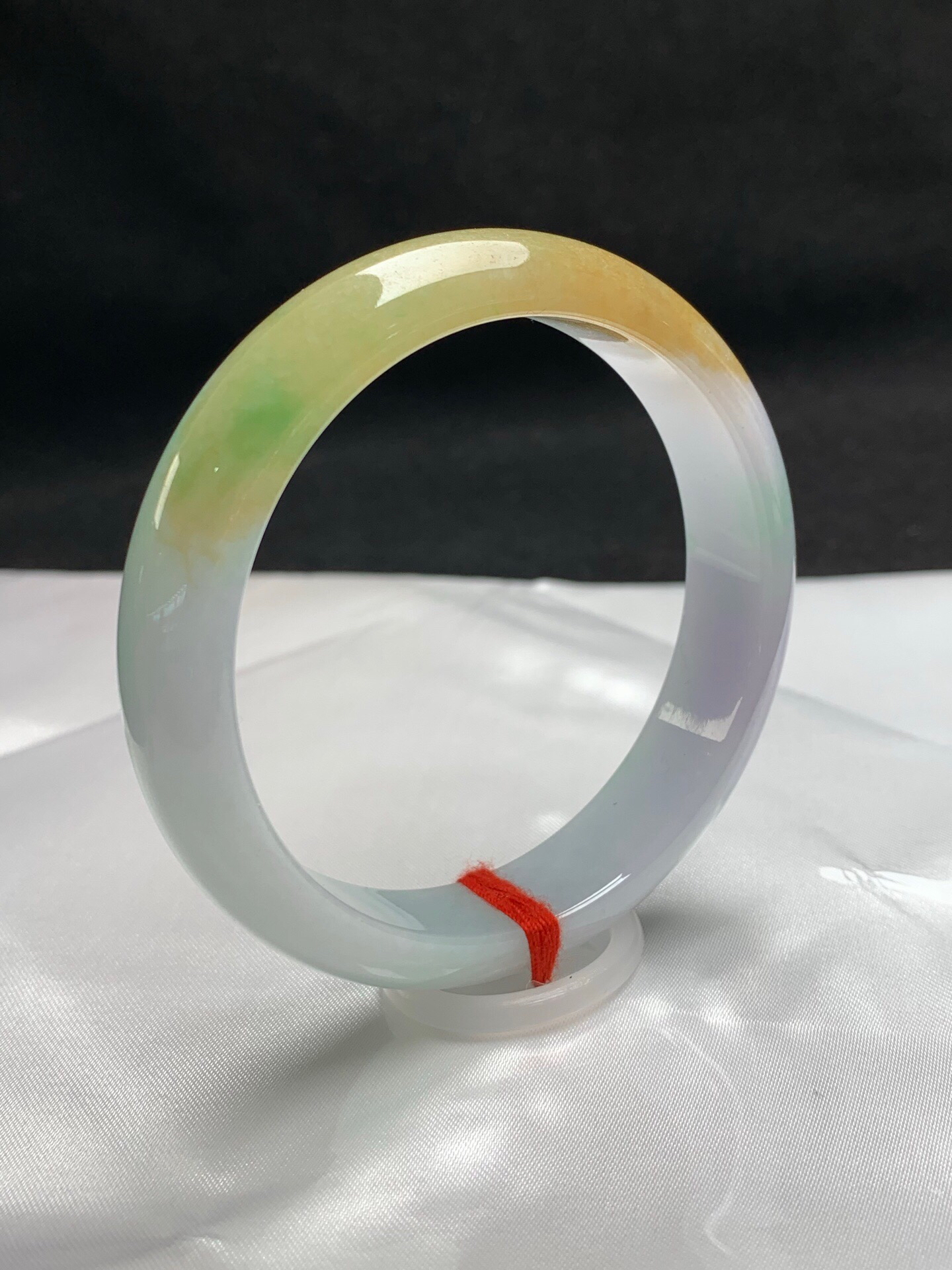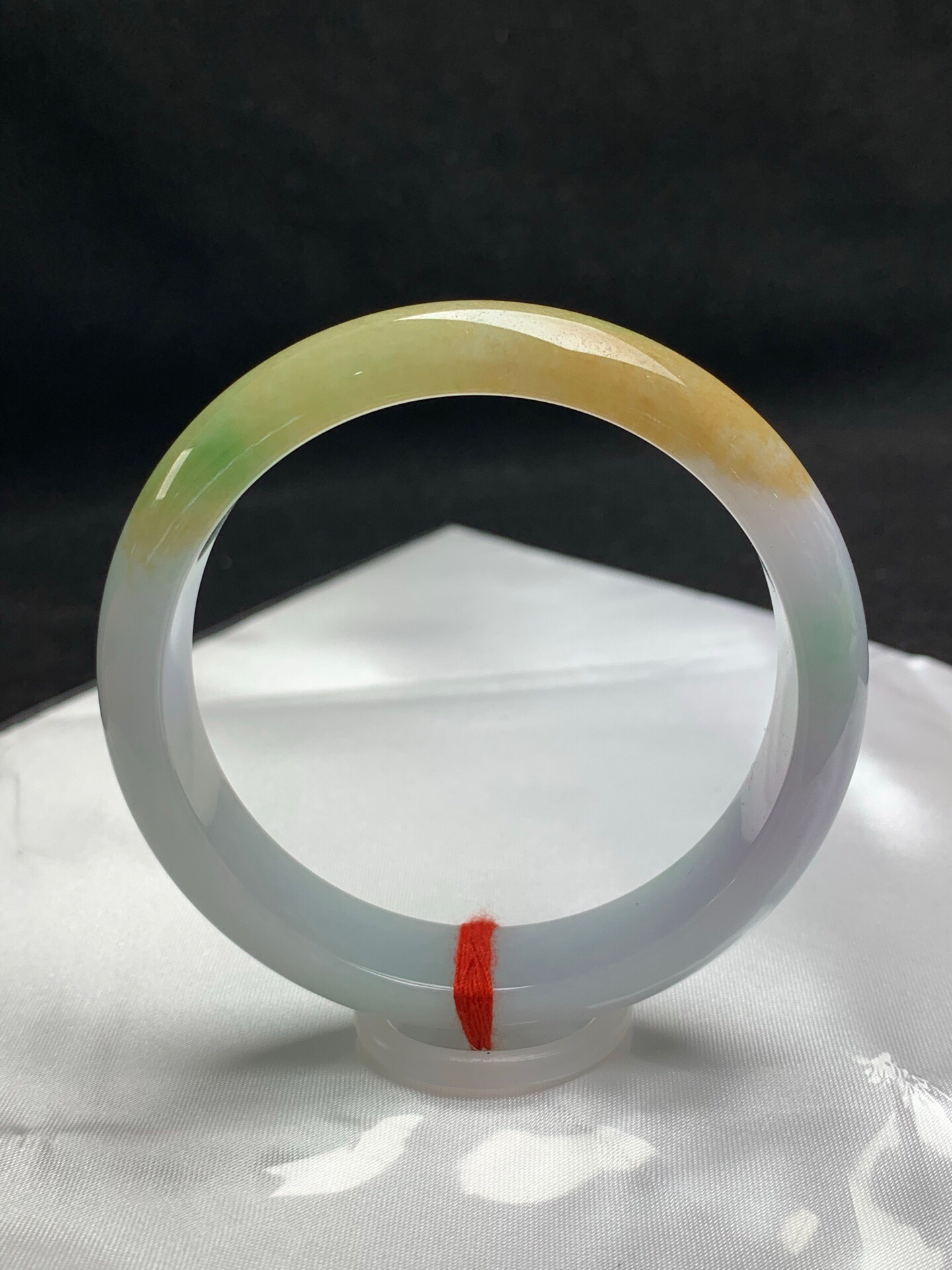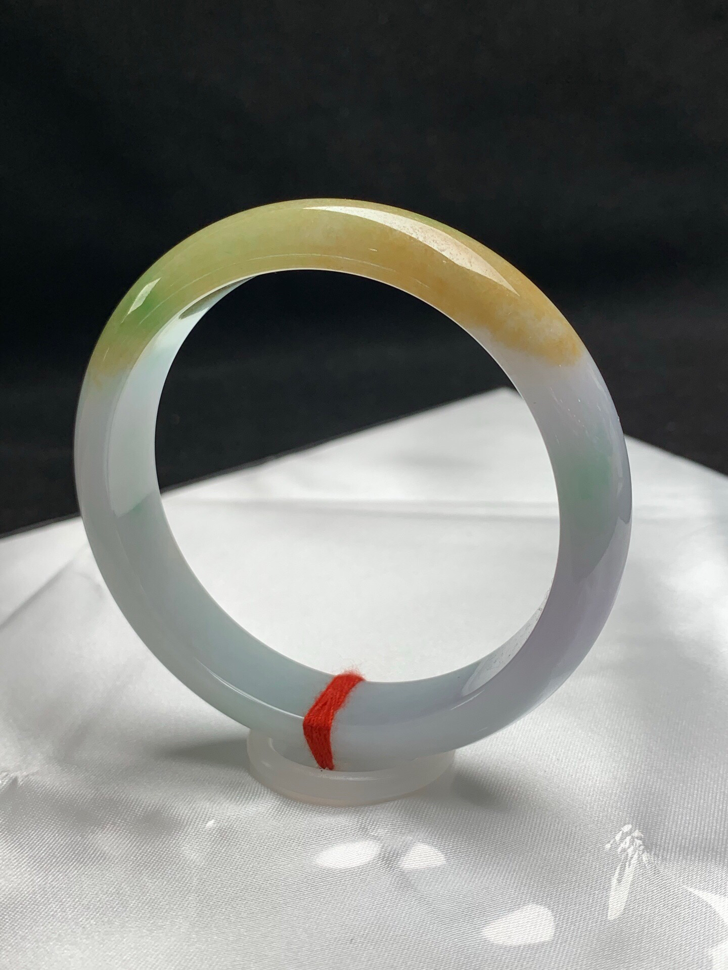 620630,58.2圈口,细糯三彩正圈平安镯,春彩底飘半截黄翡色
