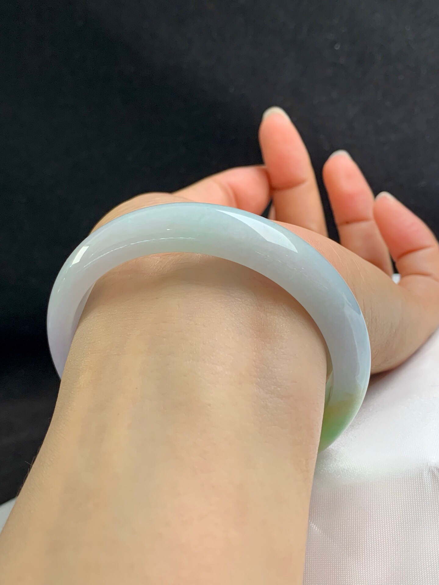 620630,58.2圈口,细糯三彩正圈平安镯,春彩底飘半截黄翡色,特色镯,完美无裂,尺寸:58.2-13.2-7.7,超值价💰12300 #优石客珠宝#香玉荟萃