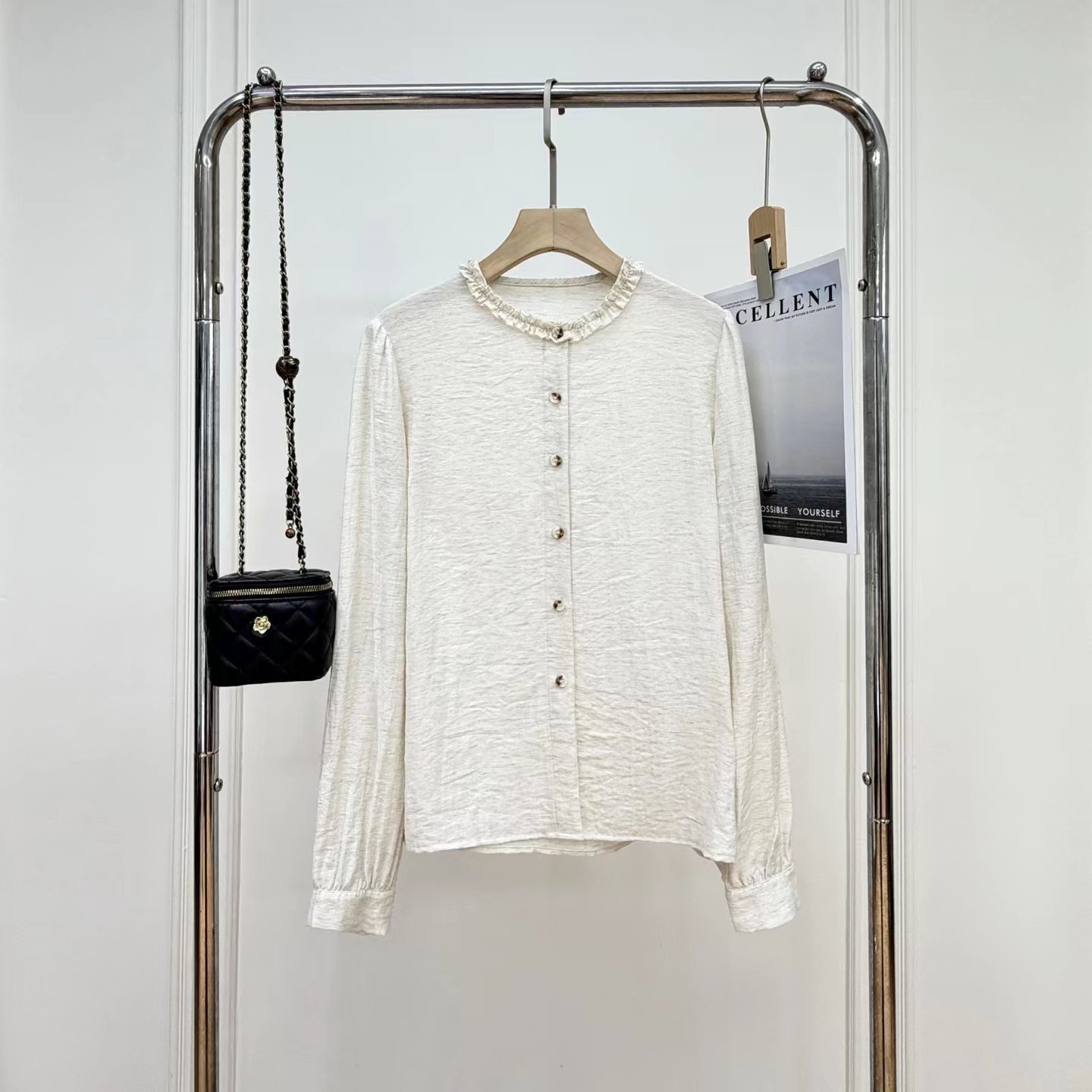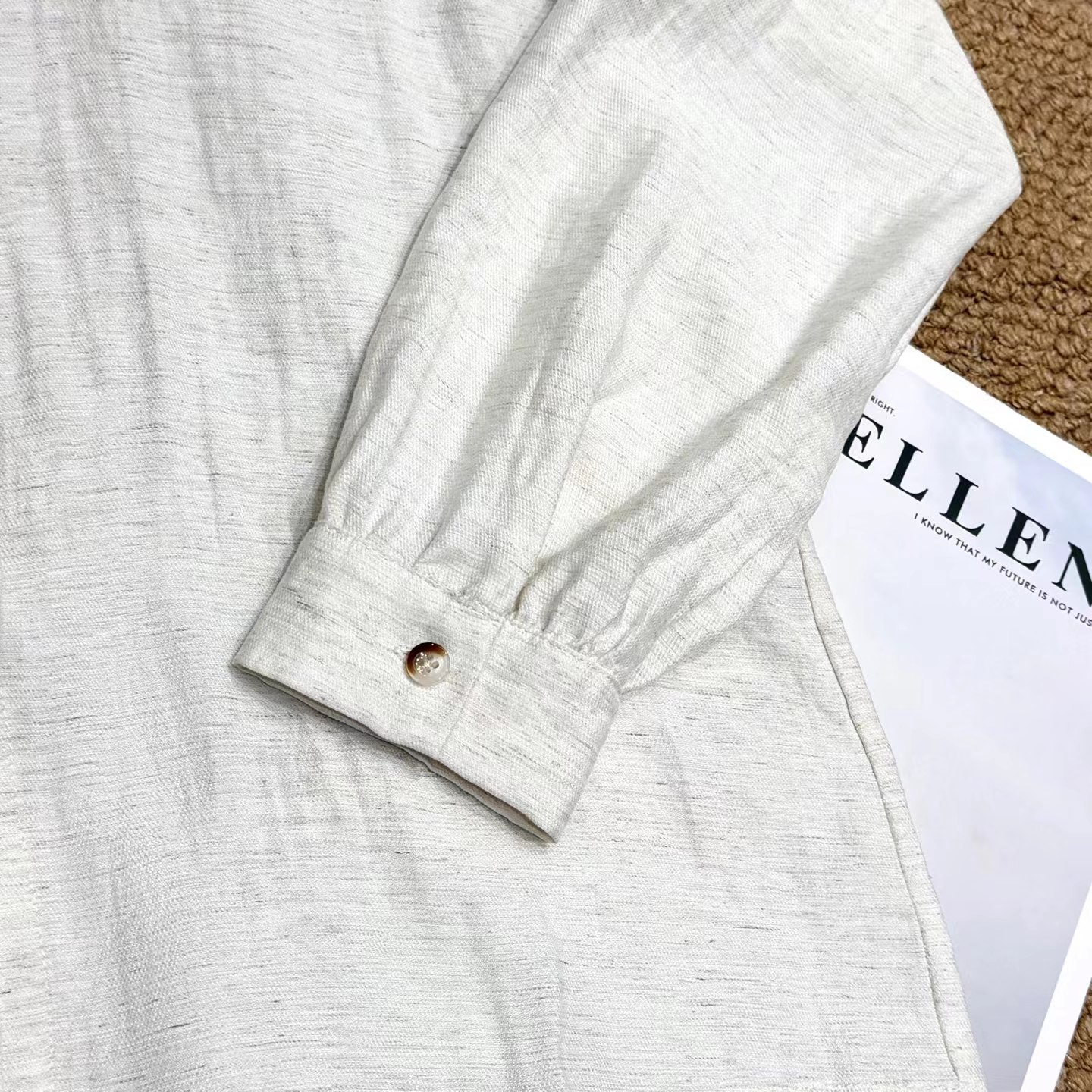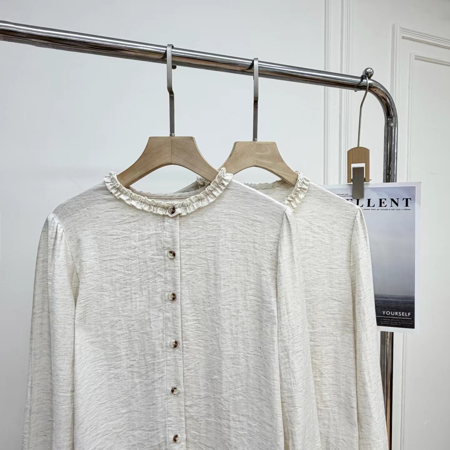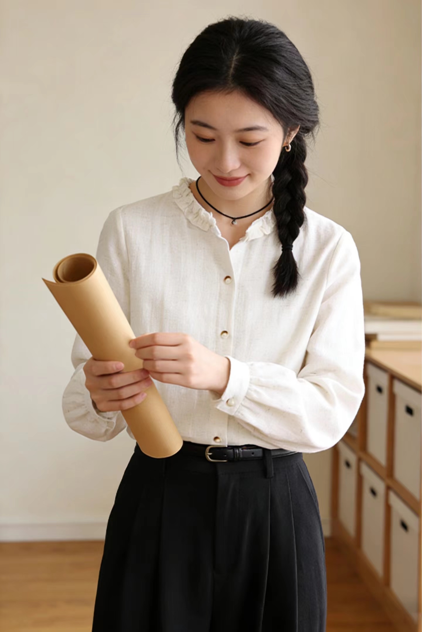 2026早春新款法式气质百搭亚麻木耳边立领长袖衬衫,法式亚麻衬衫!采用精zhi的木耳边立领设计,没有传统衬衫的尖锐棱角。细腻的褶皱沿着颈部线条舒展,修饰颈部线条,随便穿但贵气!“小月牙”圆扣门襟,方便穿脱,细看发现自带“小月牙,别致有趣~正肩微阔版型,藏肉显瘦,袖笼空间自由,抬胳膊时不怕崩线,袖子设计从腋下开始微微放量,在袖口处做了微收处理,既藏住了手臂的拜拜肉,又不会显得臃肿拖沓。H型宽松版型不挑身材,无论是苹果型还是梨型身材都能轻松驾驭。衣长适宜,搭配高腰半裙或牛仔裤时,能自然地遮住小腹和胯部赘肉,视觉上显瘦又显高。日常通勤出街搭配率高,出门拍照很出片!