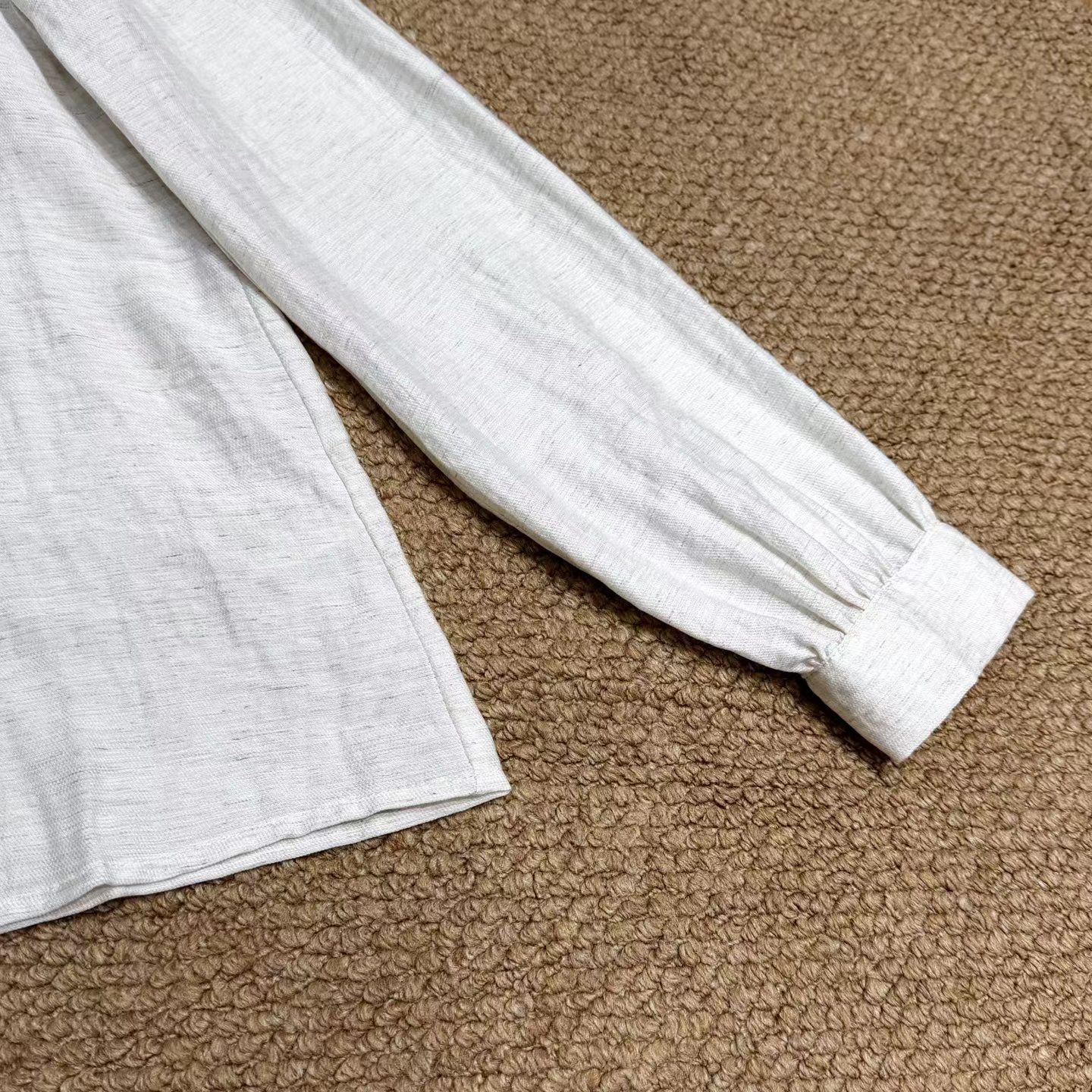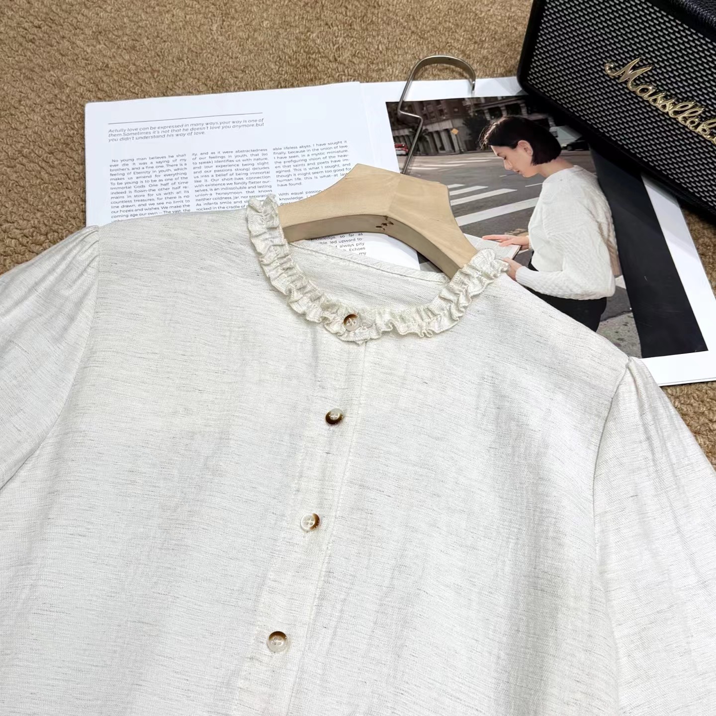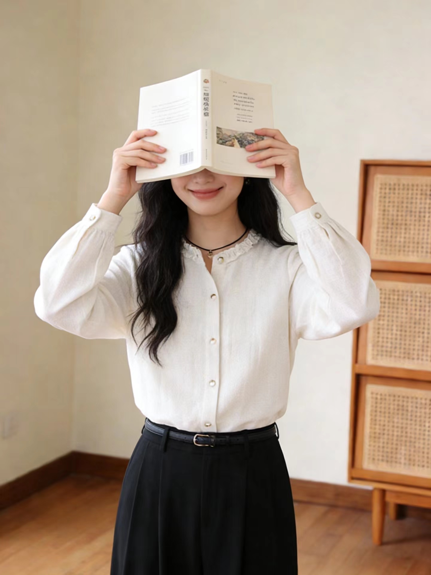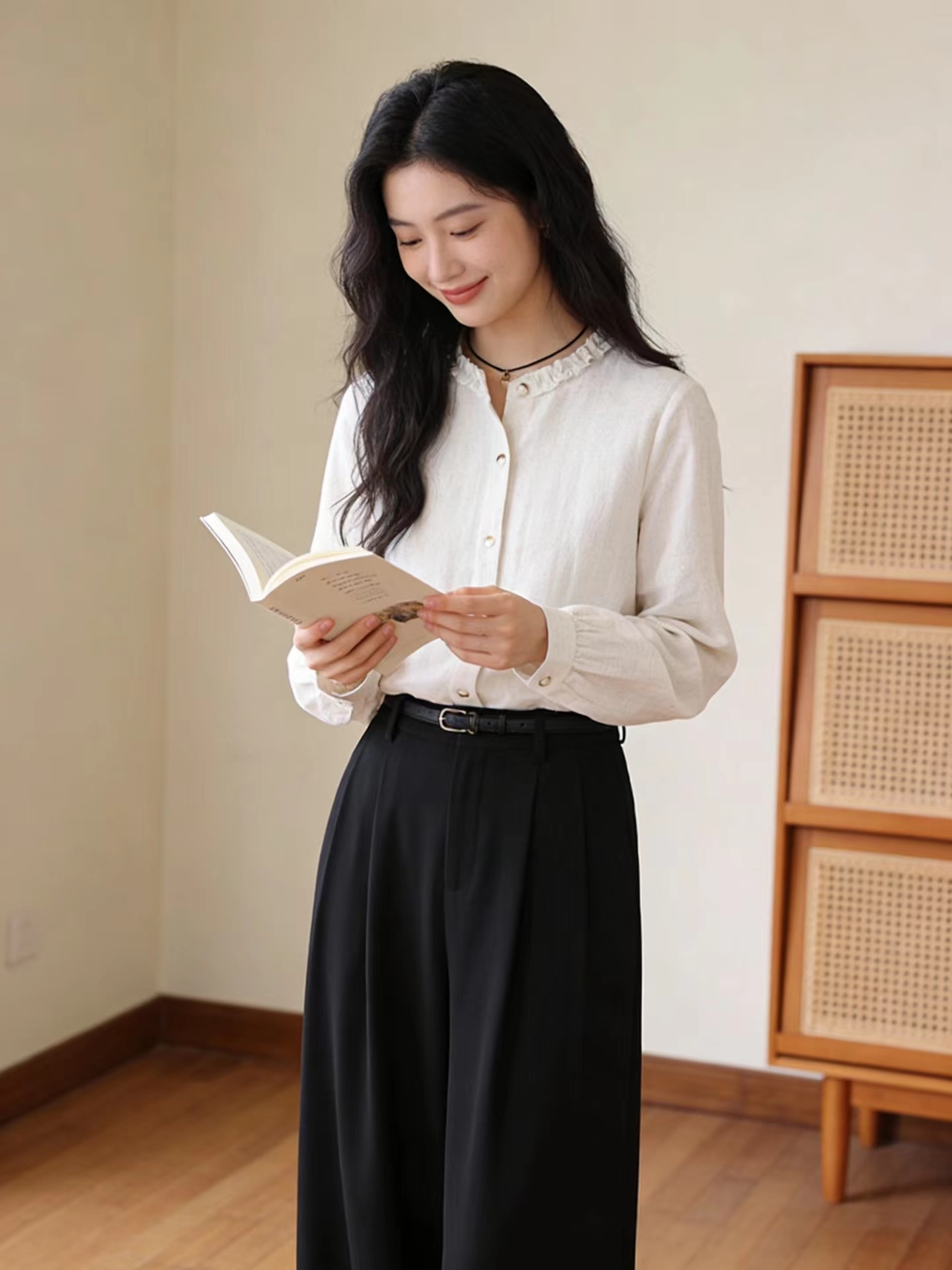2026早春新款法式气质百搭亚麻木耳边立领长袖衬衫,法式亚麻衬衫!采用精zhi的木耳边立领设计,没有传统衬衫的尖锐棱角。细腻的褶皱沿着颈部线条舒展,修饰颈部线条,随便穿但贵气!“小月牙”圆扣门襟,方便穿脱,细看发现自带“小月牙,别致有趣~正肩微阔版型,藏肉显瘦,袖笼空间自由,抬胳膊时不怕崩线,袖子设计从腋下开始微微放量,在袖口处做了微收处理,既藏住了手臂的拜拜肉,又不会显得臃肿拖沓。H型宽松版型不挑身材,无论是苹果型还是梨型身材都能轻松驾驭。衣长适宜,搭配高腰半裙或牛仔裤时,能自然地遮住小腹和胯部赘肉,视觉上显瘦又显高。日常通勤出街搭配率高,出门拍照很出片!