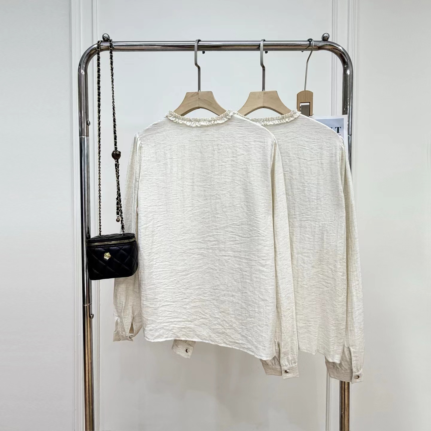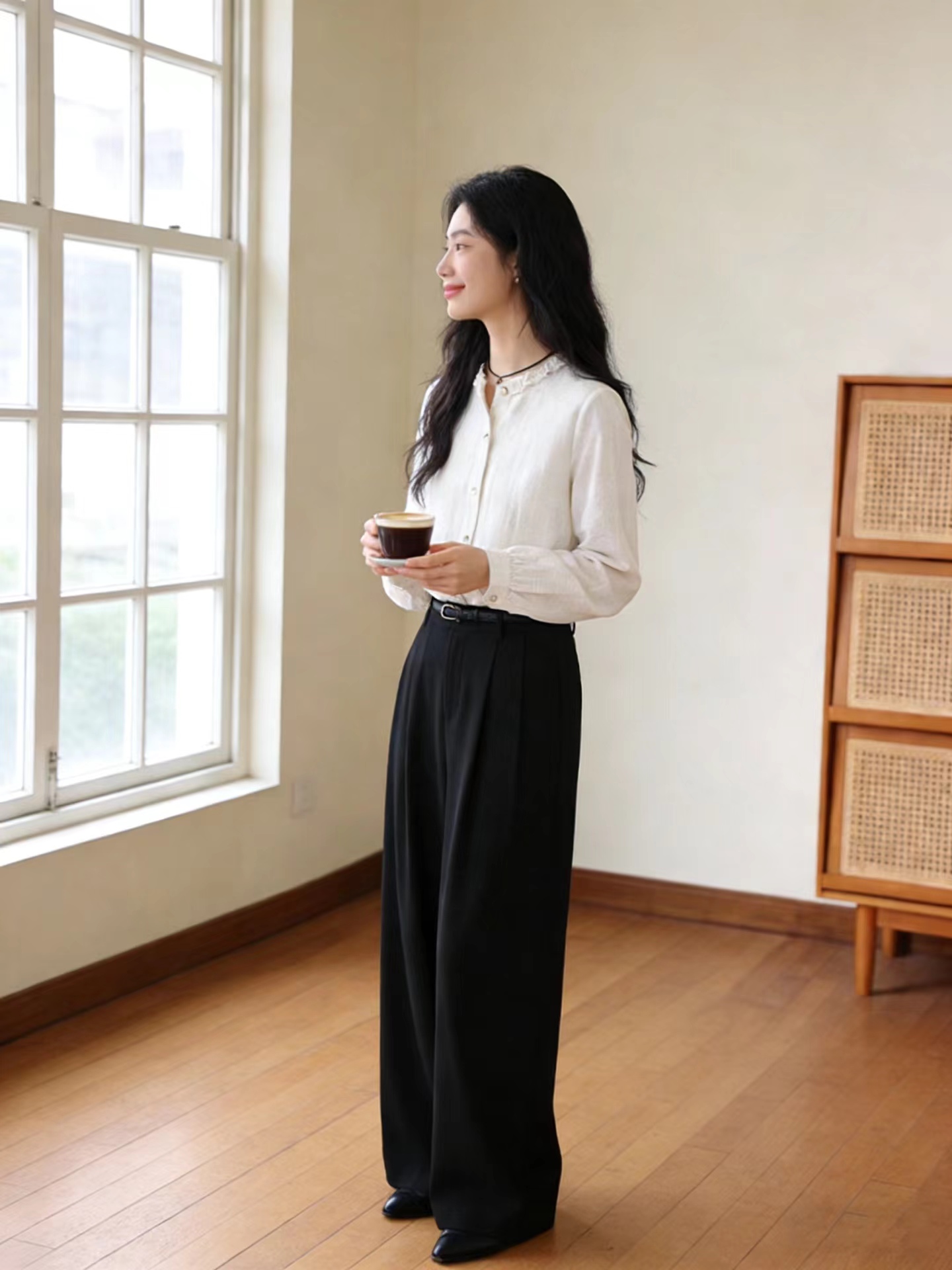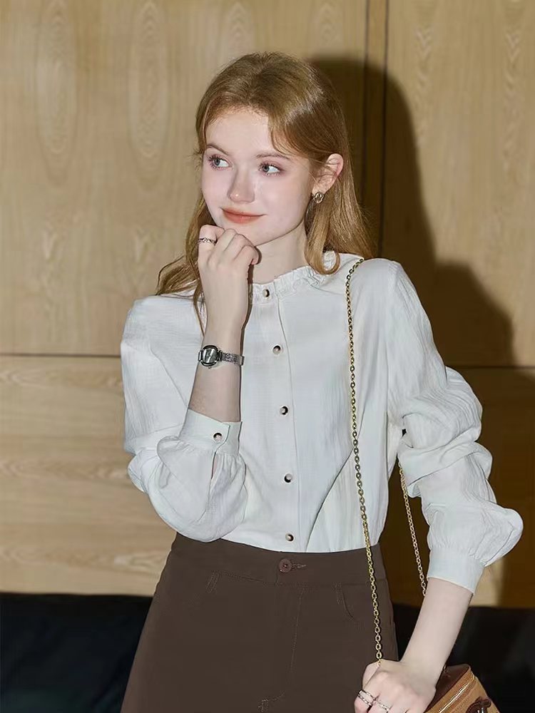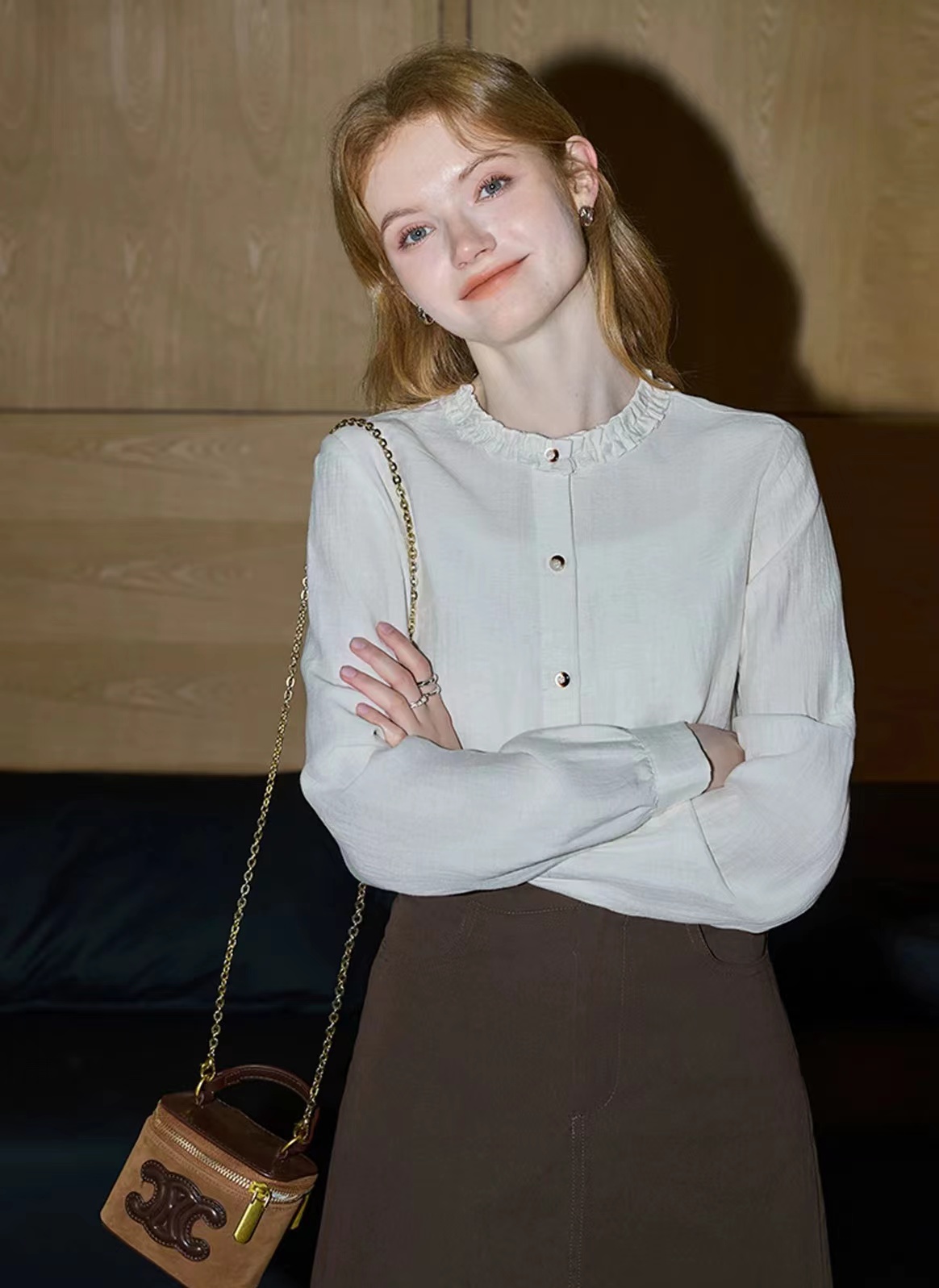 2026早春新款法式气质百搭亚麻木耳边立领长袖衬衫,法式亚麻衬衫!采用精zhi的木耳边立领设计,没有传统衬衫的尖锐棱角。细腻的褶皱沿着颈部线条舒展,修饰颈部线条,随便穿但贵气!“小月牙”圆扣门襟,方便穿脱,细看发现自带“小月牙,别致有趣~正肩微阔版型,藏肉显瘦,袖笼空间自由,抬胳膊时不怕崩线,袖子设计从腋下开始微微放量,在袖口处做了微收处理,既藏住了手臂的拜拜肉,又不会显得臃肿拖沓。H型宽松版型不挑身材,无论是苹果型还是梨型身材都能轻松驾驭。衣长适宜,搭配高腰半裙或牛仔裤时,能自然地遮住小腹和胯部赘肉,视觉上显瘦又显高。日常通勤出街搭配率高,出门拍照很出片!