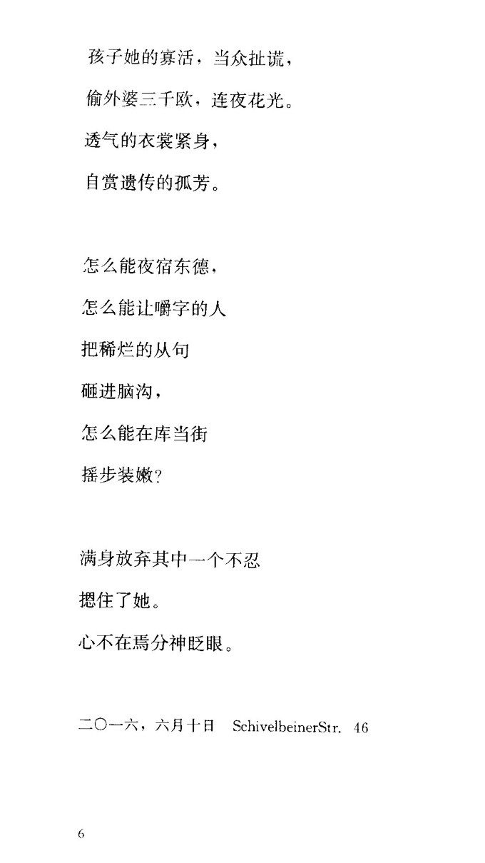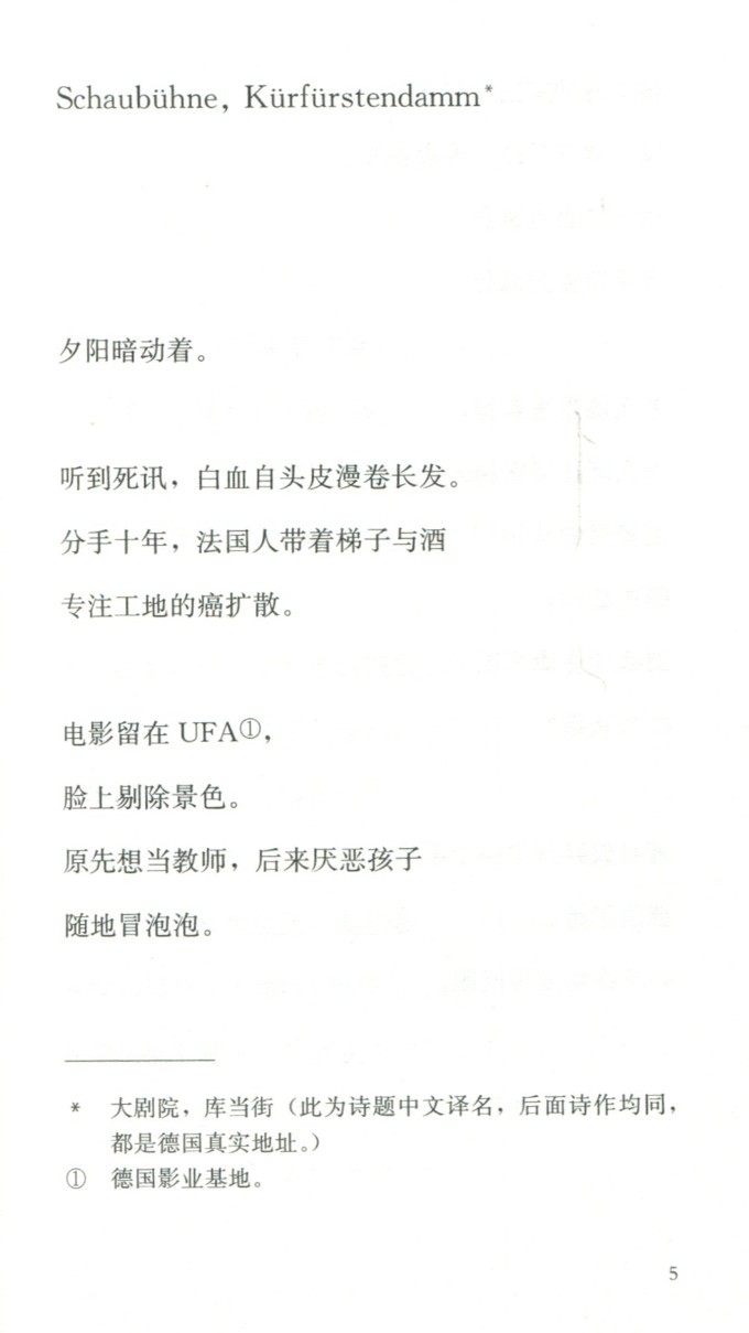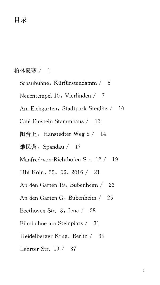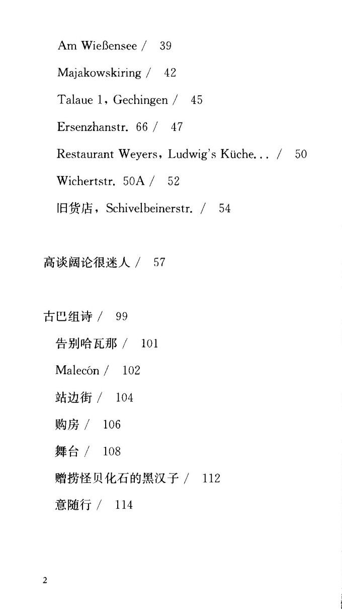 这是一本独树一帜的诗文集。第一部分为二十一首诗作,表现形式非常新颖,每一首根据对一个人的采访创作而成,人物涉及社会各个领域,有医生、律师和艺术家等知识分子,也有生活窘迫的下岗工人和退休职员。通过现代诗的表现手法,生动而深邃地呼应和呈现了普通德国人的生存境况。第二部分的短文写了德国流浪汉、难民和房地产商,回应了现代性面临的问题意识。第三部分“古巴组诗”,描写了古巴普通人的日常生活和当代的生活境遇。