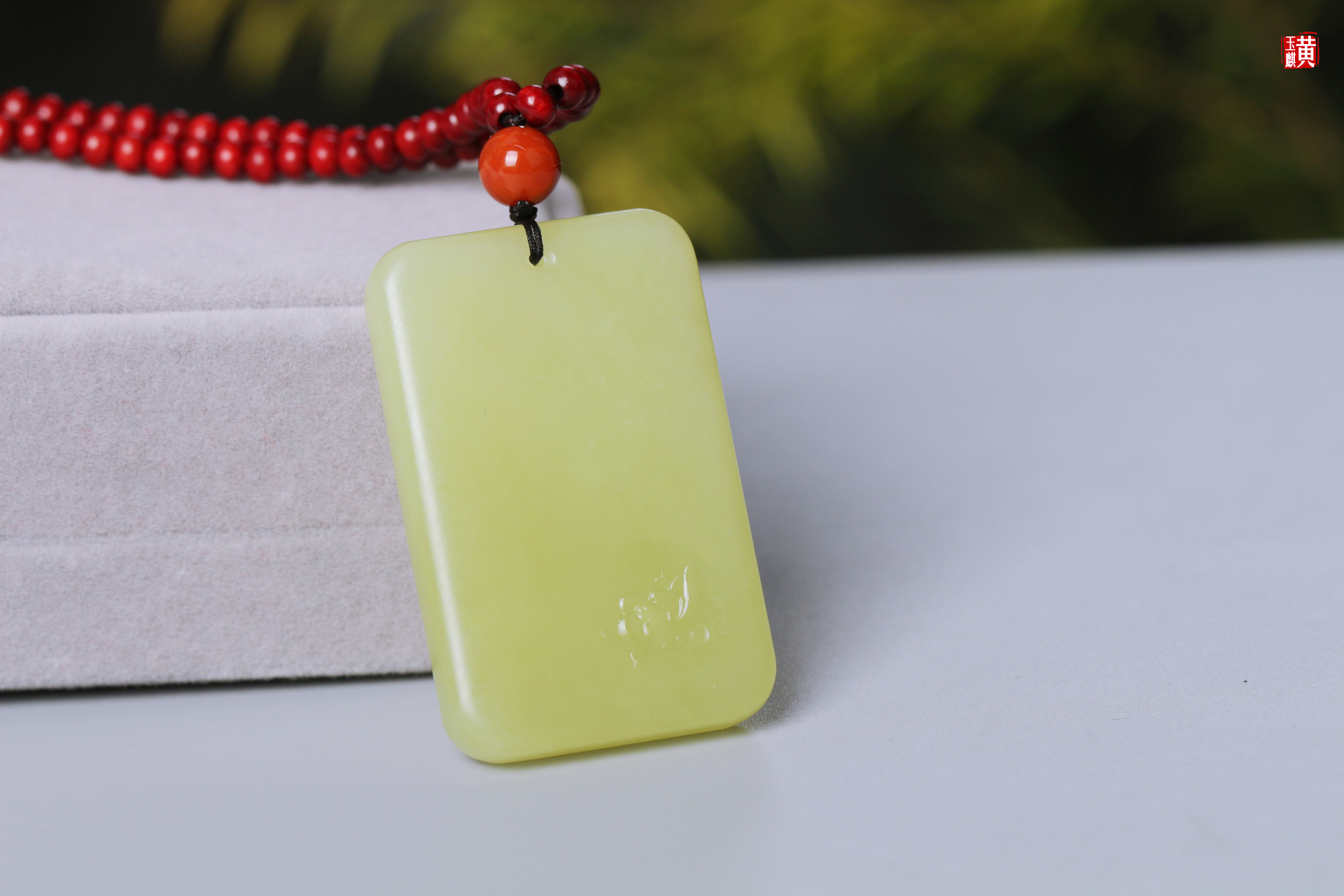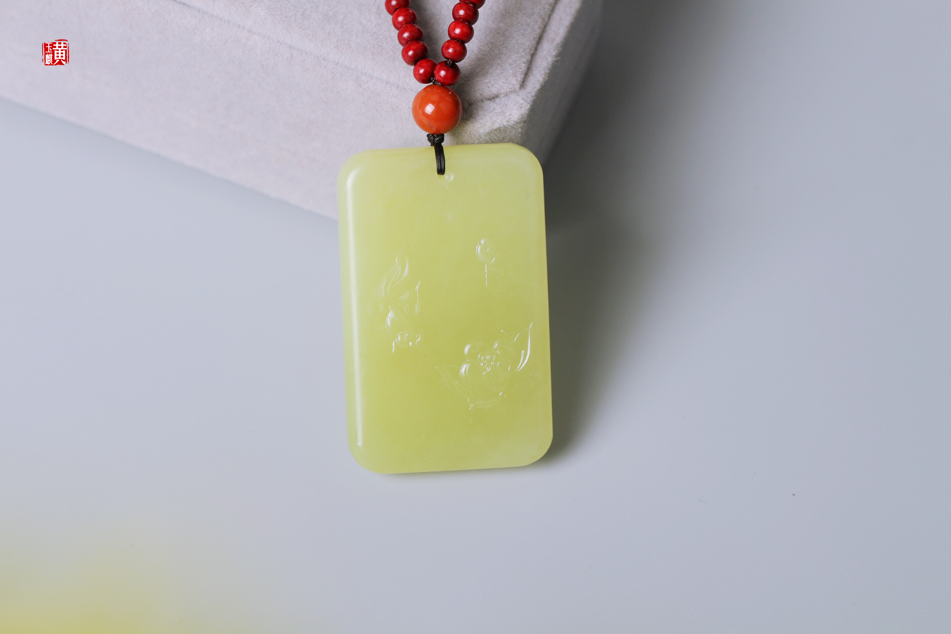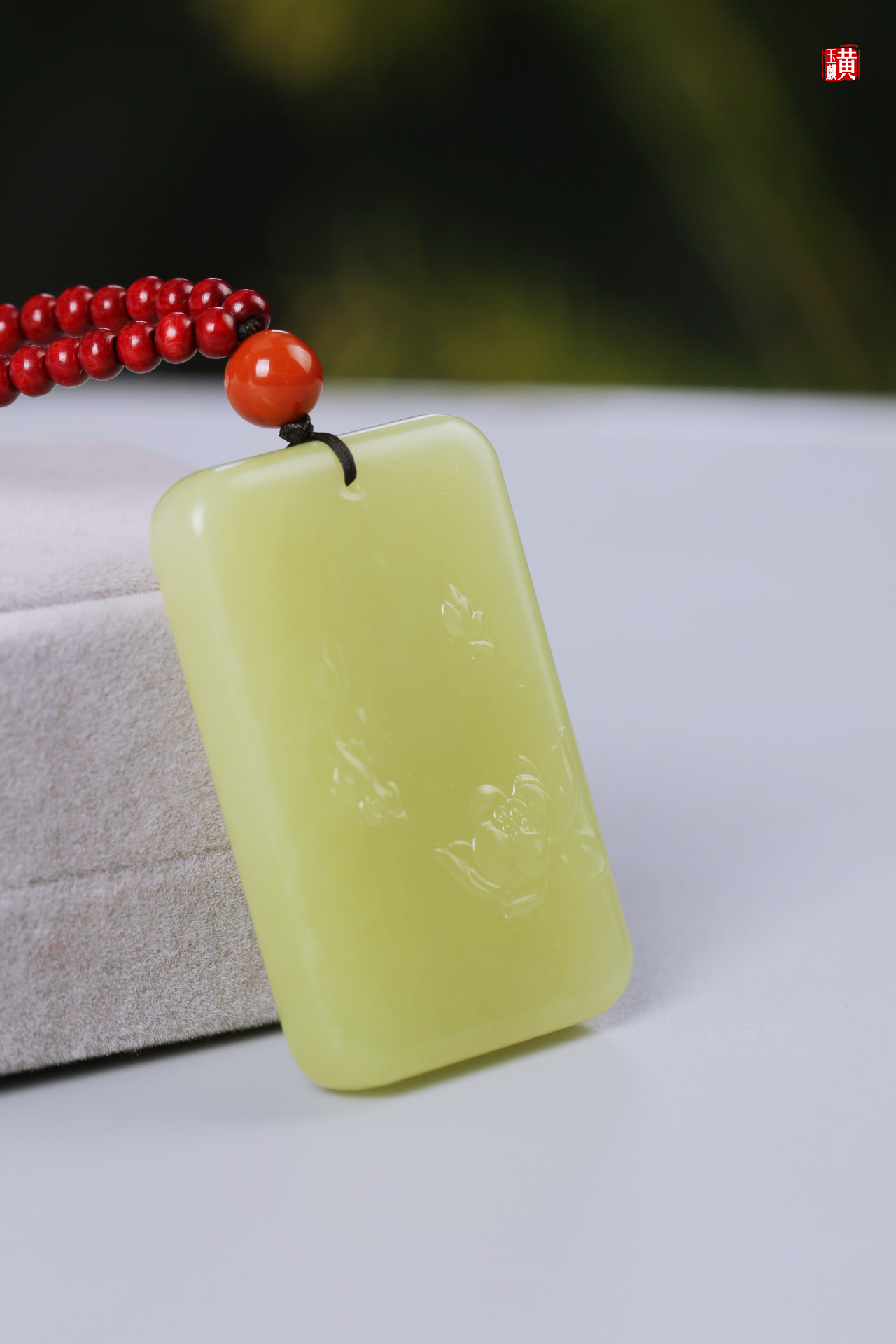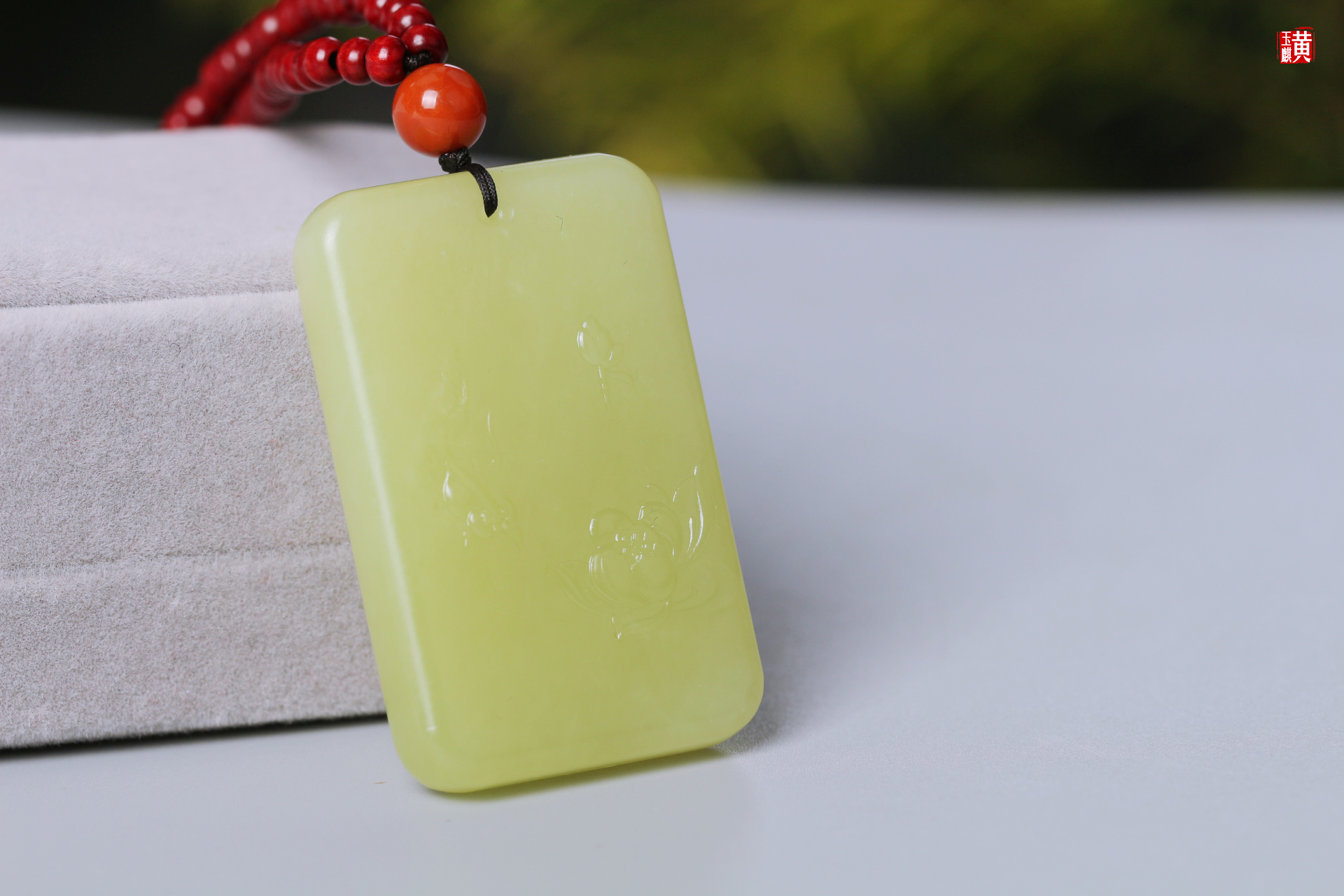 和田玉黄玉【连年有余】吊坠配红檀珠赠证书:GA0211200865 克重:33.60g尺寸:47.9*30.5*9mm
