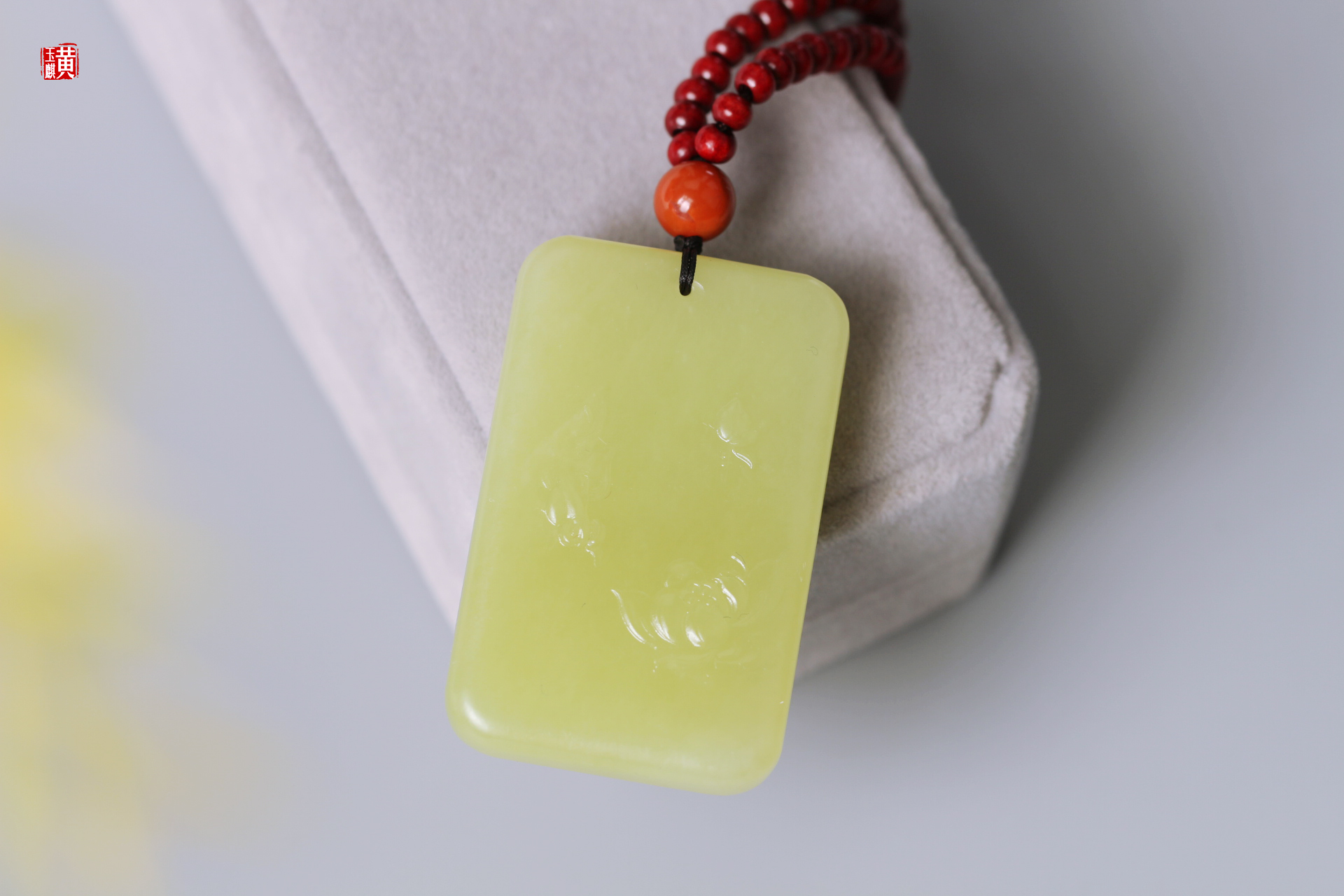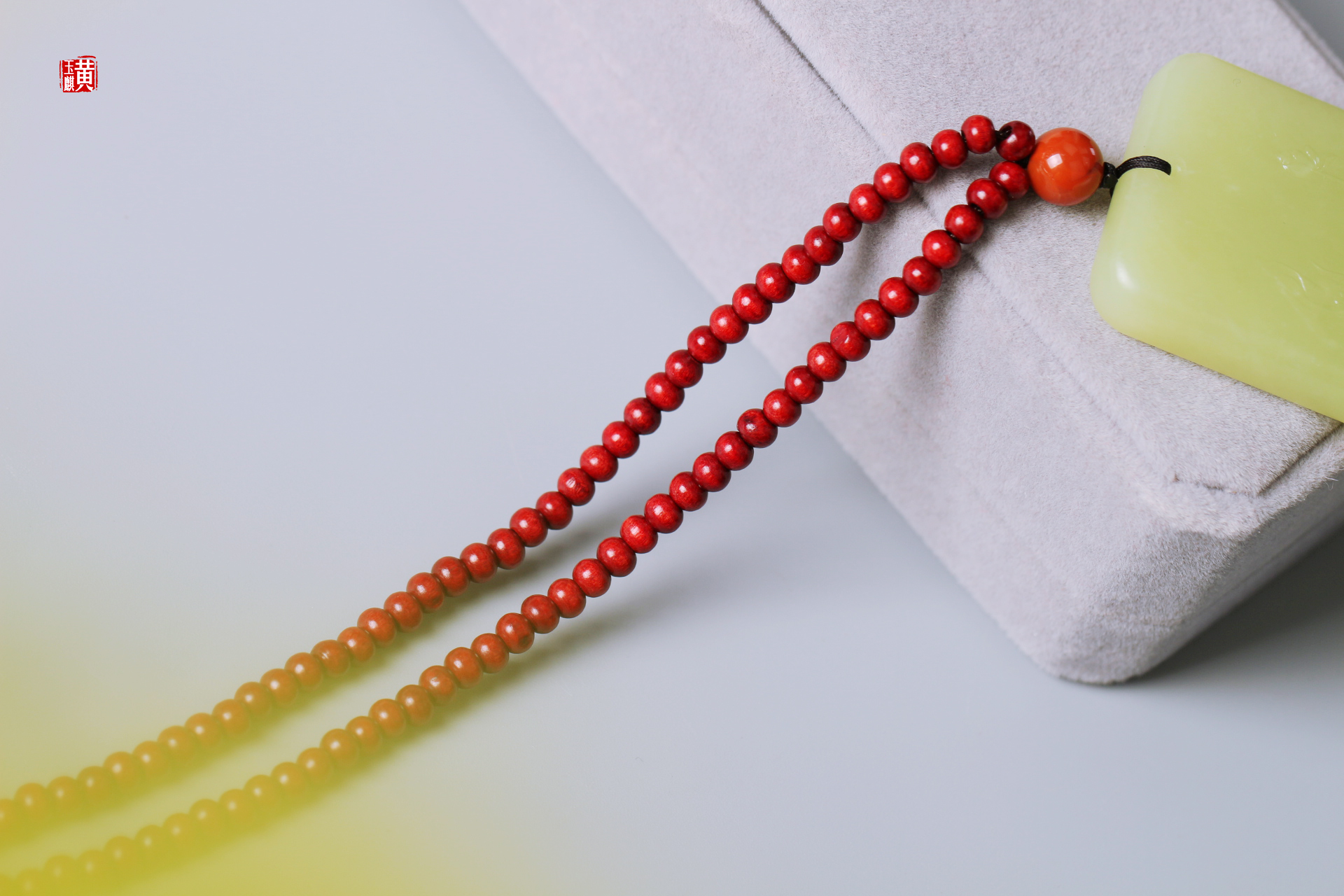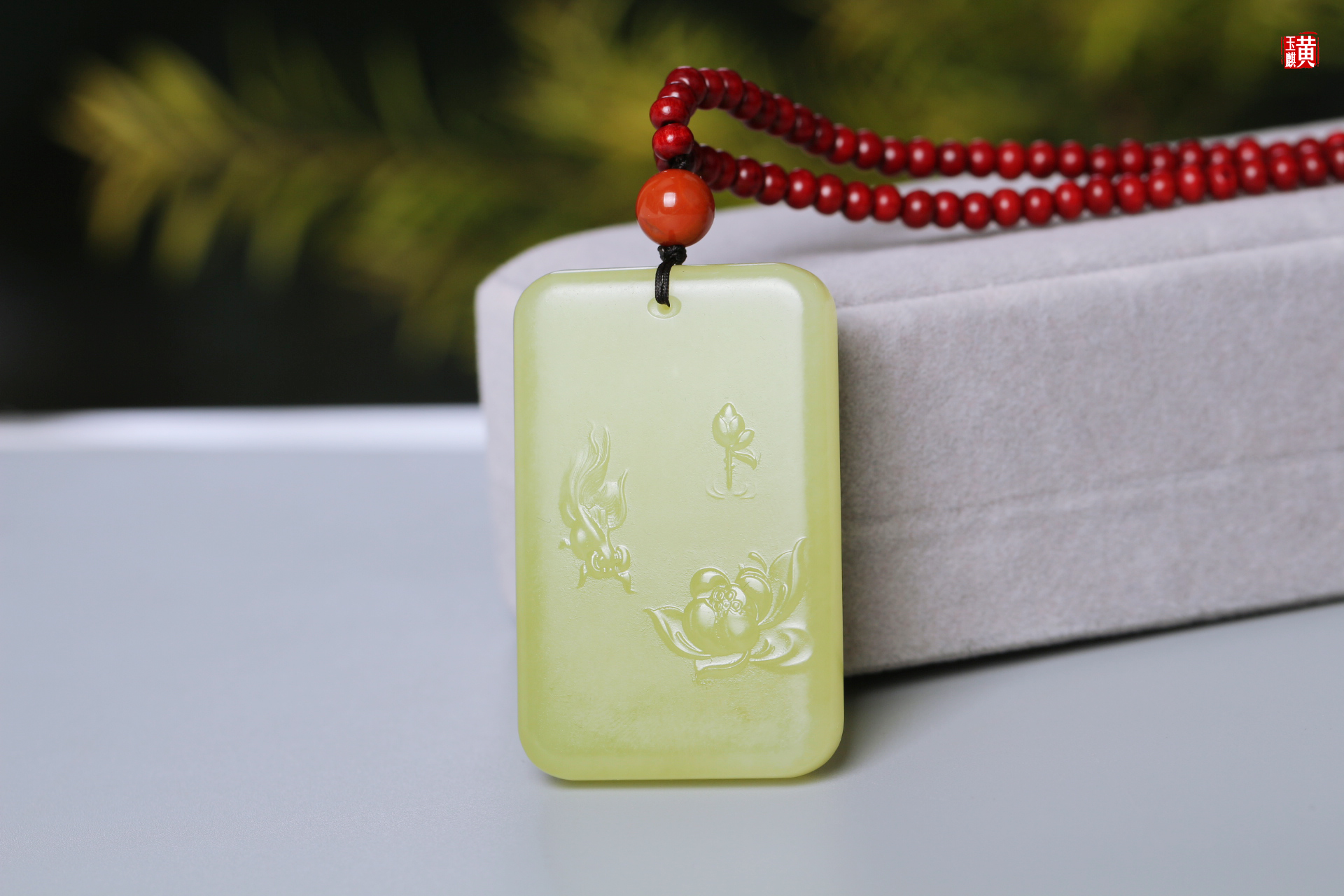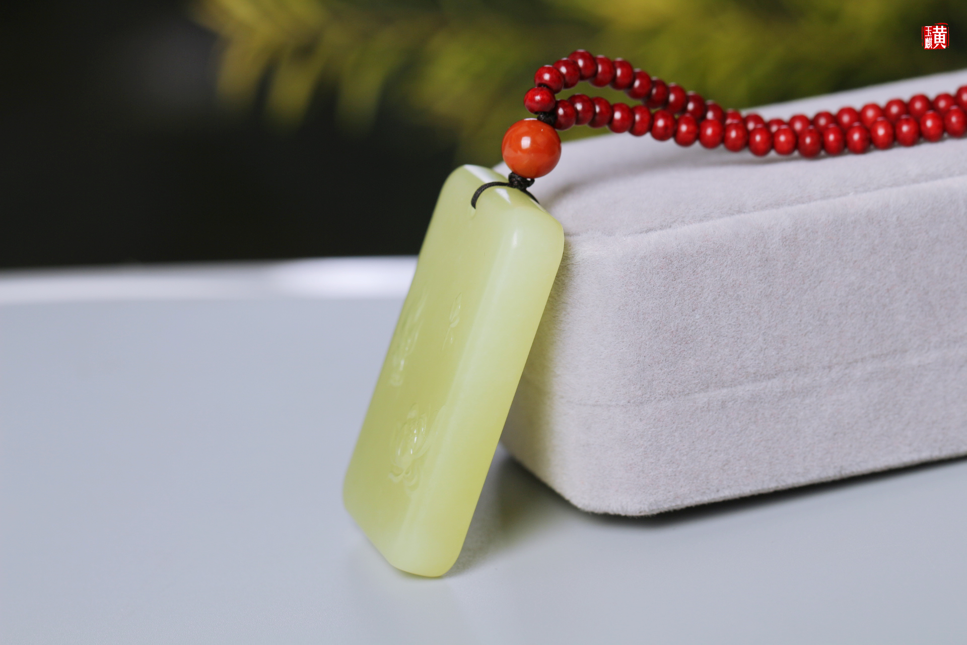 和田玉黄玉【连年有余】吊坠配红檀珠赠证书:GA0211200865 克重:33.60g尺寸:47.9*30.5*9mm