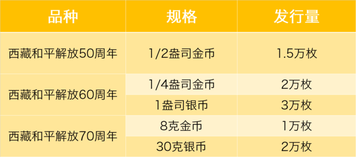 算上今年,央行一共发行过3套西藏和平解放金银币,发行量如下:
