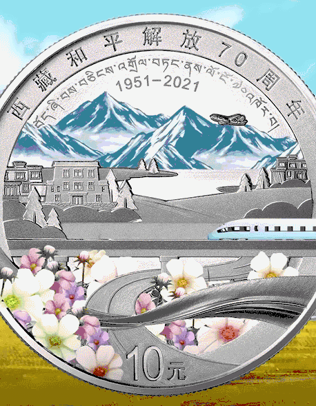币面中间的数字“70”元素来自西藏和平解放70周年庆祝活动徽标。