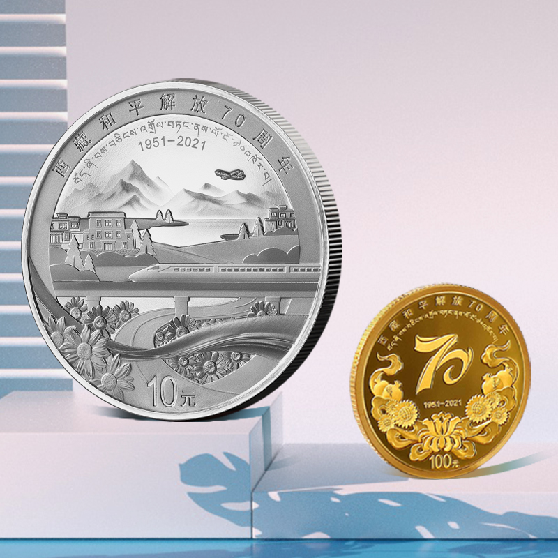 西藏和平解放70周年金银纪念币一套2枚,整体设计以铸牢中华民族共同体意识为主线,突出体现党的光辉照边疆、边疆人民心向党的感恩之情,集中反映西藏各族人民听党话、感党恩、跟党走的决心。