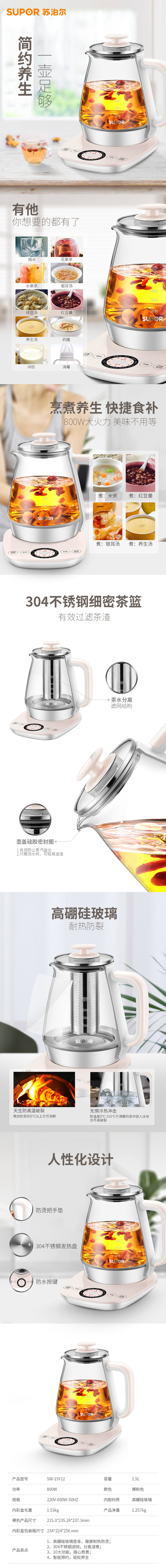 苏泊尔(SUPOR) 养生壶SW-15Y12全自动加厚玻璃煮茶壶多功能家用养生壶电热水壶 1.5L