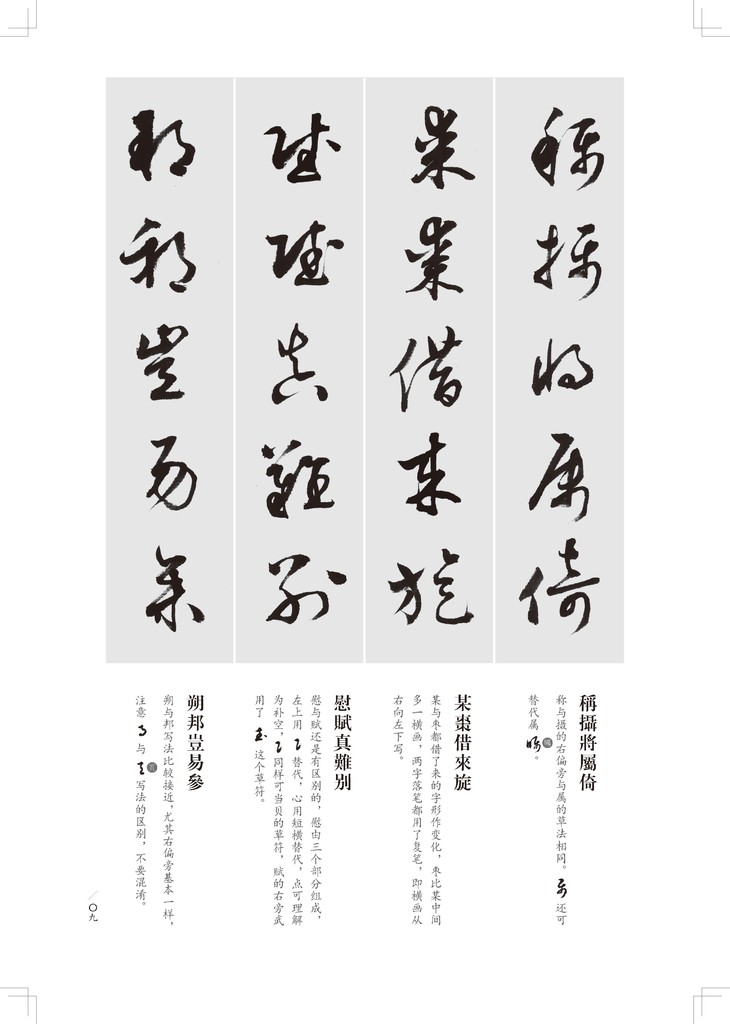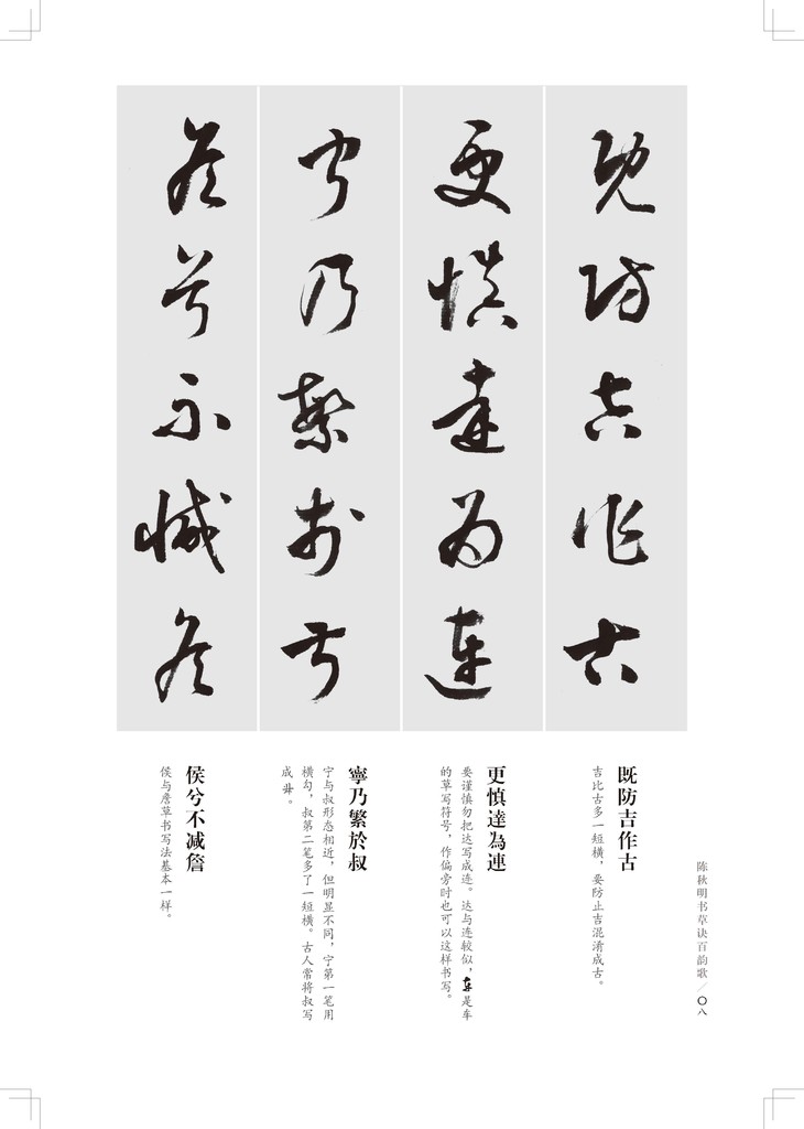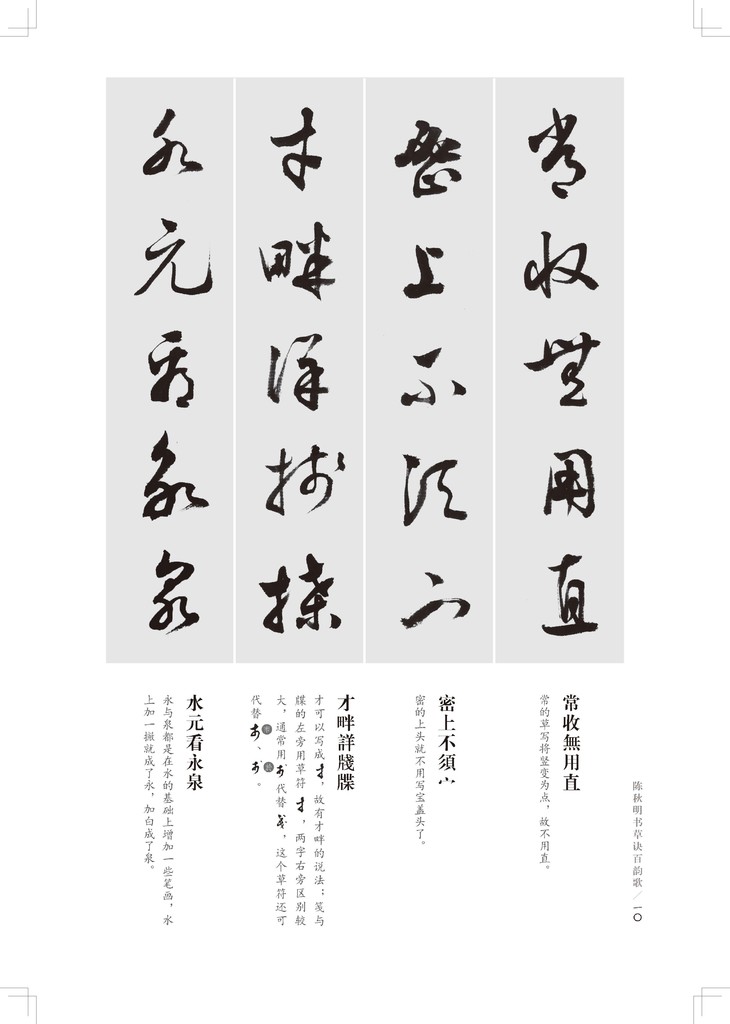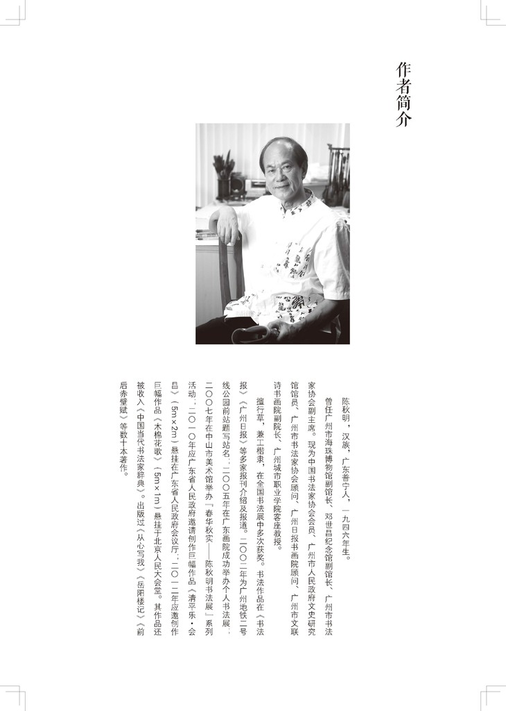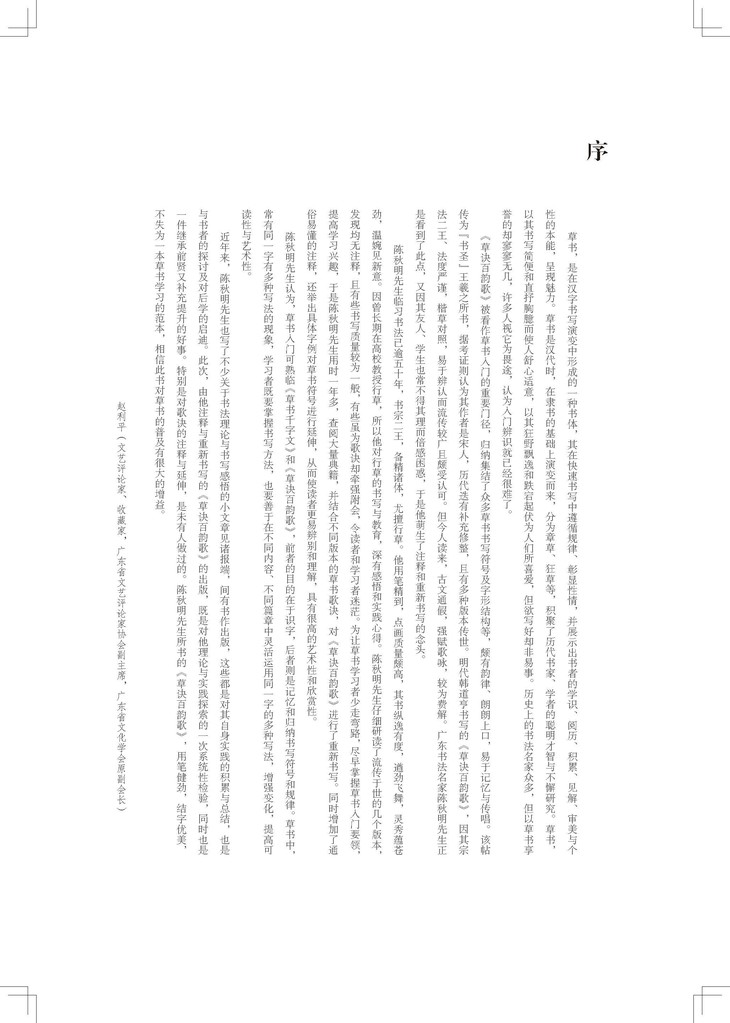 陈秋明先生注释与重新书写的《草诀百韵歌》的出版,既是对他理论与实践探索的一次系统性检验,同时也是一件继承前贤又补充提升的好事。特别是对歌诀的注释与延伸,是未有人做过的。陈秋明先生所书的《草诀百韵歌》,用笔健劲,结字优美,不失为一本草书学习的范本,相信此书对草书的普及有很大的增益。——赵利平(文艺评论家、收藏家,广东省文艺评论家协会副主席,广东省文化学会原副会长)