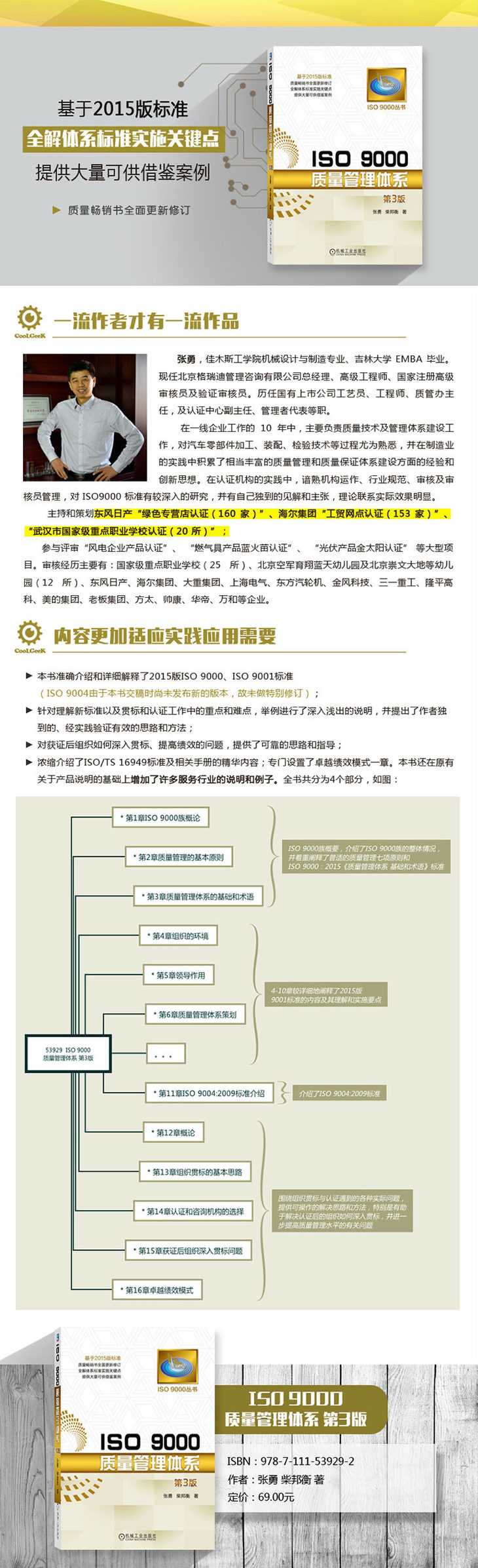 随着世界质量管理理论和实践的发展,ISO 9000族2000版、2008版、2015版已陆续问世。它们是94版标准的升华。从“质量保证体系”到“质量管理体系”,无疑是巨大的提升。我国加入WTO后,要按国际通行的市场规则去参与竞争。为此,如何提高认证证书的“含金量”,是摆在我国各类组织面前的一项艰巨任务。2015版ISO 9000族为我们展示了一条坦途。只有认真地学习、贯彻2015版标准的要求,跟上国际潮流,才是明智的选择。 如何正确理解和领会进而贯彻、实施2015版ISO 9000族的要求,对绝大多数组织来说仍是一个难点。作者在总结多年从事质量工作,特别是ISO 9000的培训、咨询、认证的长期实践经验和研究的基础上,曾撰写了《ISO 9000质量保证体系》一书。该书深受读者的好评,出版社多次重印。关键在于该书具有较高的实用价值。而《ISO 9000质量管理体系》一书,可以看作是《ISO 9000质量保证体系》的新版。《ISO 9000质量保证体系》是按照94版ISO 9000系列标准撰写的,《ISO 9000质量管理体系》(第3版)则是按照2015版ISO 9000族撰写的。两书具有共同的特点和风格。 本书除准确地解释ISO 9000族2015版的有关要求之外,着重介绍了组织(企业)贯彻2015版ISO 9000标准的思路和方法,并对重点、难点问题乃至误区,给予明示。本书坚持深入浅出,既有作者源于实践的独到见解,又吸收国内、外诸多名家见解的精华。本书力求做到:概念界定准确、思路清晰、重点突出、方法实用,密切结合我国各类组织的实际。作者诚望这本书能对组织在建立和完善质量管理体系乃至获取并保持质量体系认证证书方面起到推动作用,使之少走或不走弯路。 全书共分3篇16章。第1篇ISO 9000族概要,介绍了ISO 9000族的整体情况,并着重阐释了普适的质量管理七项原则和ISO 9000:2015《质量管理体系 基础和术语》标准。第2篇介绍了ISO 质量管理体系标准的要求,第4~第10章较详细地阐释了2015版9001标准的内容及其理解和实施要点;第11章概要介绍了ISO 9004:2009标准。第3篇围绕组织贯标与认证遇到的各种实际问题,提供可操作的解决思路和方法,特别是有助于解决认证后的组织如何深入贯标,并进一步提高质量管理水平的有关问题。 应该指出,在顾客要求趋向多样化、个性化、更新、变化更快的今天,组织仅满足于ISO 9001的质量管理体系已远远不够了,凭此是难以保证组织在市场竞争中取得优胜的。因此,组织应逐步按照ISO 9004和卓越绩效模式来完善自己的管理体系,从而取得持续的成功。 本书对于各类组织在贯彻新标准中是一本极为实用的咨询大全。不仅对组织的质量管理人员,而且对于质量管理体系的培训、咨询、审核人员及有关专业的大专院校学生均颇有参考价值。 由于本人忙于其他工作,这次再版修订由张勇先生主持,特致谢意。 本书不足之处,敬希广大读者指正,不胜感激。 柴邦衡