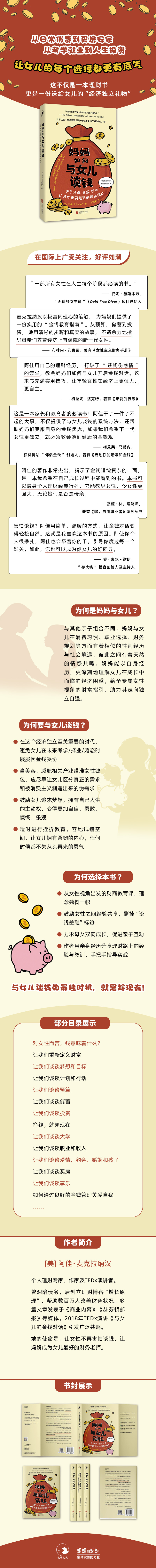1. 本书广受海外理财专家赞誉。由资深理财专家阿佳・麦克拉纳汉倾心打造,其丰富的理财经验得到了妈妈们的信赖。她让女性不再害怕谈钱,帮助妈妈成为女儿最好的财务老师。为妈妈与女儿的财商成长之旅保驾护航。