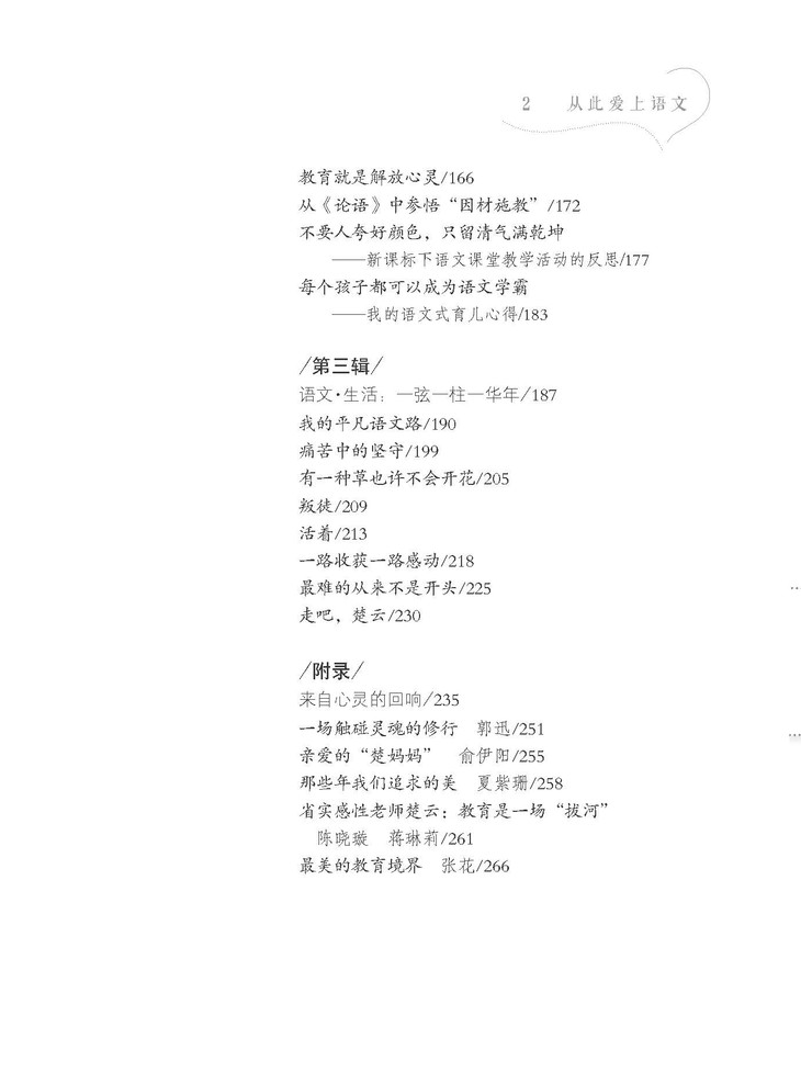 广东省重点中学语文名师楚云全新力作。以语文的名义,以阅读和写作的方式培养鲜活的生命和有趣的灵魂,与学生共生共长。本书分为四个部分,分别是: