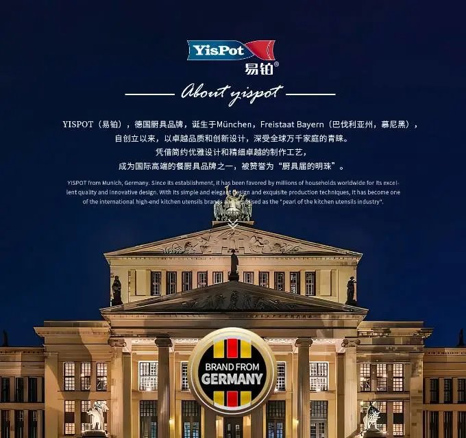YISPOT易铂,德国厨具品牌,诞生于München,Freistaat Bayern(巴伐利亚州,慕尼黑),自创立以来,YISPOT以卓越品质和创新设计,深受全球万千家庭的青睐。YISPOT秉持生活审美、开放创新和精致生活的理念,致力为每个家庭打造出一个理想舒适的厨房生活空间。“品质餐厨具,就选易铂”。
