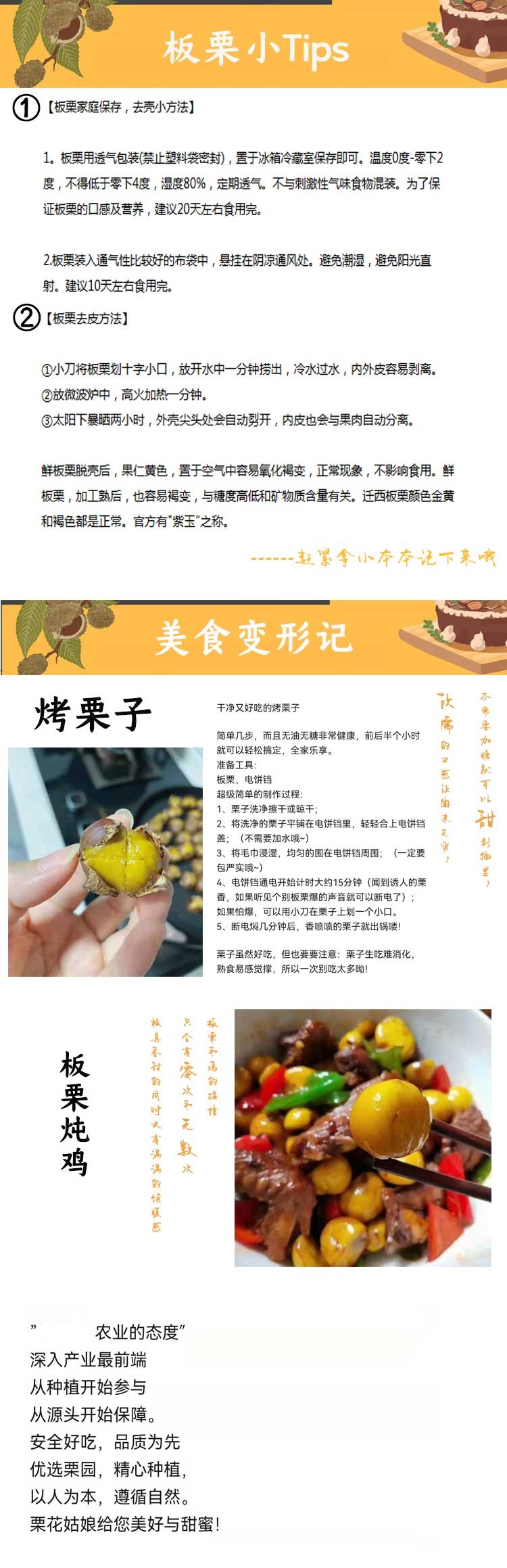 品名:晚熟迁西老树板栗 规格1:2斤大果彩箱装(1斤约50粒左右;以重量为准) 规格2:3斤大果彩箱装(1斤约50粒左右;以重量为准);拍几份发几个包裹,不一定能同时到达,请耐心等待; 发货地/产地:迁西 包装方式:彩箱装+网袋 物流信息:默认中通快递,不支持指定快递 发货区域:新疆、西藏、青海不发;海南+5元; 物流详情:周六、周日及节假日除外,正常48小时内发货,到货时间约为2~5天,请耐心等待 售后说明:收到货后有质量问题,在24小时内都可以拍照(坏果+快递单面箱子一起拍)上传,申请按坏果比例理赔或联系客服,生鲜性质特殊,因地址错误,手机号联系不上,拒收等造成的损失无法售后,请理解; |