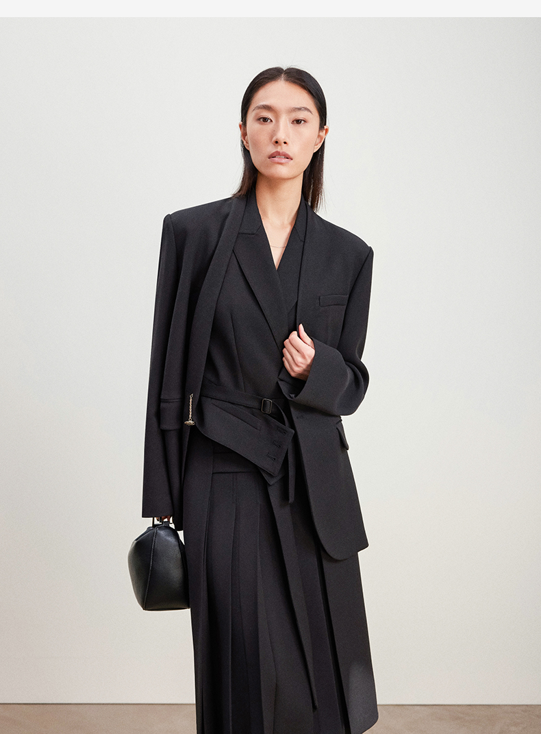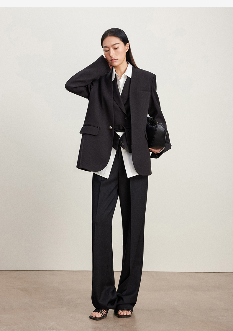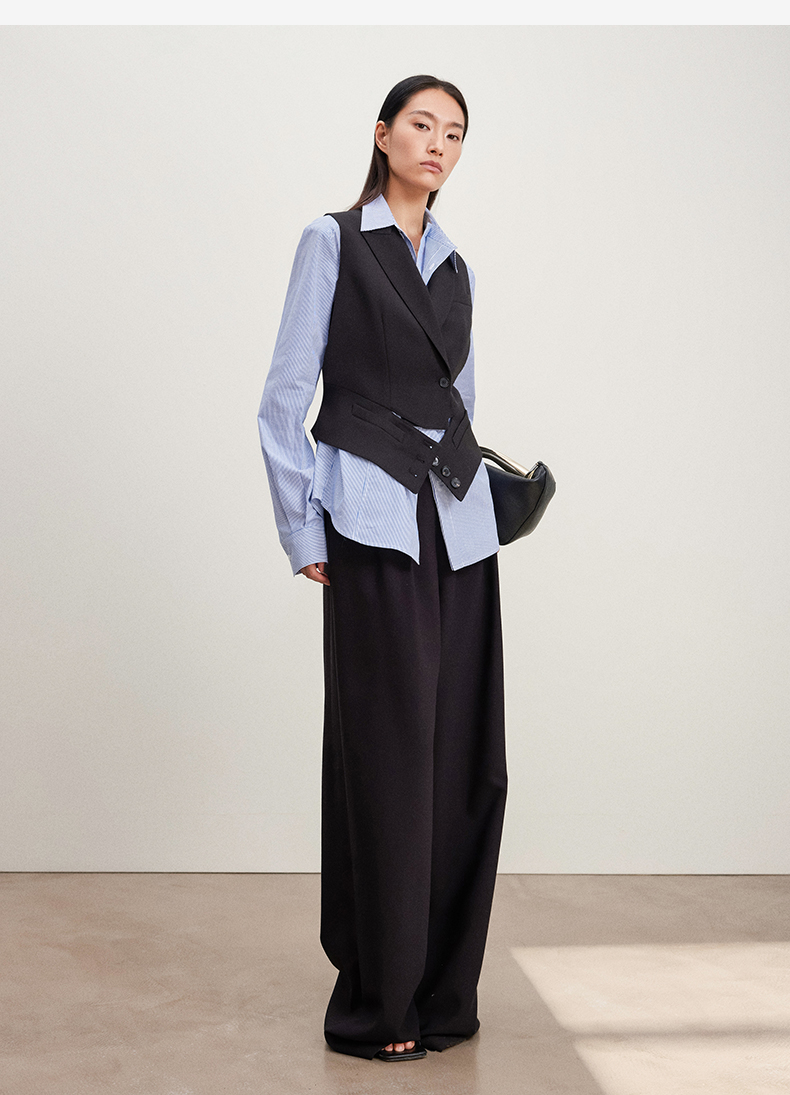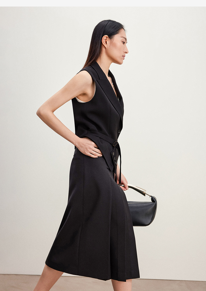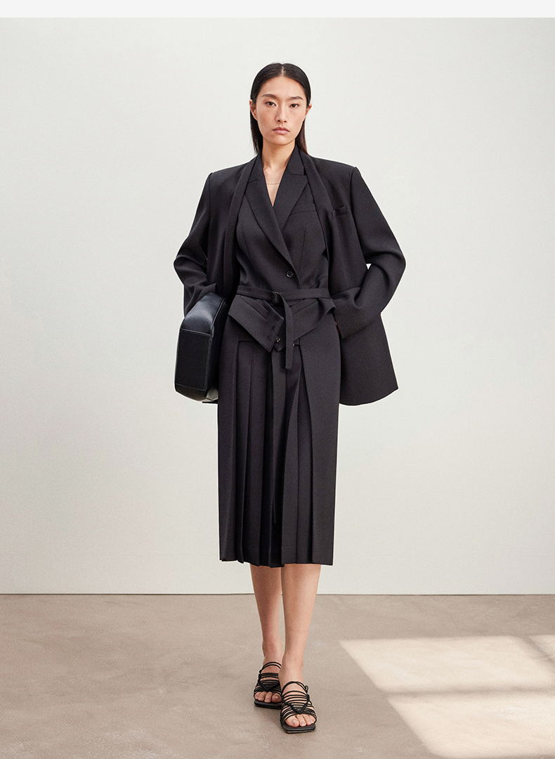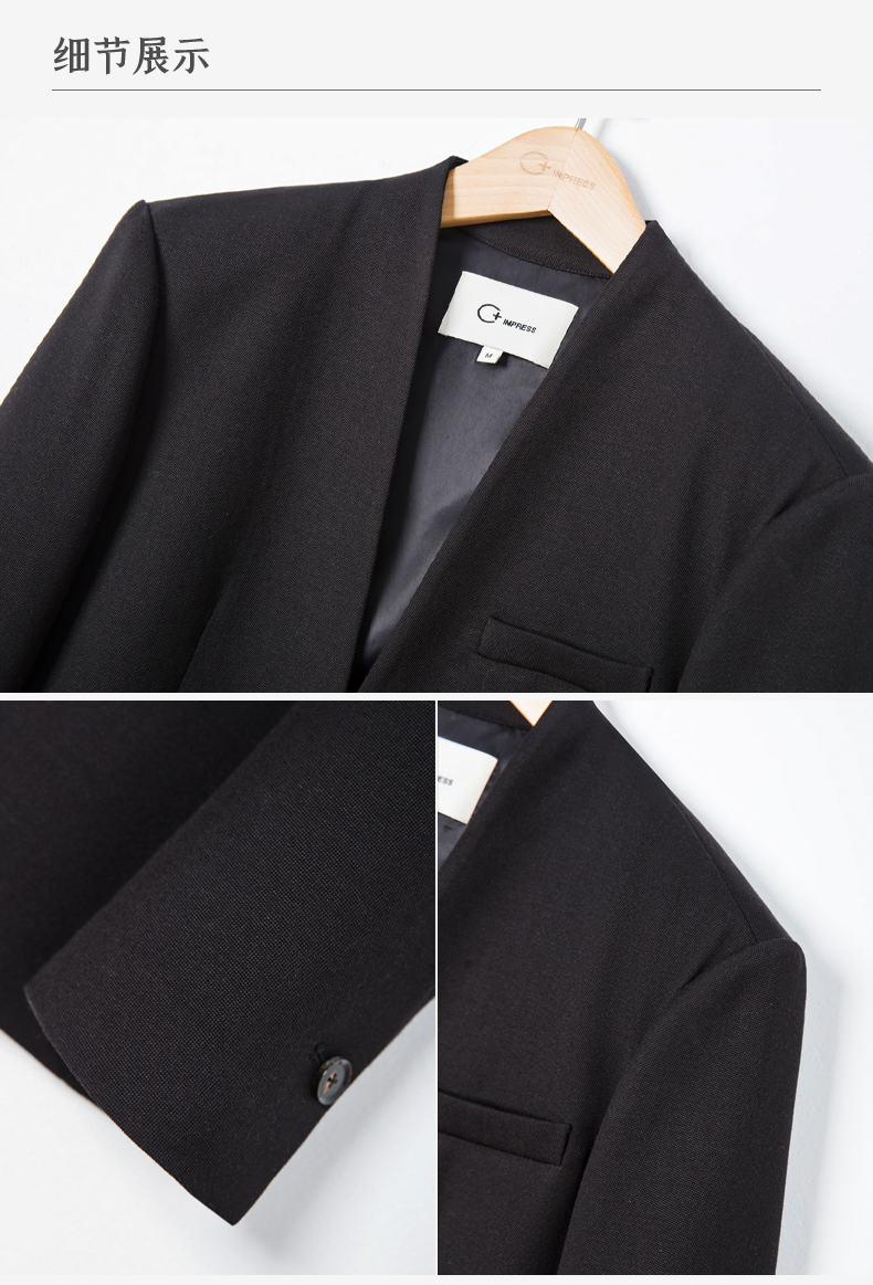西嘉C+IMPRESS/西嘉羊毛后开衩无领西装外套女无袖马甲压褶半身裙套装WT2401009