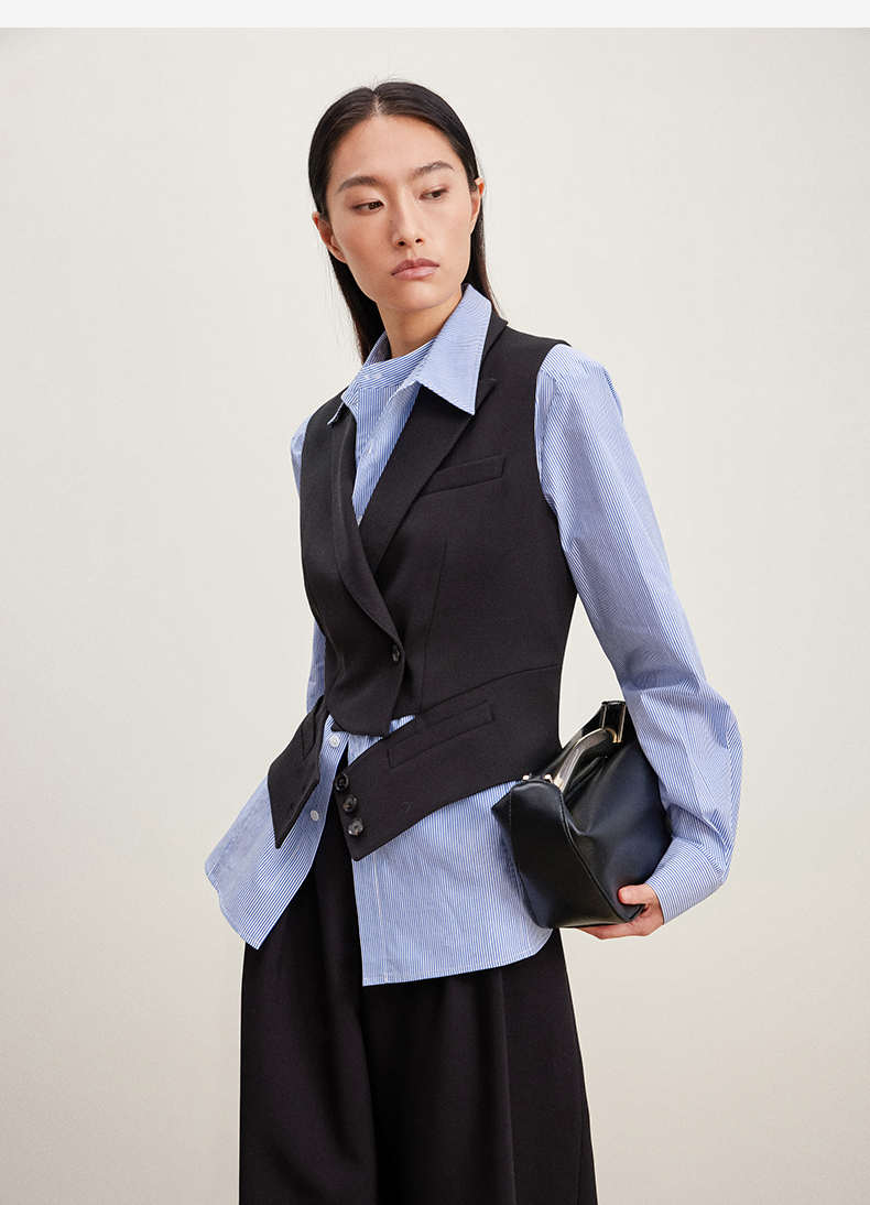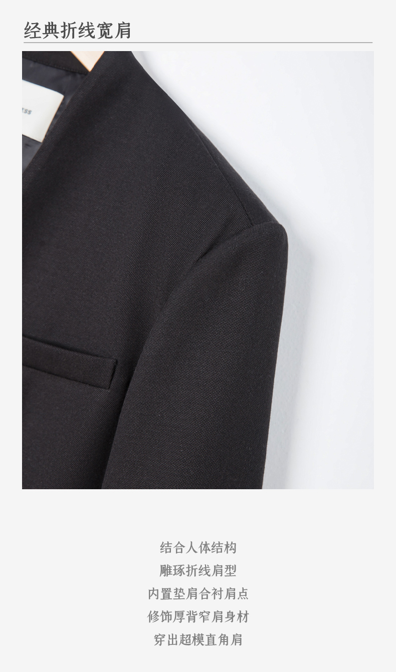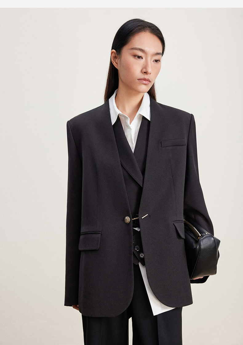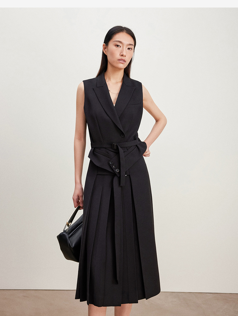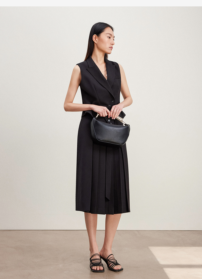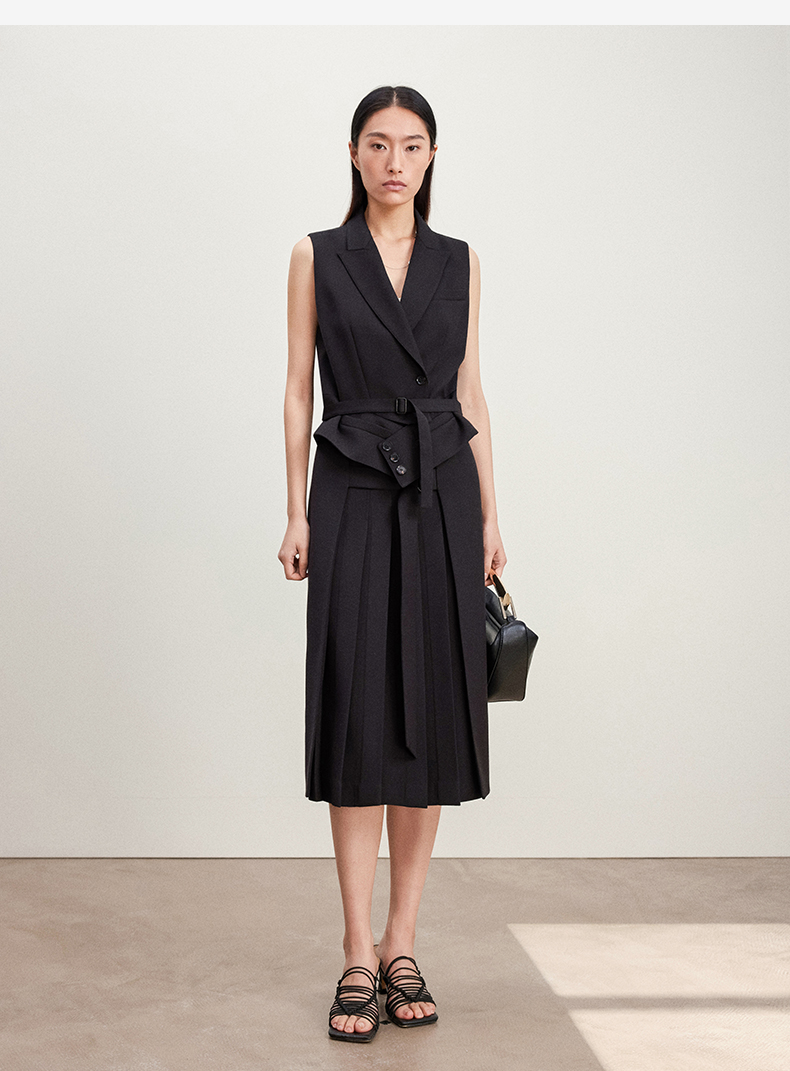 西嘉C+IMPRESS/西嘉羊毛后开衩无领西装外套女无袖马甲压褶半身裙套装WT2401009