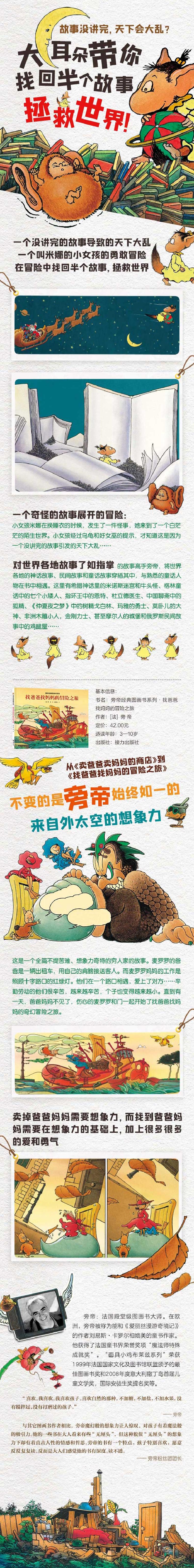 ★《大耳朵和半个故事》讲述了一个没讲完的故事导致的天下大乱,一个叫米娜的小女孩的勇敢冒险。在冒险中找回半个故事,拯救世界!★对世界各地故事了如指掌的故事高手旁帝,将世界各地的神话故事、民间故事和童话故事穿插在《大耳朵和半个故事》里,与熟悉的童话人物在书中相遇