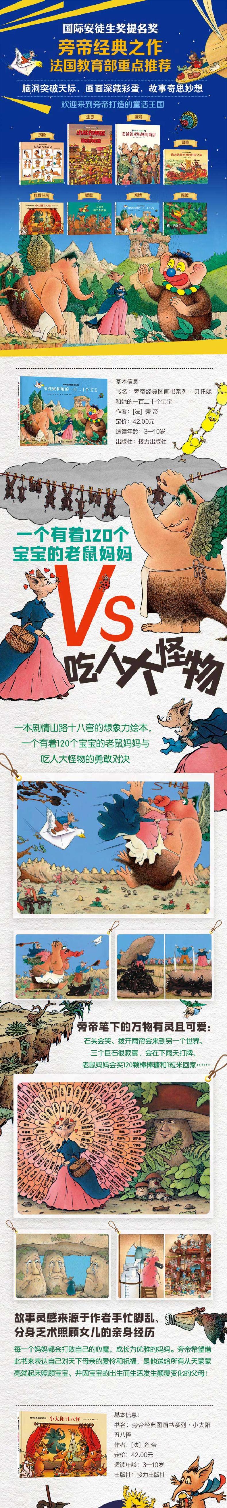 ★《贝托妮和她的一百二十个宝宝》是一本剧情山路十八弯的想象力绘本,旁帝笔下的万物有灵且可爱:石头会哭、拨开雨帘会来到另一个世界、三个巨石很寂寞,会在下雨天打牌、老鼠妈妈会买120颗棒棒糖和1粒米回家……